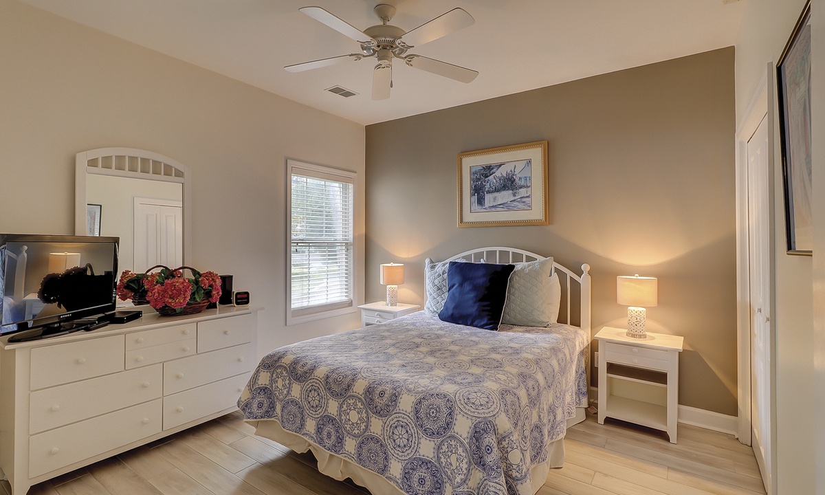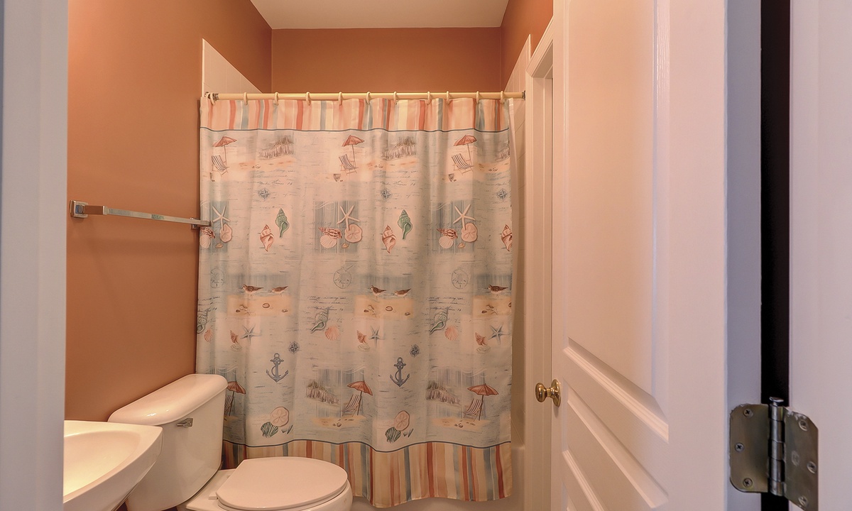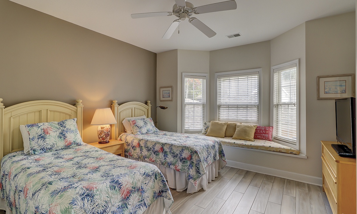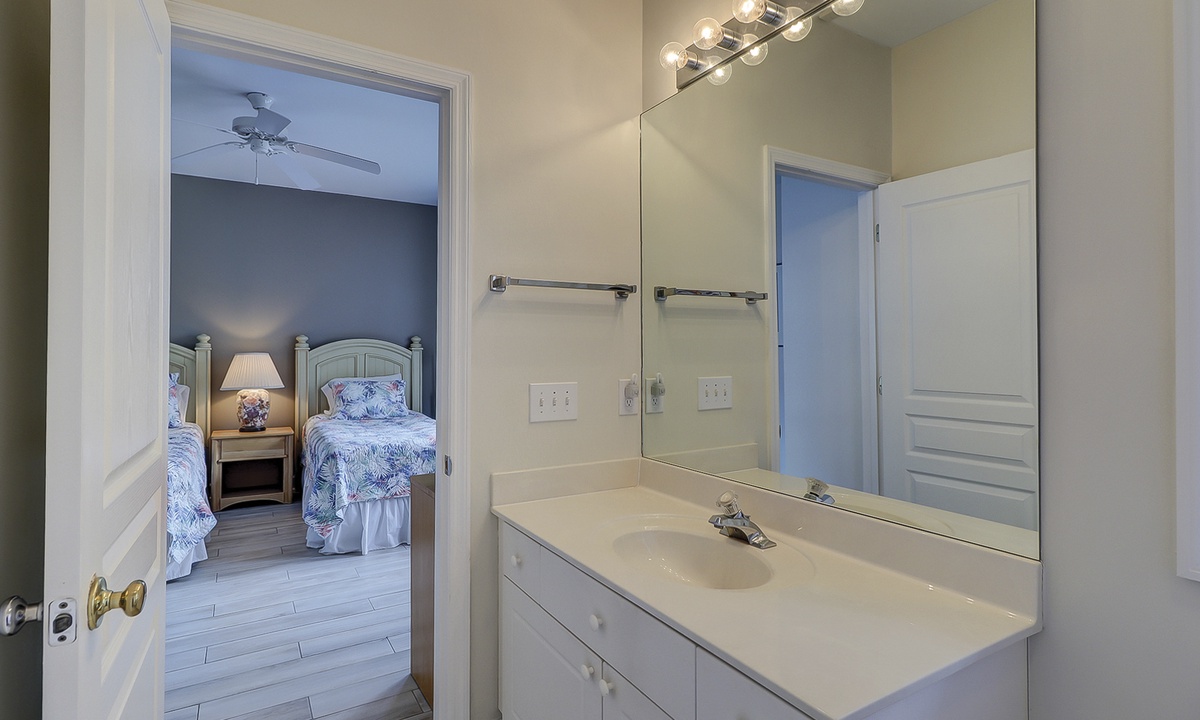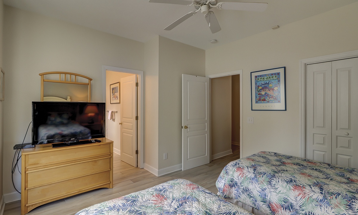 On the other side of the condo, you'll find two guest rooms- one with a queen bed, and one with two twin beds. Both bedrooms have flat-screen TVs and private bathrooms with tub/shower combinations.