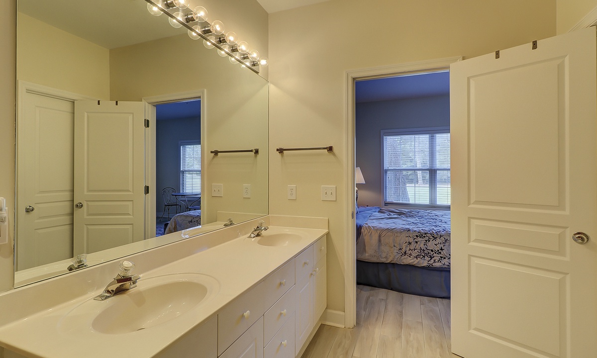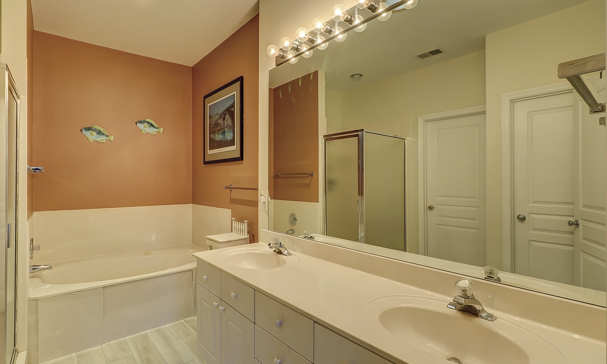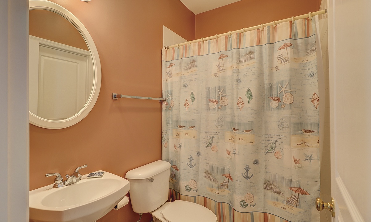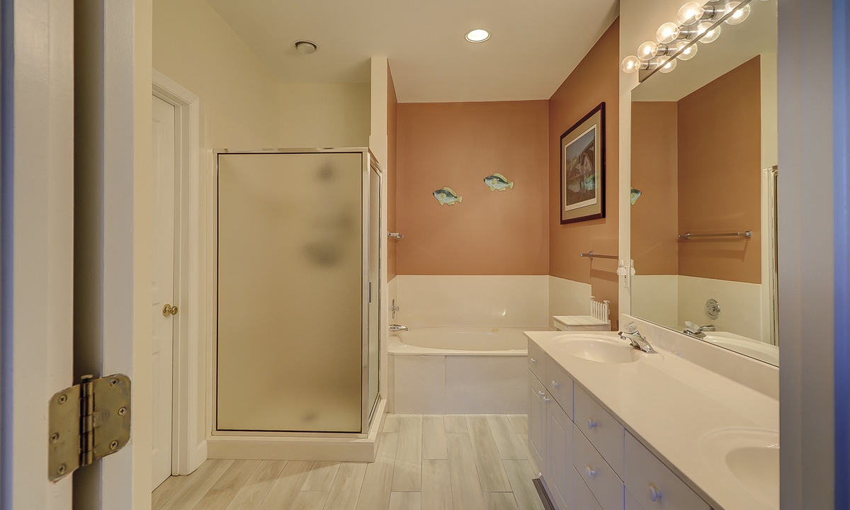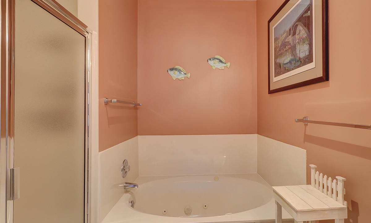 On the other side of the condo, you'll find two guest rooms- one with a queen bed, and one with two twin beds. Both bedrooms have flat-screen TVs and private bathrooms with tub/shower combinations.
