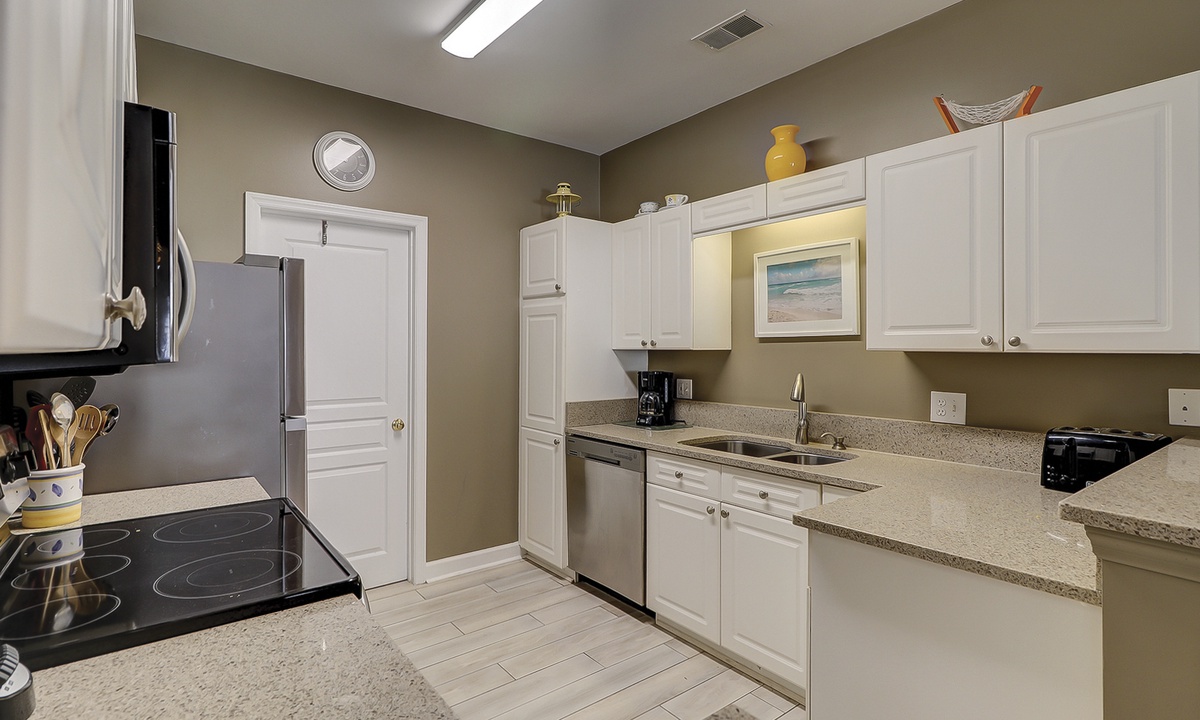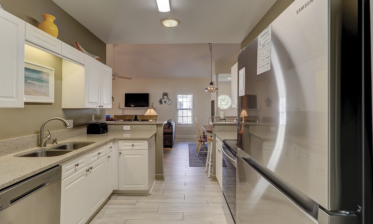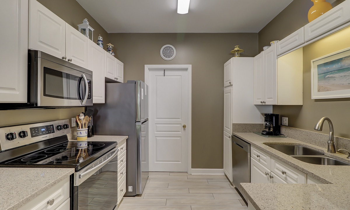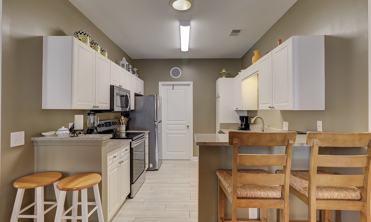 The condo features tiled flooring throughout, and the living area is comfortably furnished with a sleeper sofa, love seat and large flat-screen TV. A screened-in porch can be accessed from the living area and has an outdoor dining set.