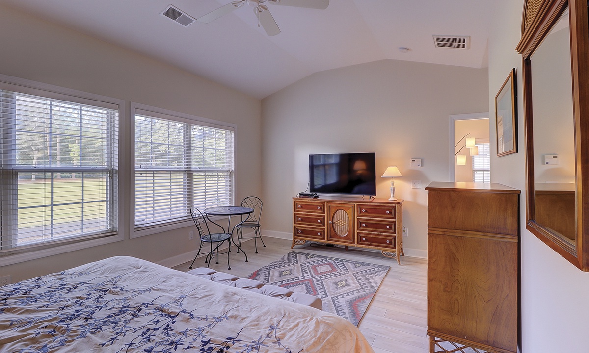 The main bedroom, with sunny golf course views, has a king bed, flat-screen TV and a private ensuite with a soaking tub and a separate walk-in shower.