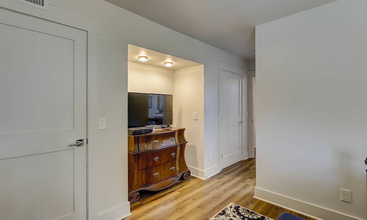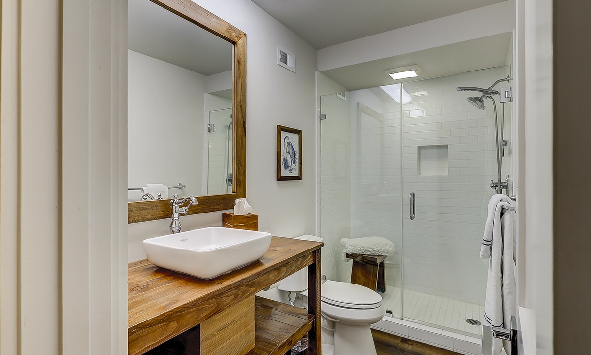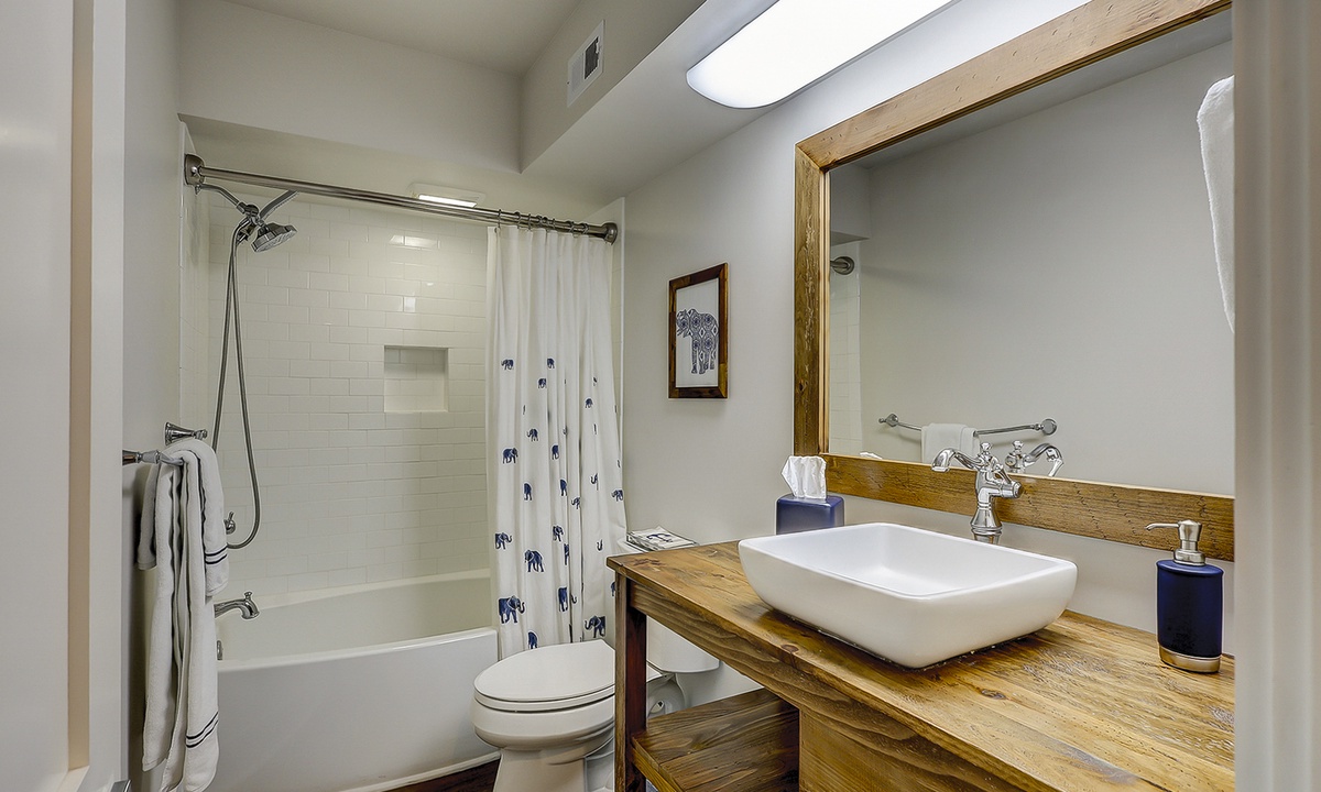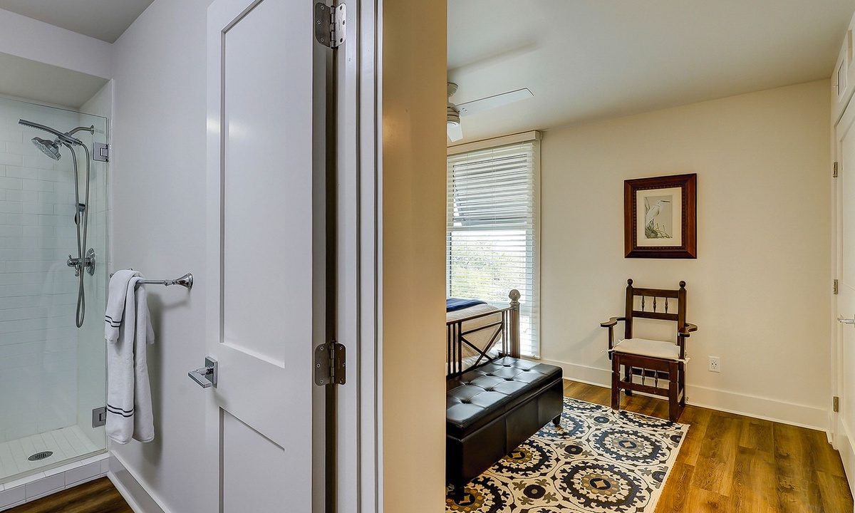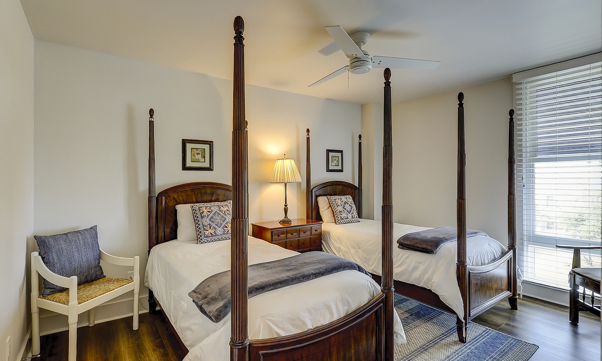 The main bedroom features a king size bed, Smart TV and a private bathroom with a large, tiled walk-in shower. The guest bedroom has two twin beds and access to a hall bathroom with a tub/shower combination.