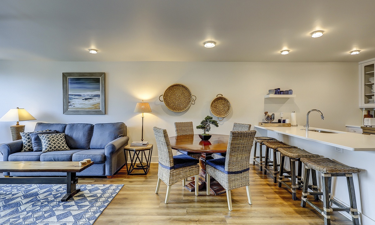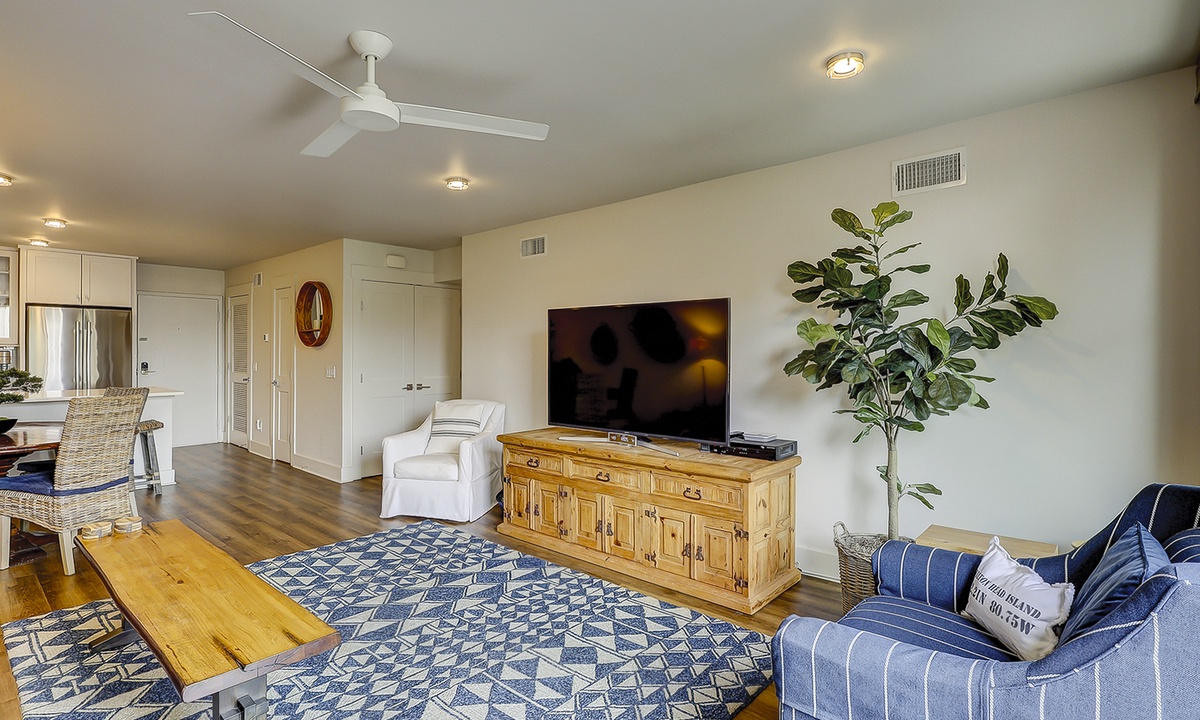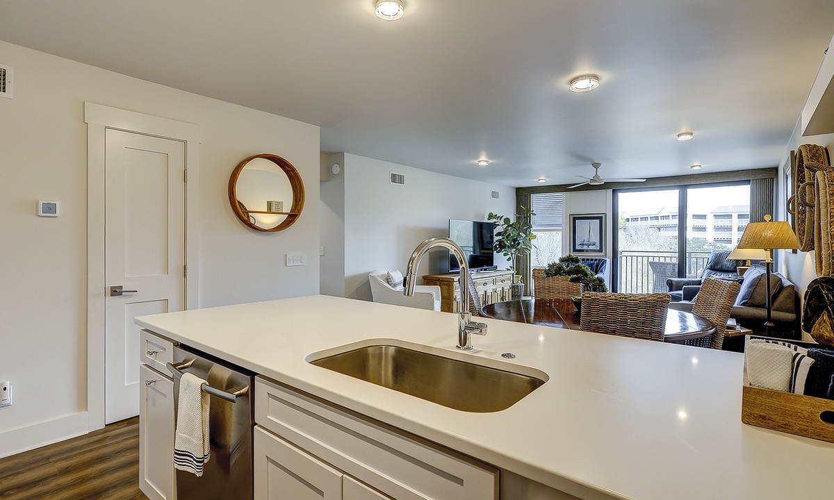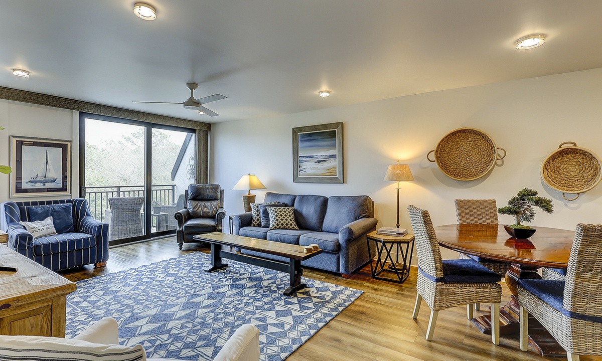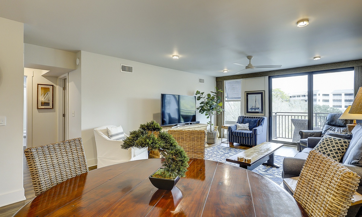 The open-concept floor plan features soothing coastal colors. The living area has a Smart TV and access to the private balcony overlooking Harbour Town and the sound beyond. The dining area seats four comfortably with additional seating at the expansive kitchen bar. The fully remodeled kitchen features stainless appliances, custom cabinets and both a Keurig-style and drip coffee maker, as well as all you'll need to prepare a meal for your family.