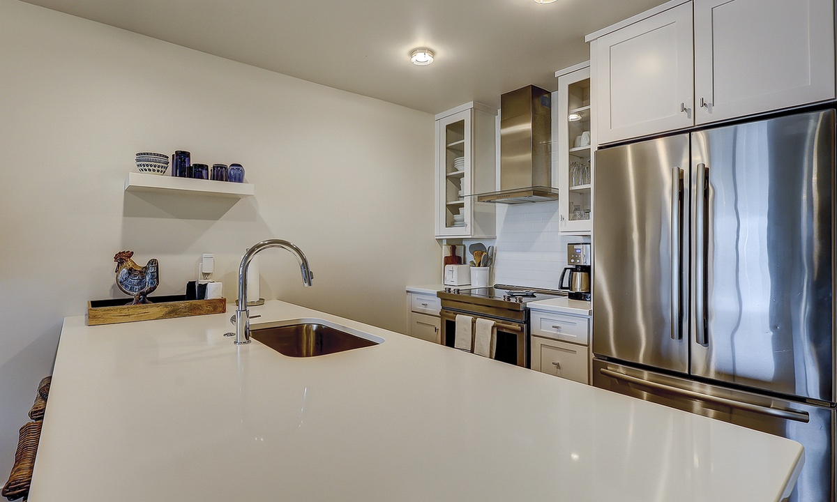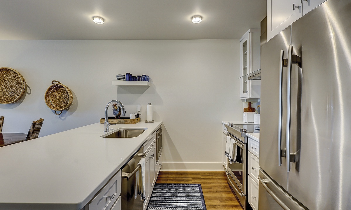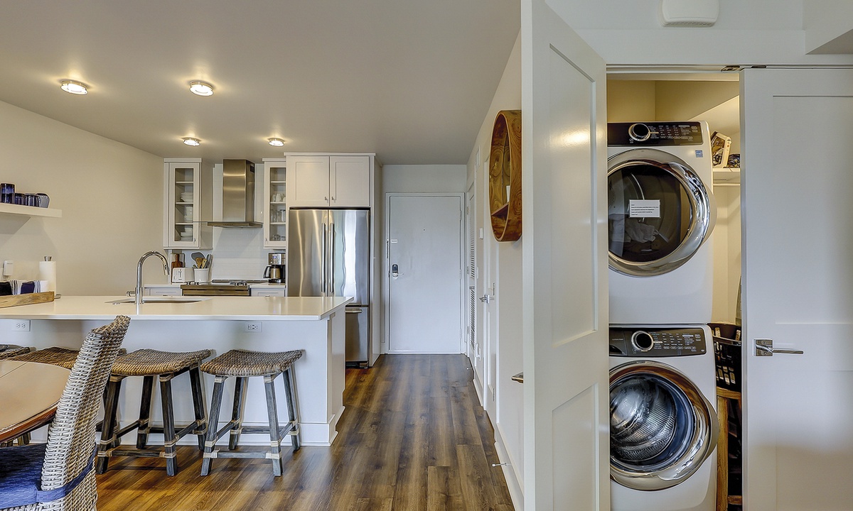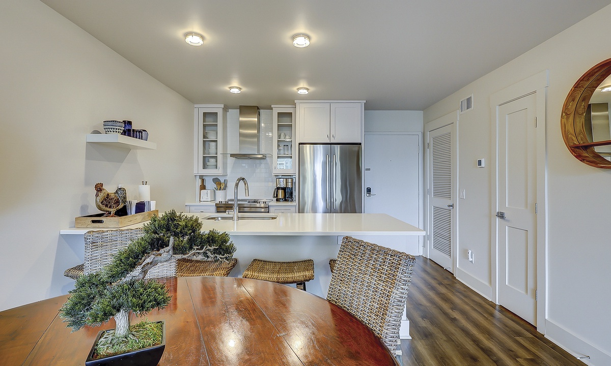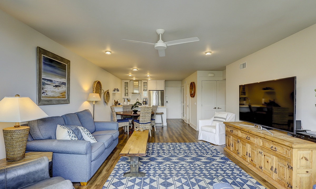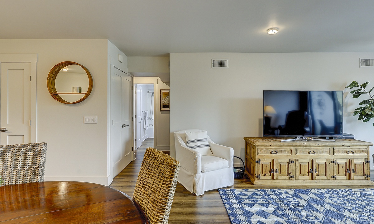 The open-concept floor plan features soothing coastal colors. The living area has a Smart TV and access to the private balcony overlooking Harbour Town and the sound beyond. The dining area seats four comfortably with additional seating at the expansive kitchen bar. The fully remodeled kitchen features stainless appliances, custom cabinets and both a Keurig-style and drip coffee maker, as well as all you'll need to prepare a meal for your family.
