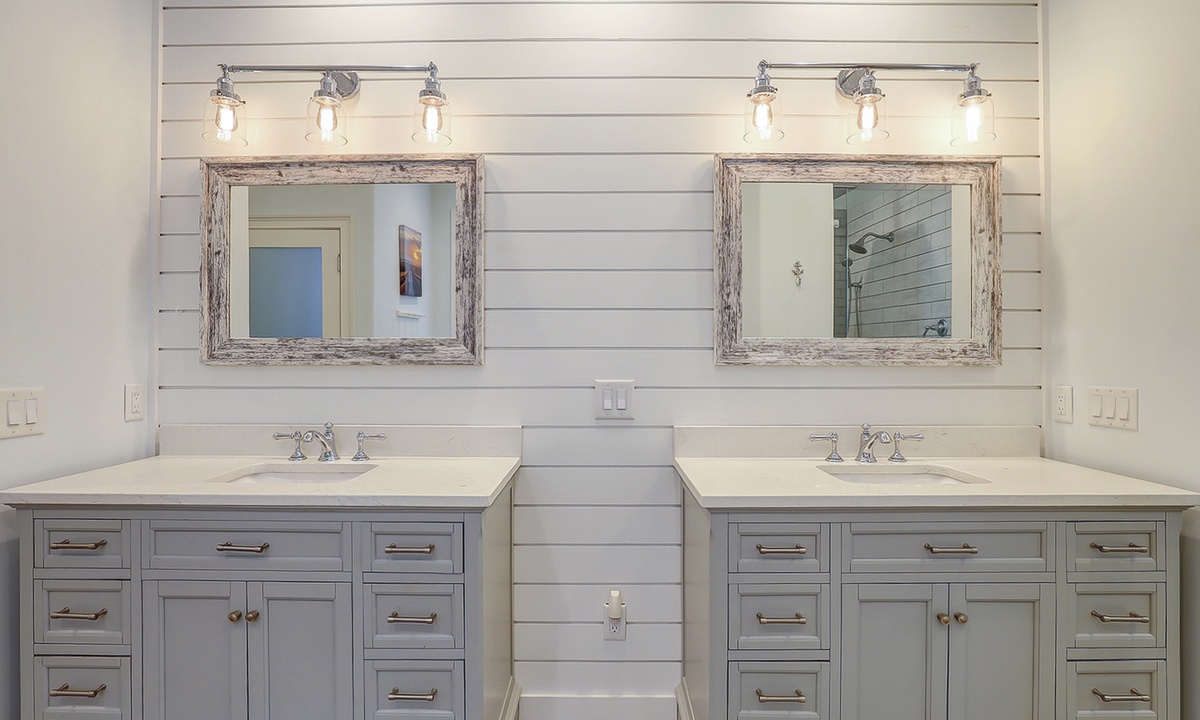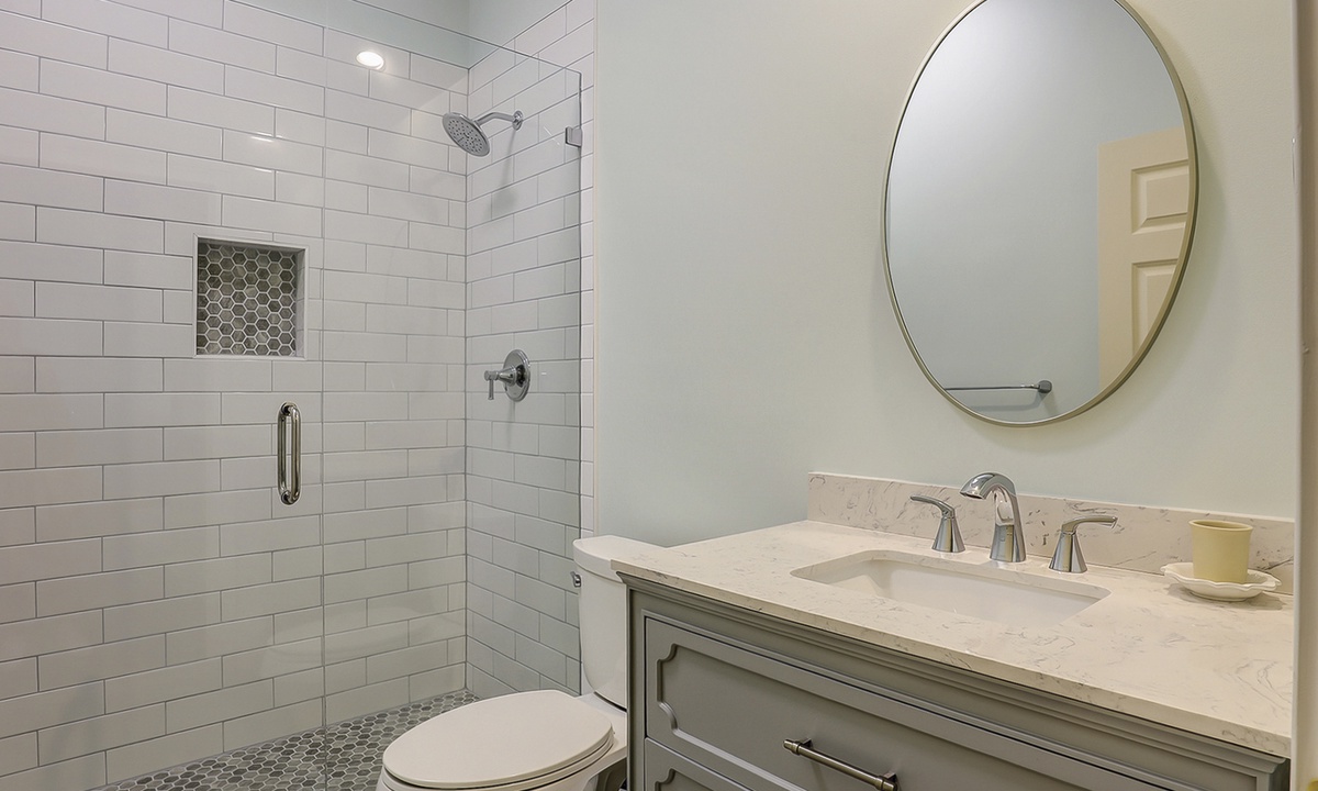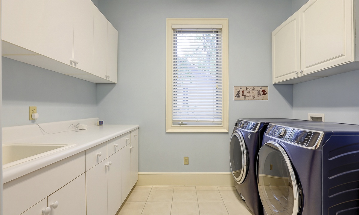 Upstairs, there are three additional bedrooms along with the secondary suite. The secondary suite is just as expansive as the first and also houses a king-size bed with a sink, that can be used as a wet bar, a TV, and its own bathroom with a walk-in shower. The fifth bedroom has a queen-size bed, the sixth also has a queen-size bed, and the seventh has two twin beds. Each bedroom has its own personal bathroom and a TV for entertainment. There is a laundry room with a full-size washer and dryer for added convenience.