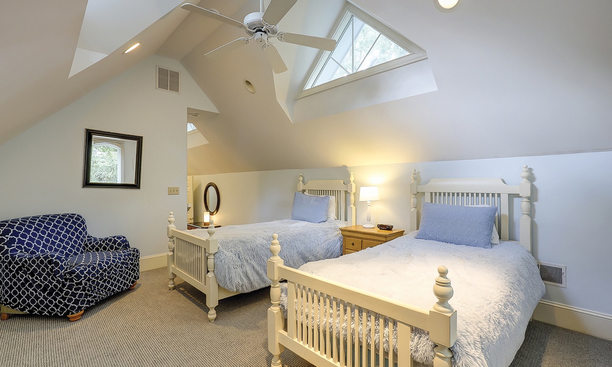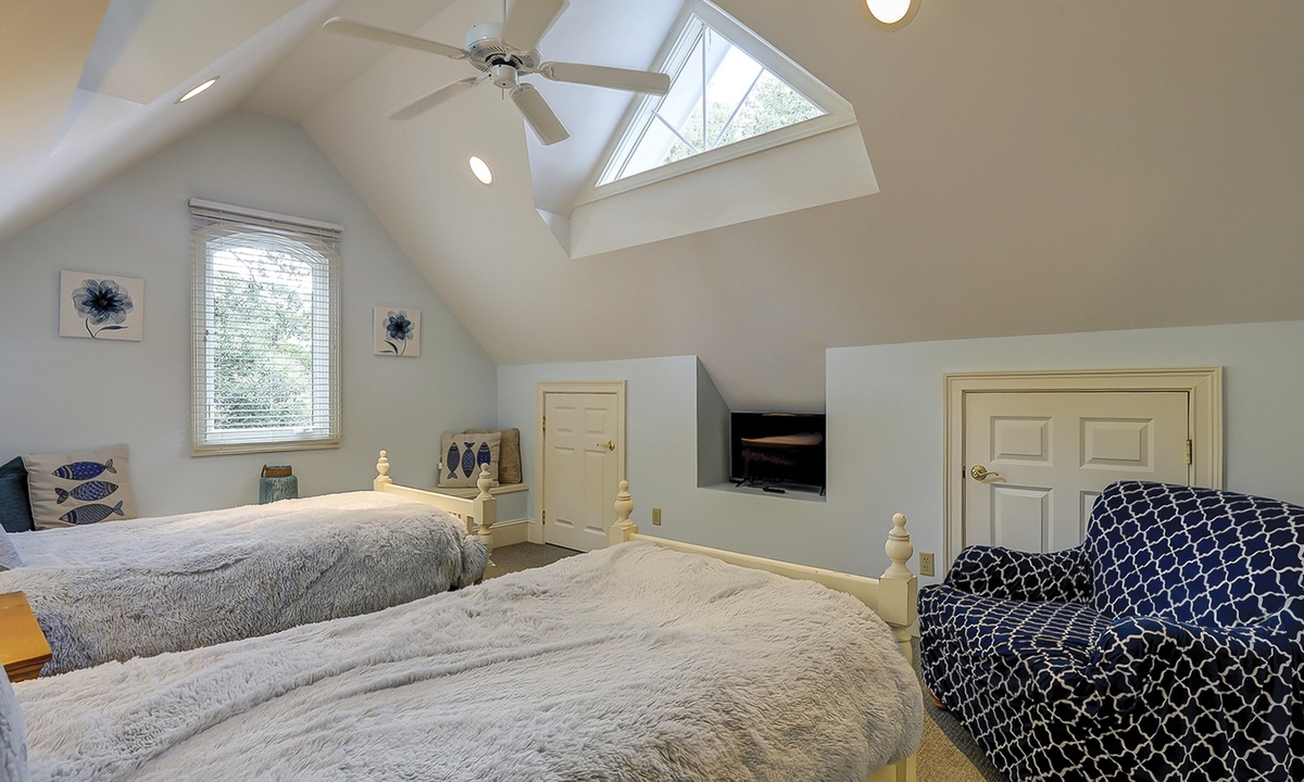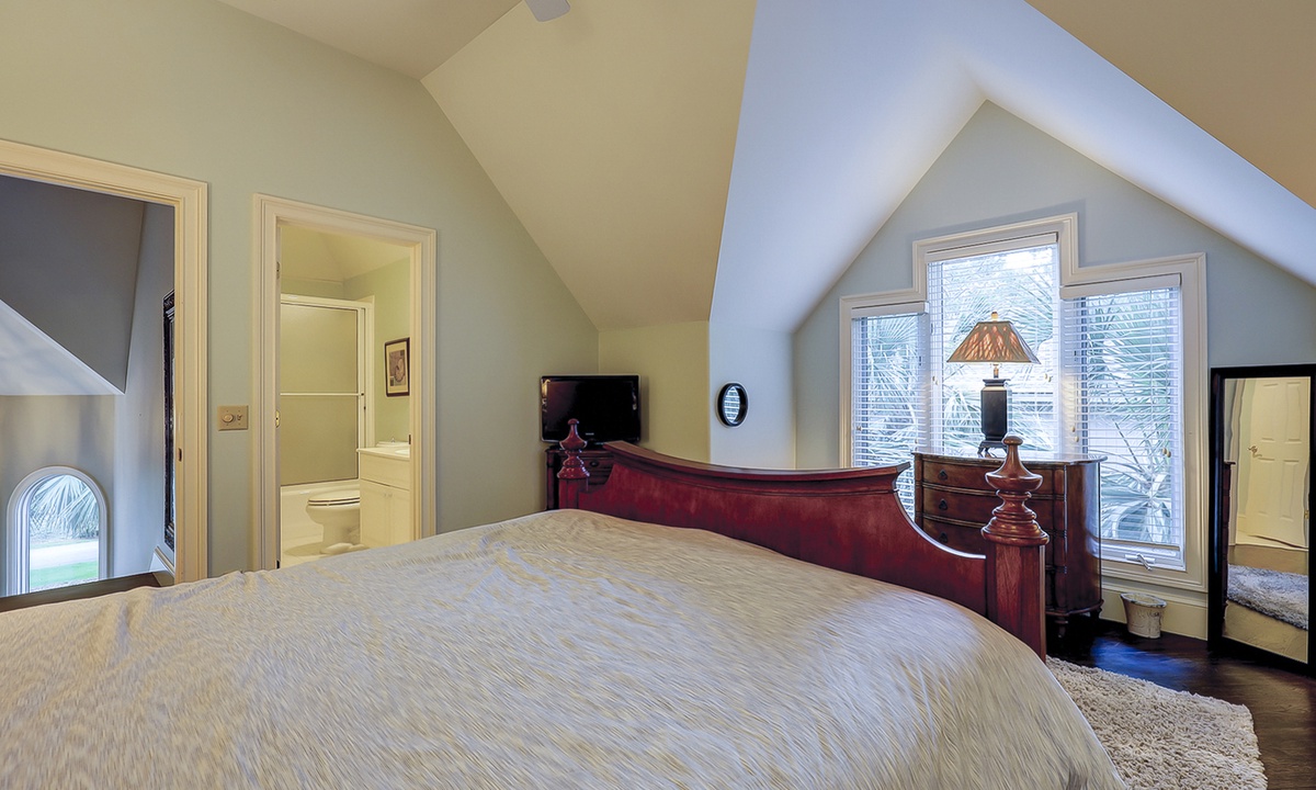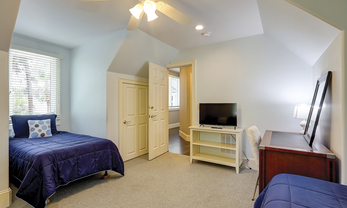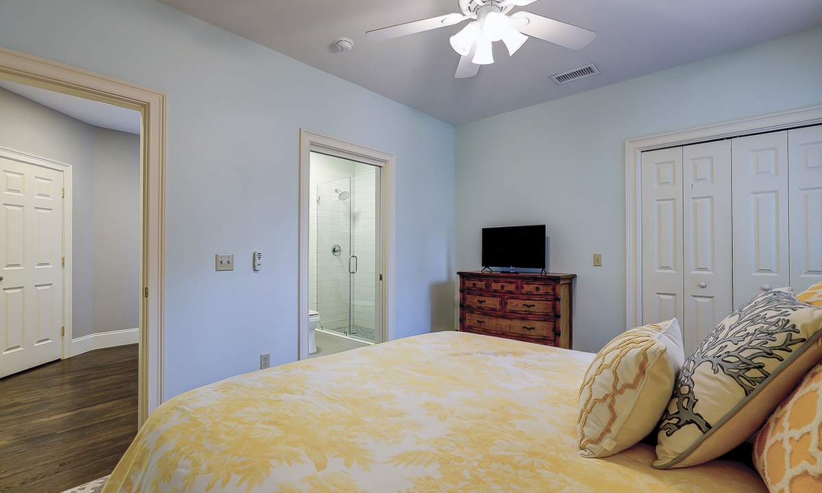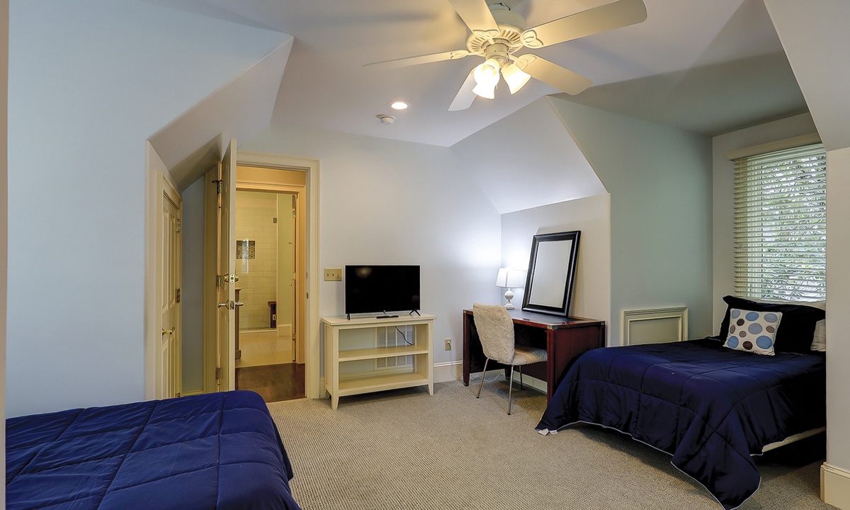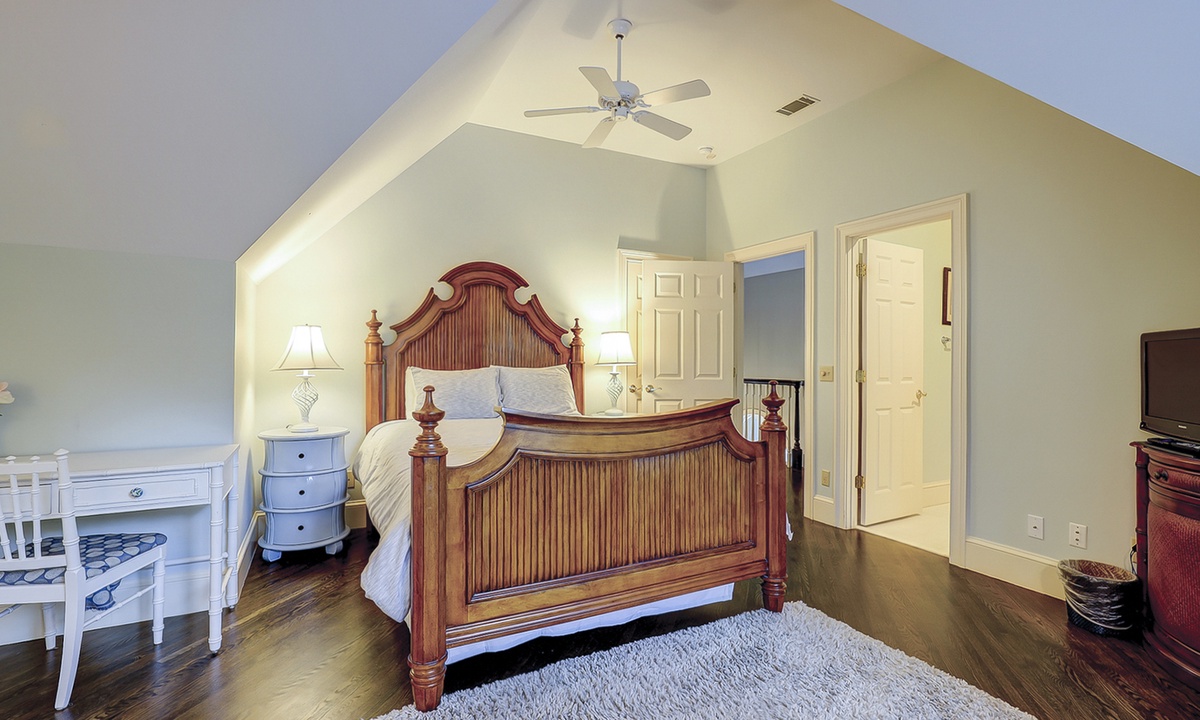 The spacious primary bedroom on the first floor is designed to be a tranquil escape from the world with its ornate furnishings, a king-size bed, two oversize armchairs, an ottoman, a flat-screen TV, access to the outdoor deck, and its own private bathroom with double sinks, a Jacuzzi tub, and even a walk-in shower. The other two bedrooms on this floor house a queen-size bed, and two twin-size beds respectively. Both rooms have TVs and share a bathroom with a shower/tub combination.