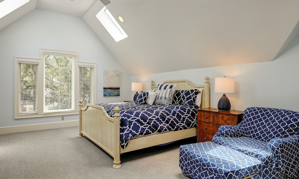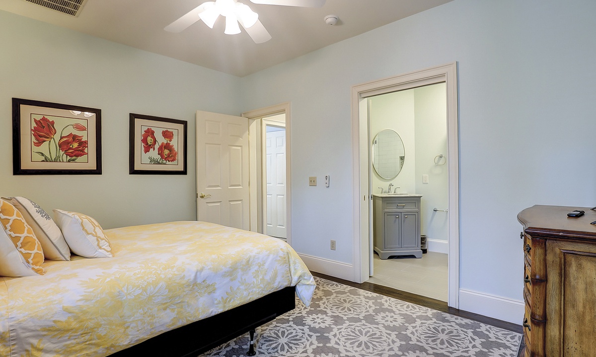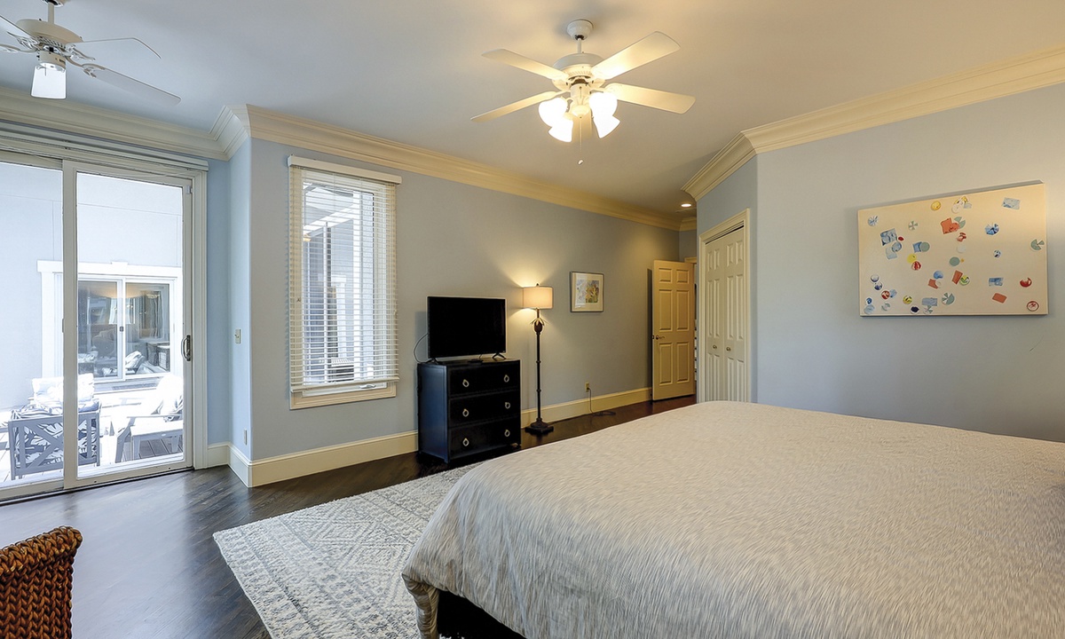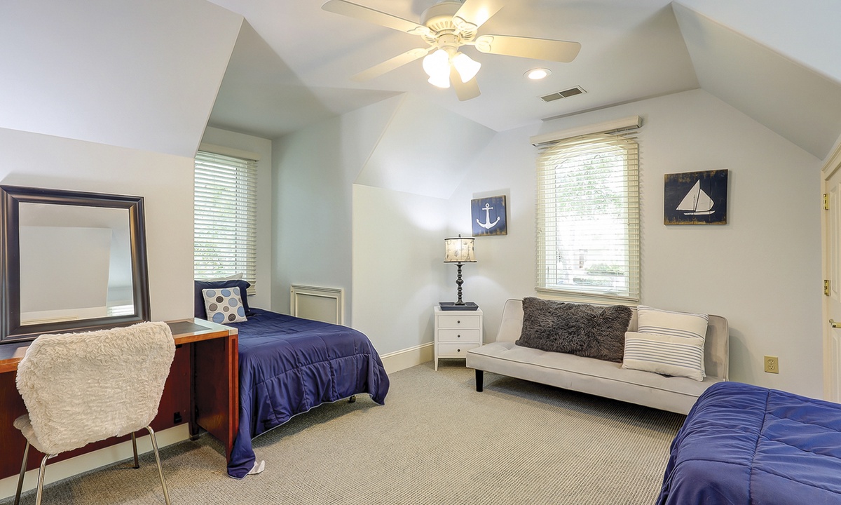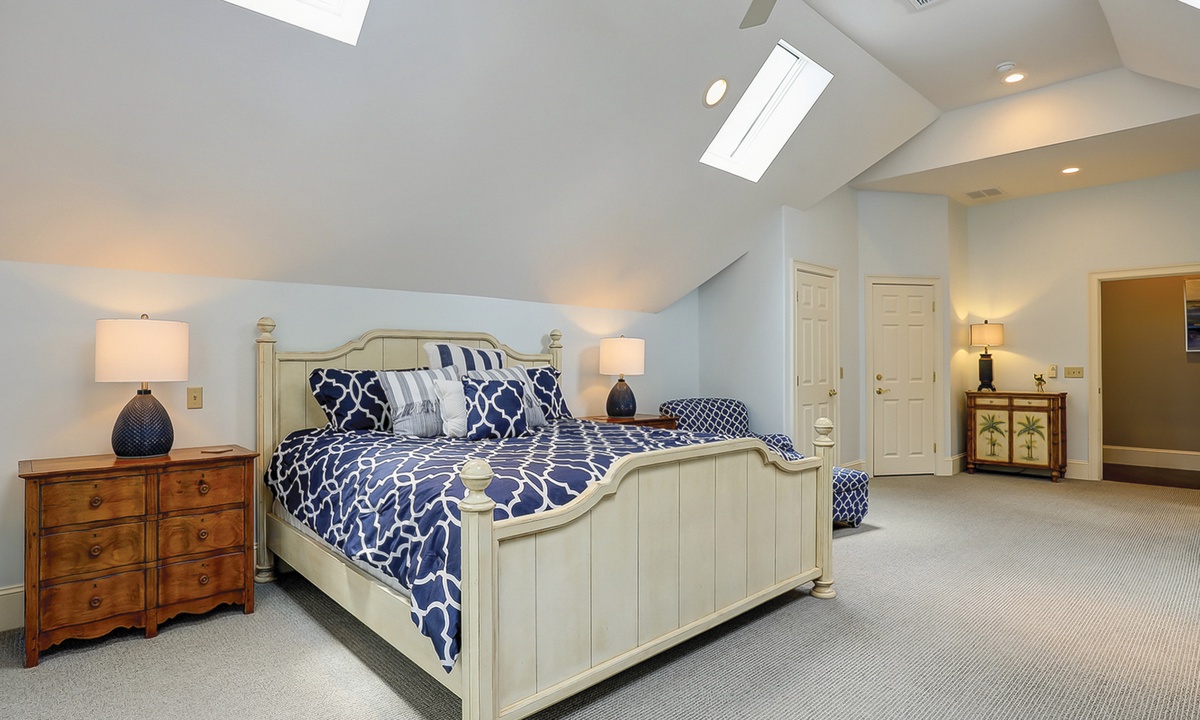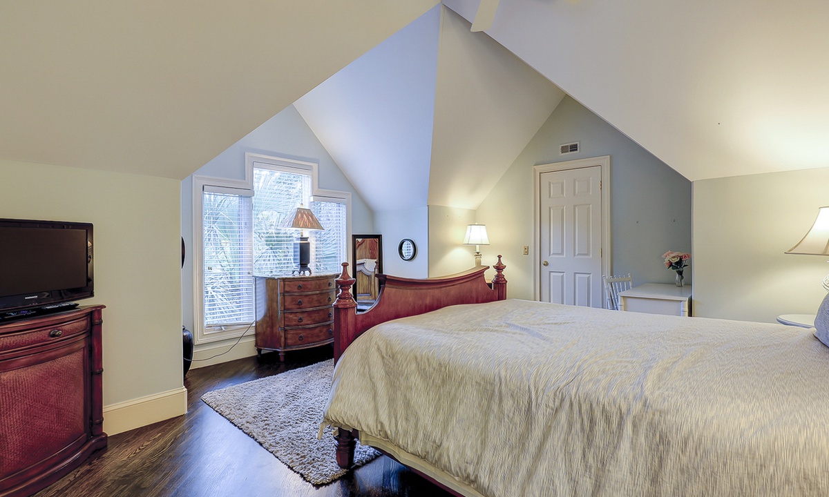 The spacious primary bedroom on the first floor is designed to be a tranquil escape from the world with its ornate furnishings, a king-size bed, two oversize armchairs, an ottoman, a flat-screen TV, access to the outdoor deck, and its own private bathroom with double sinks, a Jacuzzi tub, and even a walk-in shower. The other two bedrooms on this floor house a queen-size bed, and two twin-size beds respectively. Both rooms have TVs and share a bathroom with a shower/tub combination.