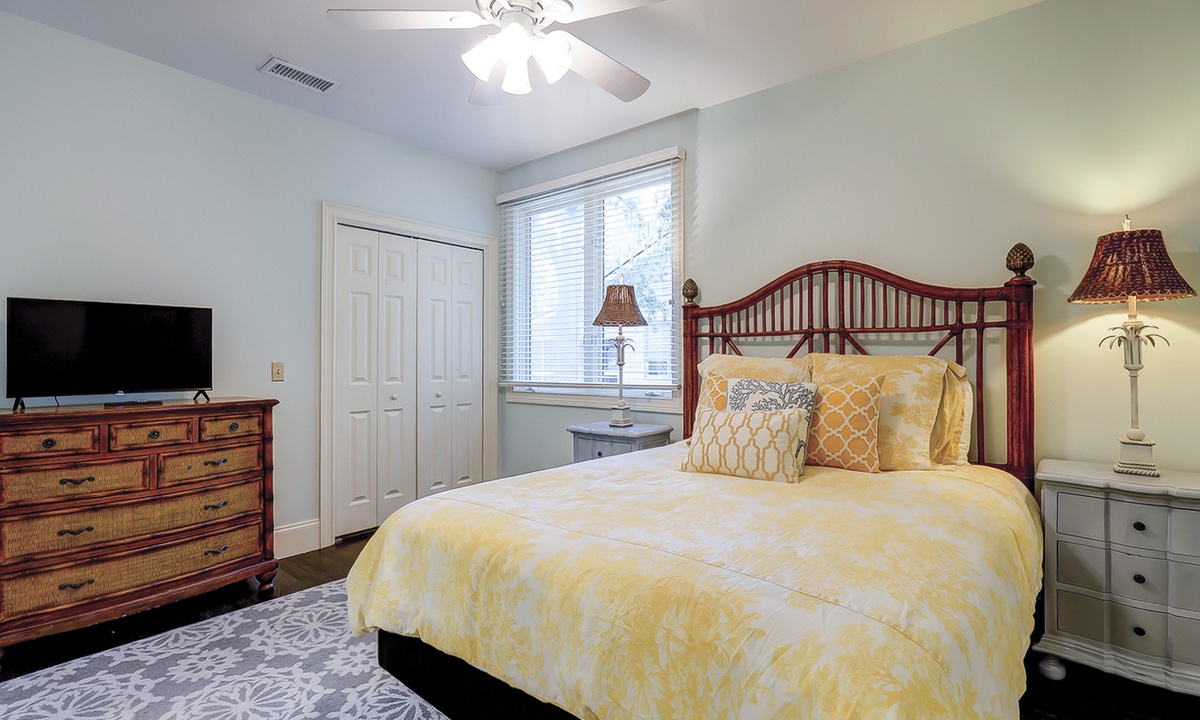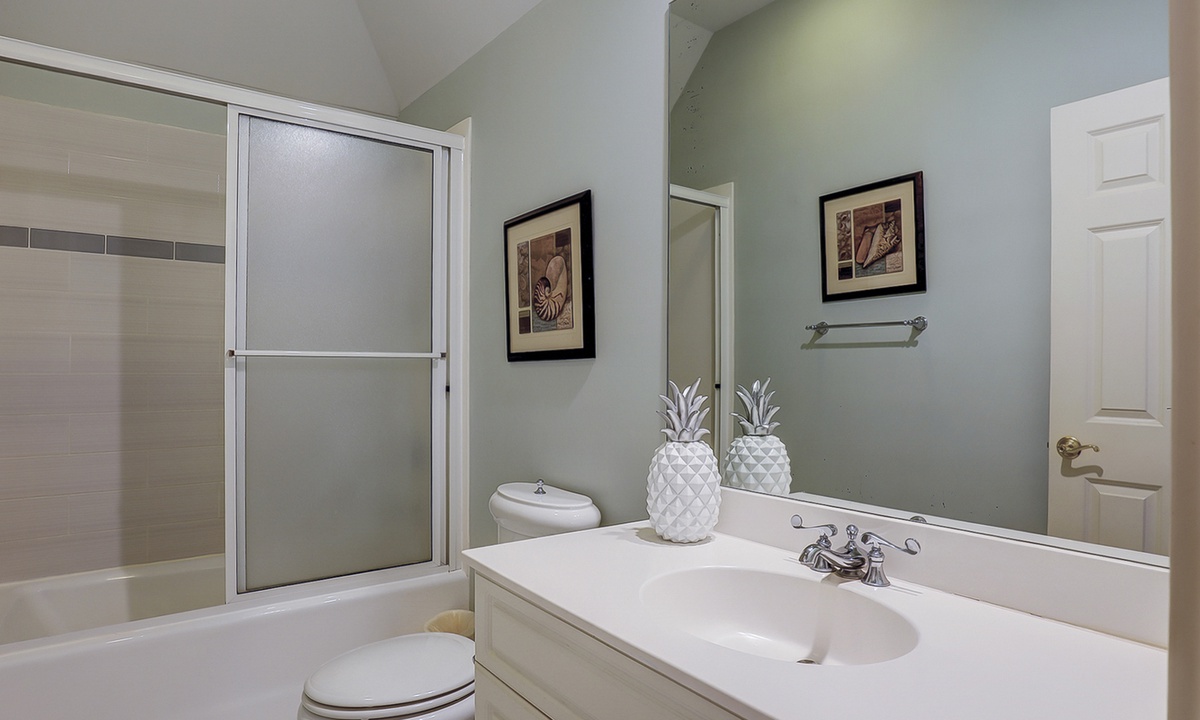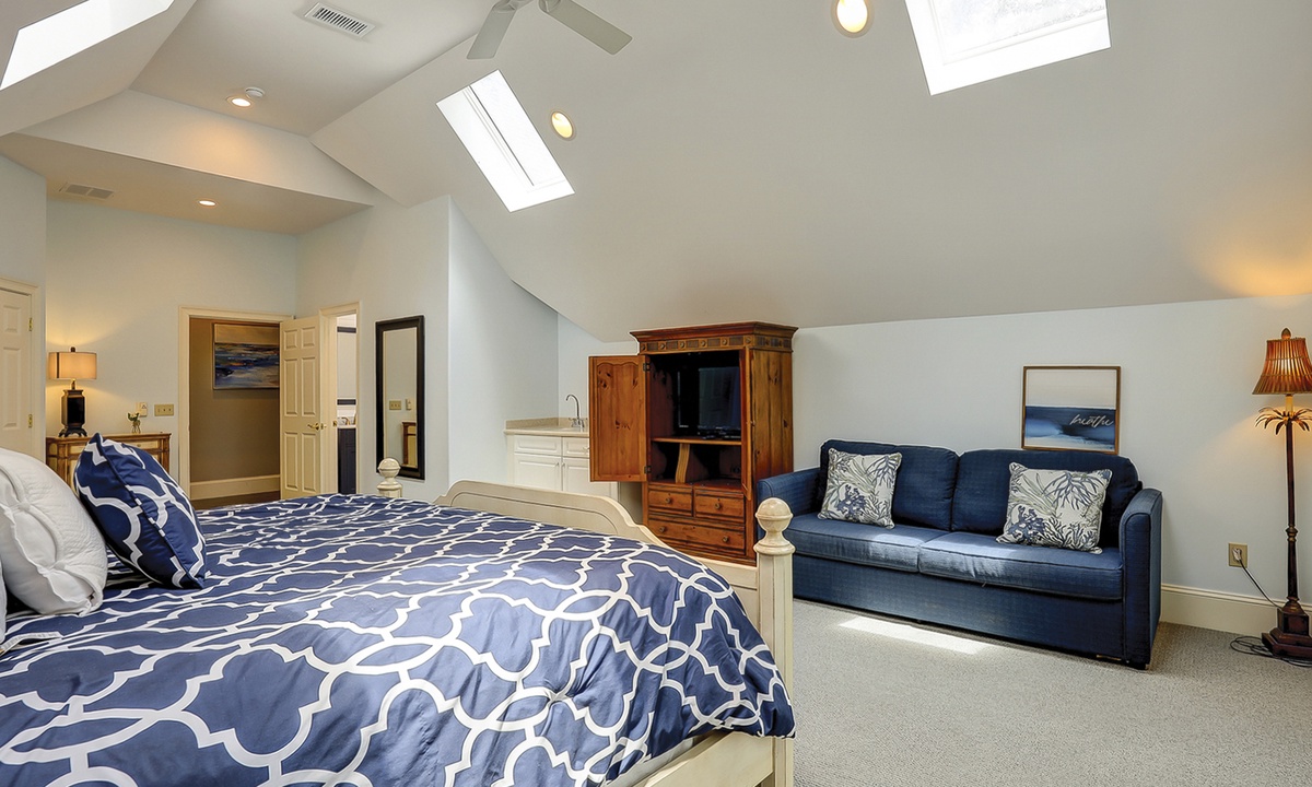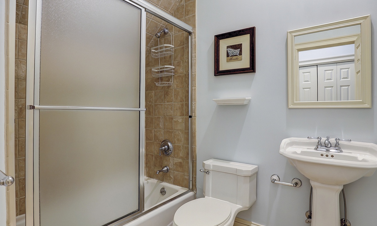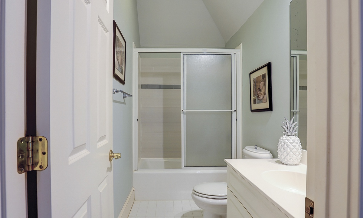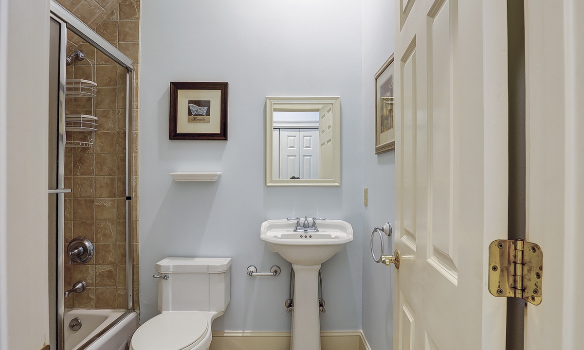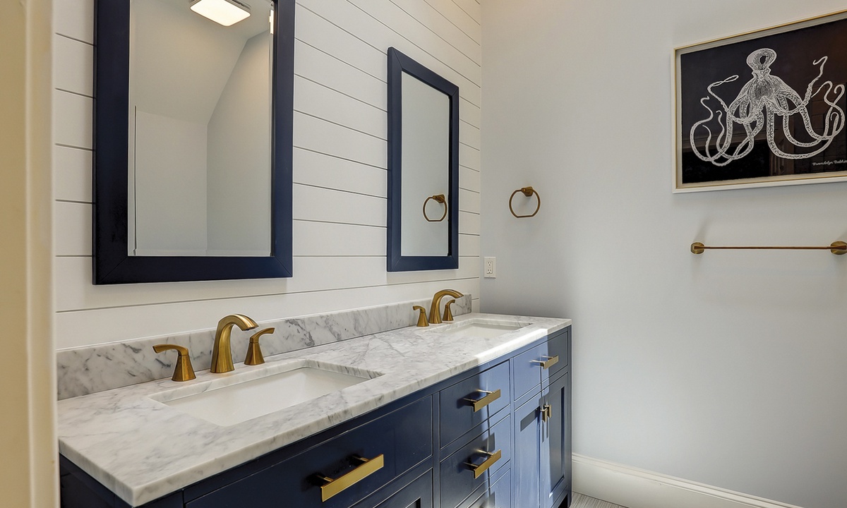 The spacious primary bedroom on the first floor is designed to be a tranquil escape from the world with its ornate furnishings, a king-size bed, two oversize armchairs, an ottoman, a flat-screen TV, access to the outdoor deck, and its own private bathroom with double sinks, a Jacuzzi tub, and even a walk-in shower. The other two bedrooms on this floor house a queen-size bed, and two twin-size beds respectively. Both rooms have TVs and share a bathroom with a shower/tub combination.
