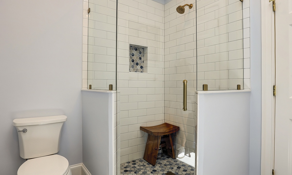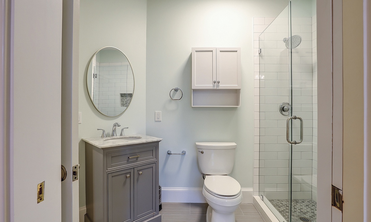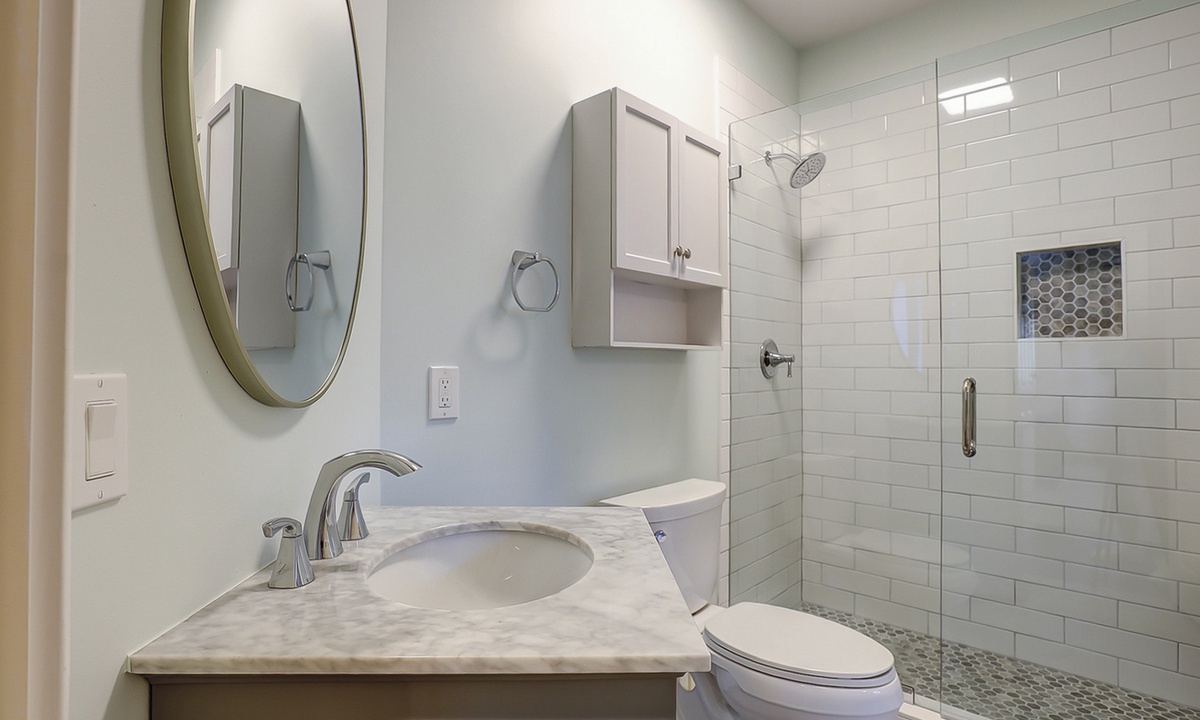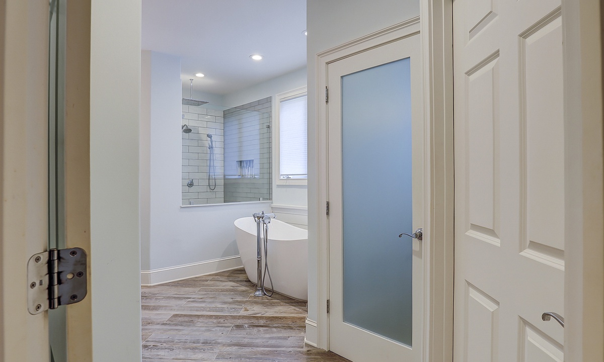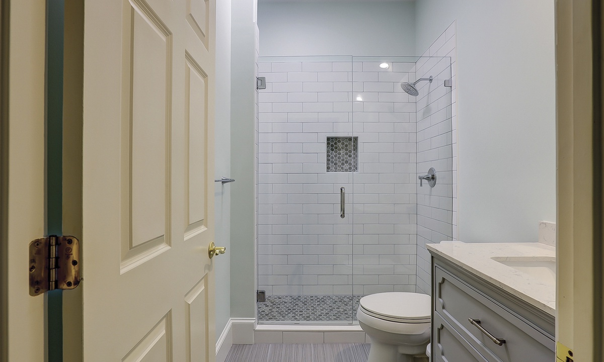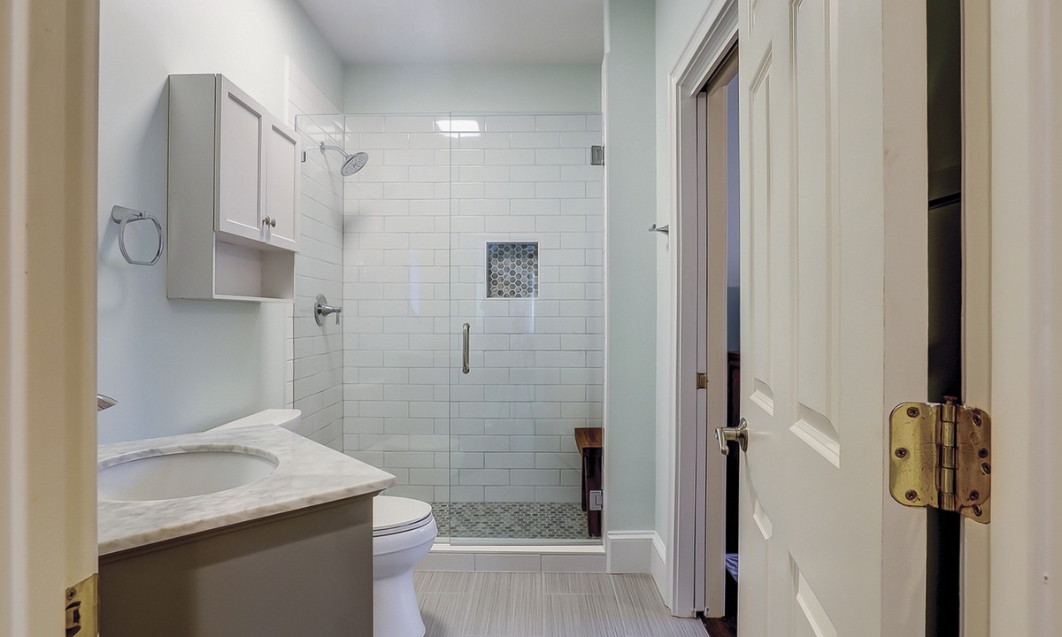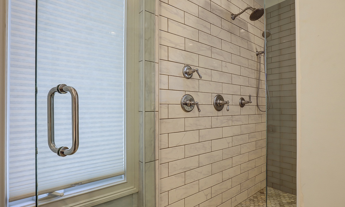 The spacious primary bedroom on the first floor is designed to be a tranquil escape from the world with its ornate furnishings, a king-size bed, two oversize armchairs, an ottoman, a flat-screen TV, access to the outdoor deck, and its own private bathroom with double sinks, a Jacuzzi tub, and even a walk-in shower. The other two bedrooms on this floor house a queen-size bed, and two twin-size beds respectively. Both rooms have TVs and share a bathroom with a shower/tub combination.