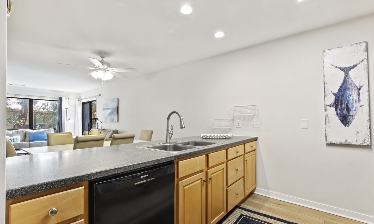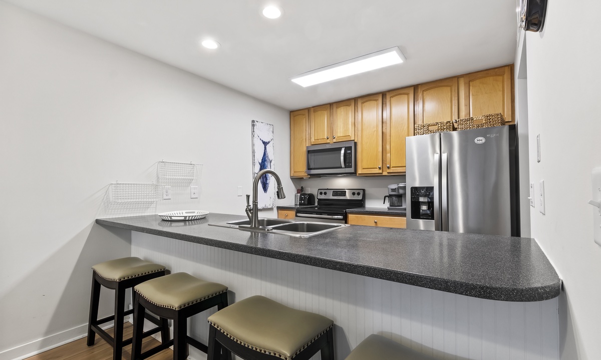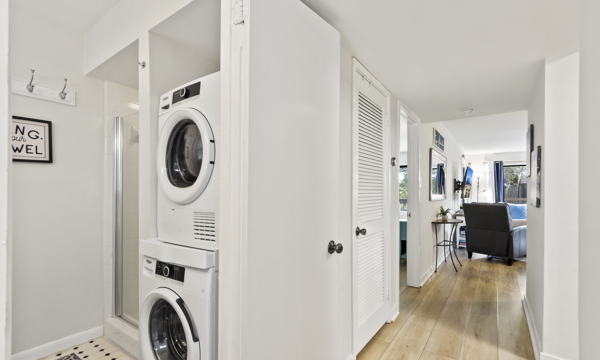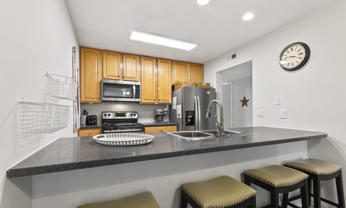 The spacious and open concept living area offers comfortable, recently updated furnishings, including a sleeper sofa, a Smart TV and access to both balconies. The dining area seats 6 comfortably with additional seating for 4 at the kitchen bar. The well-stocked kitchen features granite counters, stainless steel appliances and a Keurig Duo. A 3rd full size bathroom off the living area doubles as the laundry area for added convenience.