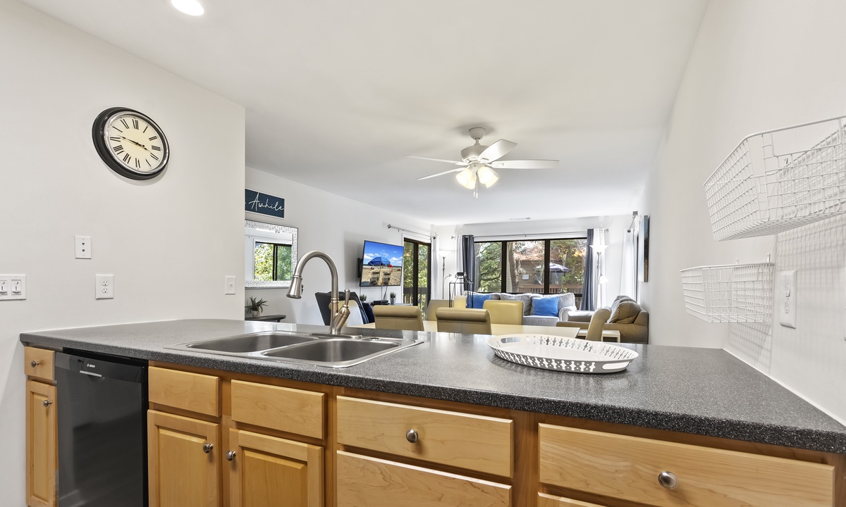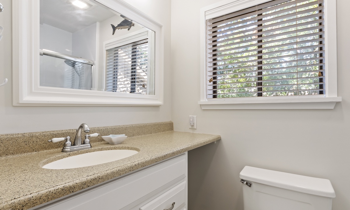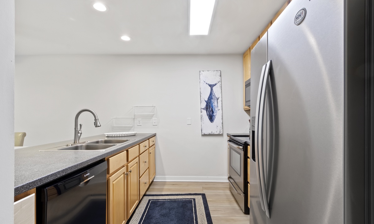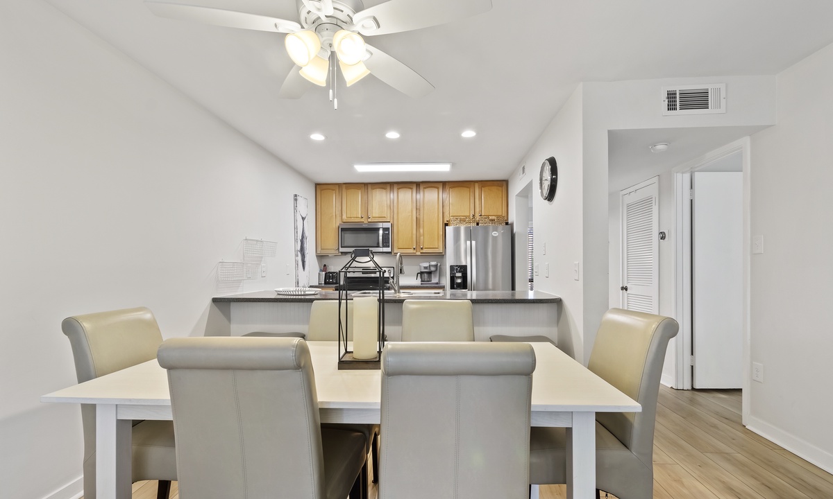 The spacious and open concept living area offers comfortable, recently updated furnishings, including a sleeper sofa, a Smart TV and access to both balconies. The dining area seats 6 comfortably with additional seating for 4 at the kitchen bar. The well-stocked kitchen features granite counters, stainless steel appliances and a Keurig Duo. A 3rd full size bathroom off the living area doubles as the laundry area for added convenience.