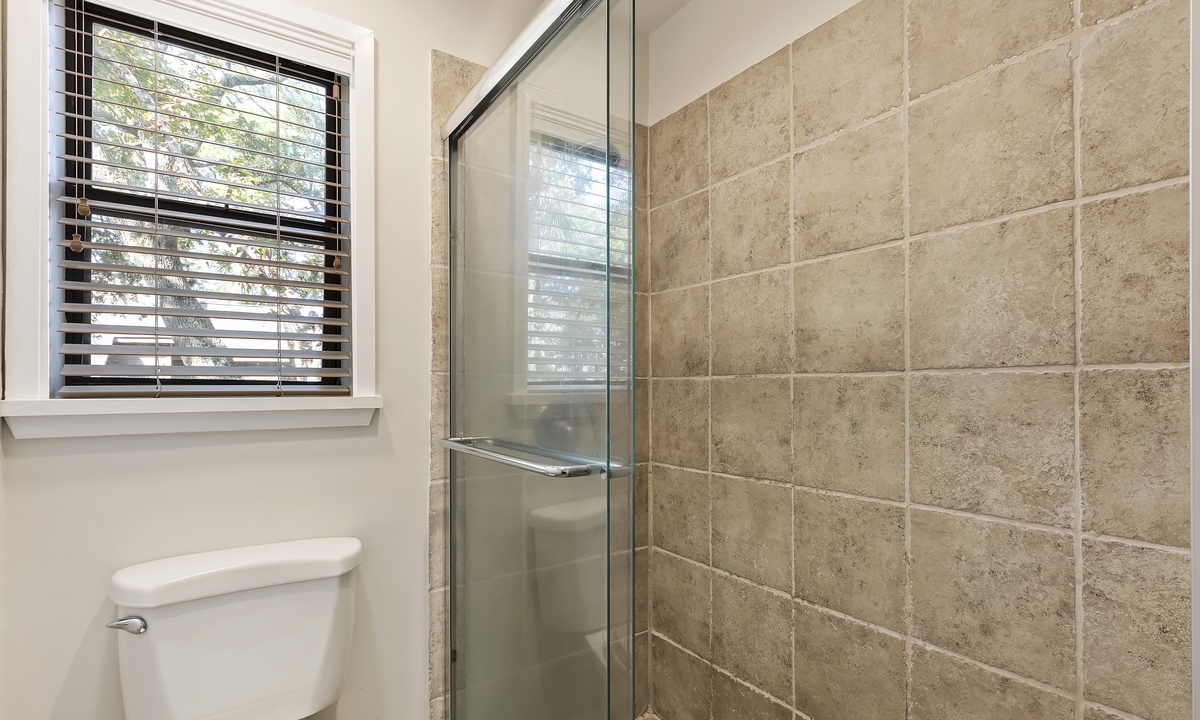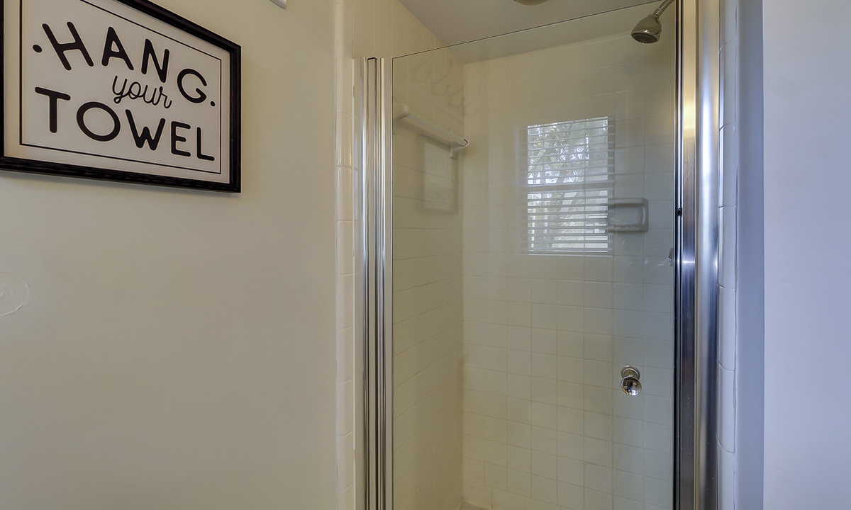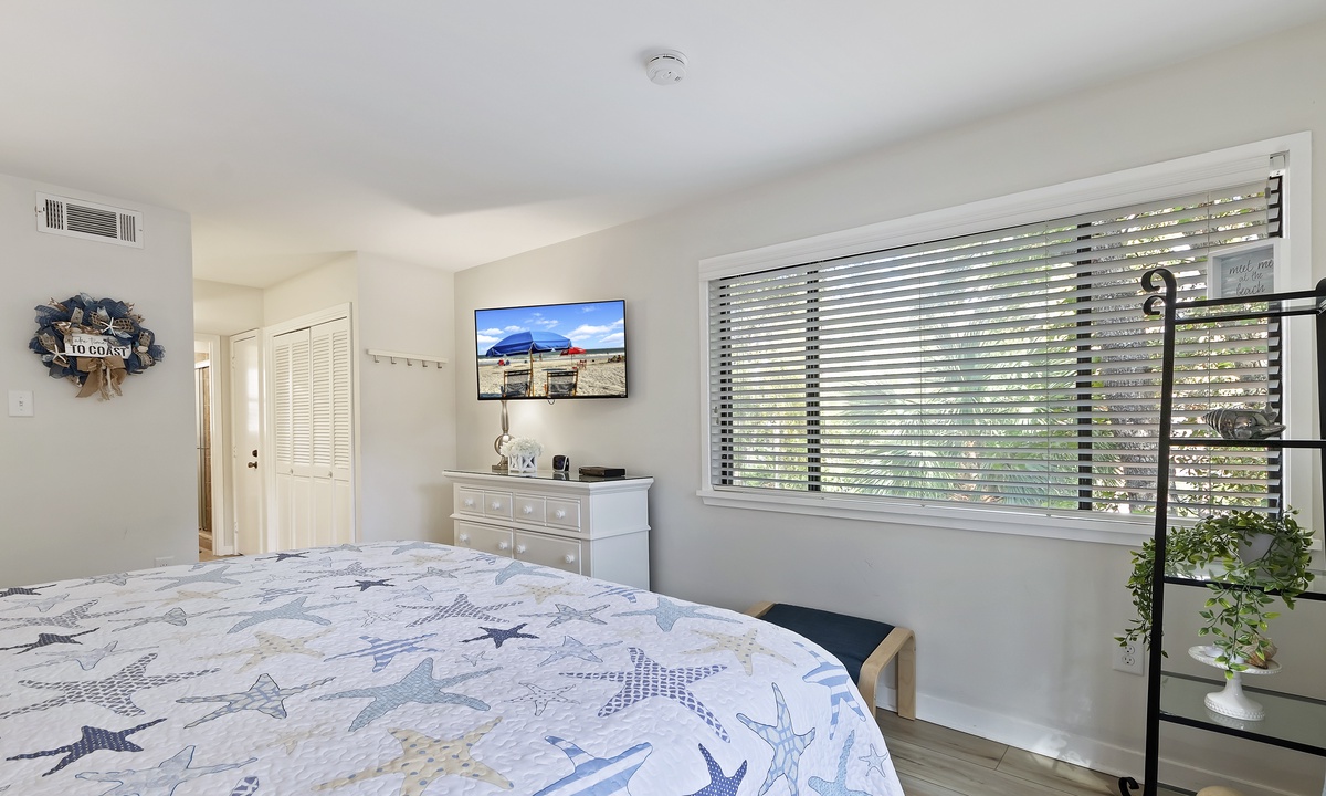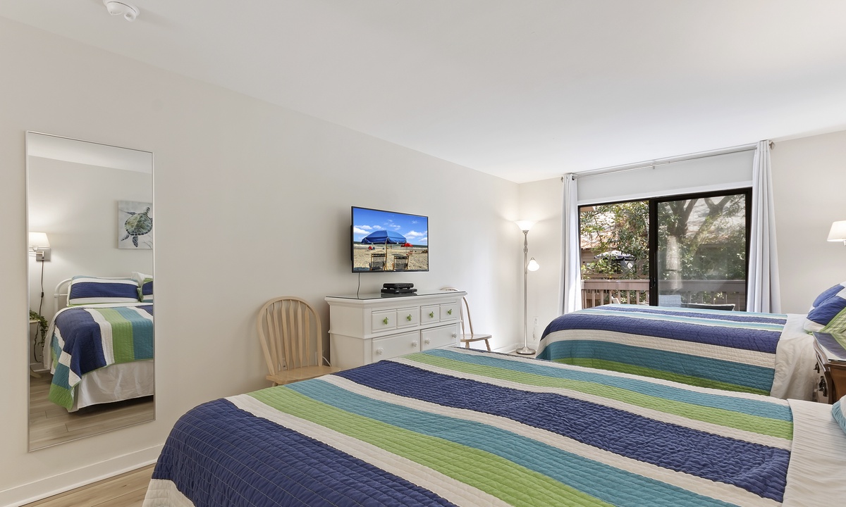 The split bedroom layout is ideal for groups and gives everyone privacy. The primary bedroom has a king bed, private balcony access, a Smart TV and a private bathroom. The bathroom offers a tiled shower with bench seating. The guest bedroom has two queen beds, private balcony access, a Smart TV and a private bathroom with a tub/shower combination.