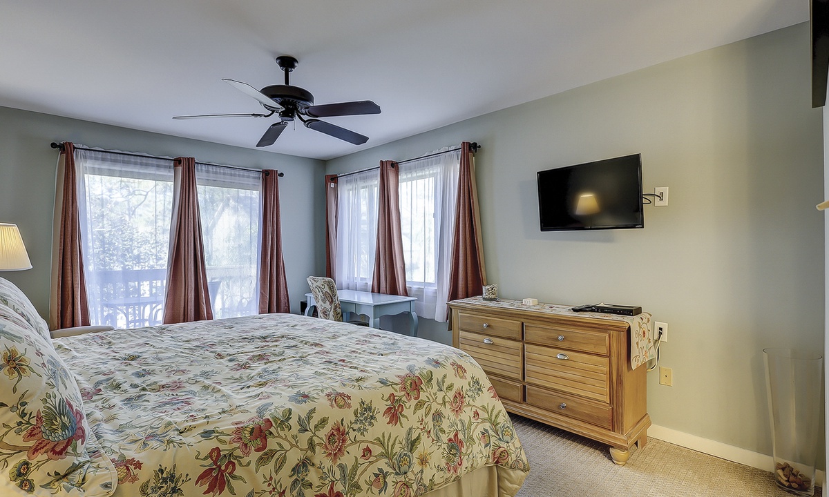 The main suite features a king bed, a Smart TV, balcony access and a luxurious private bathroom with a walk-in shower.