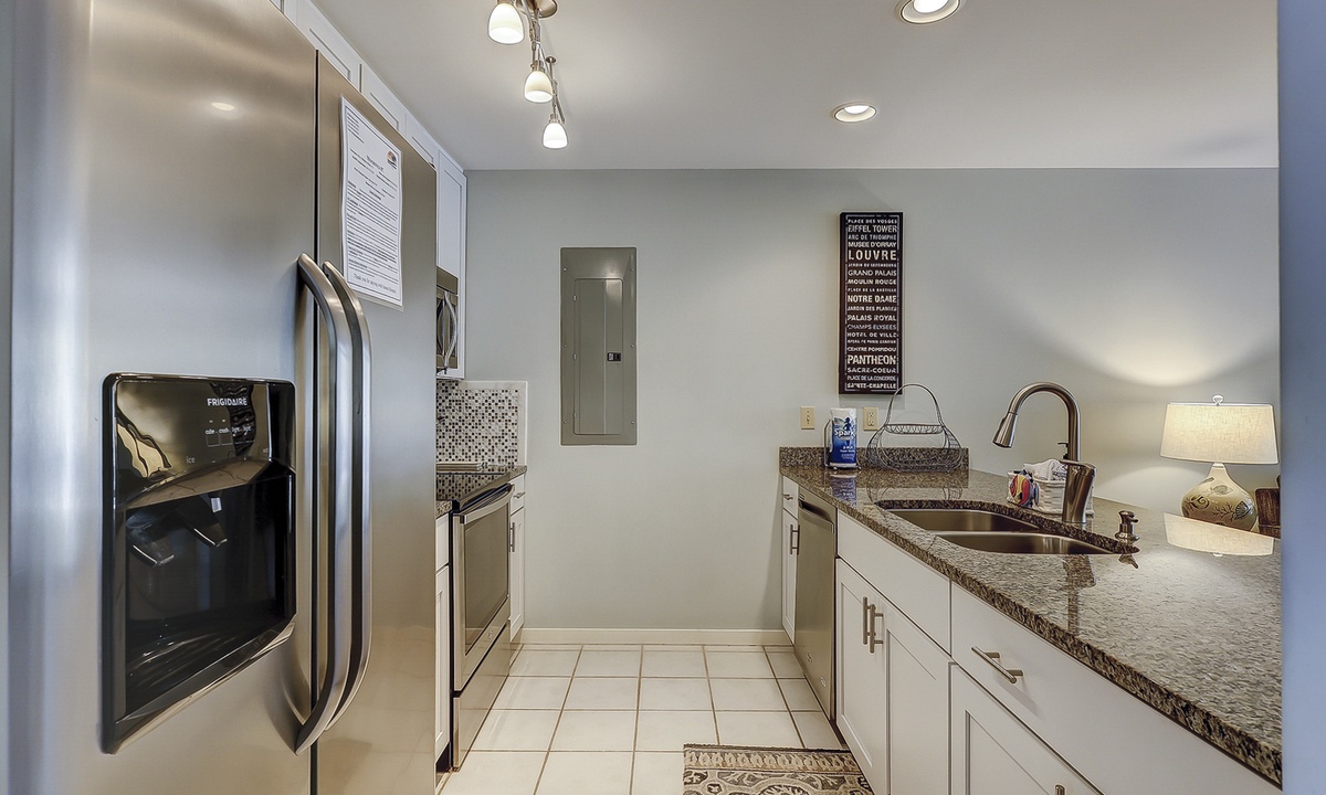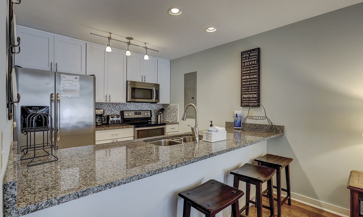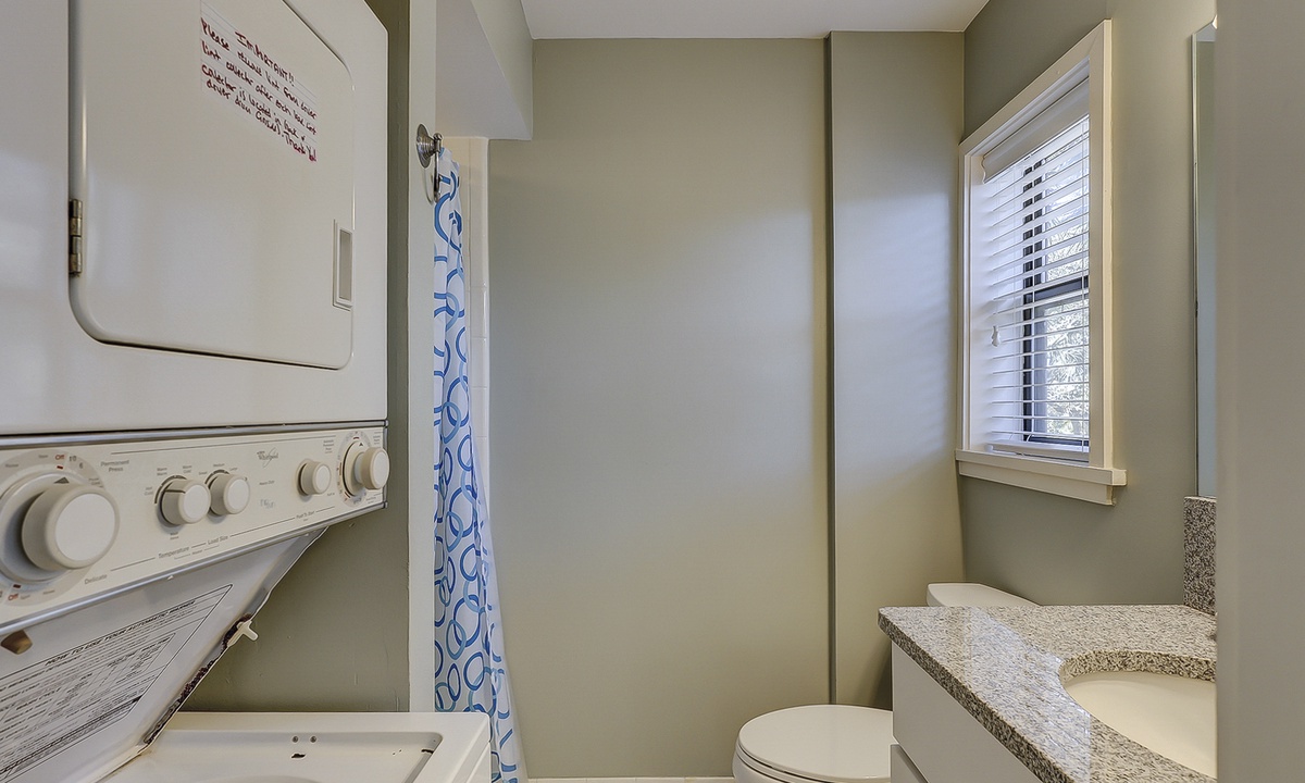 The well-appointed kitchen features stainless appliances, granite counters and plenty of cabinet space. Beyond the kitchen, you'll find a laundry area within a full size bathroom with a walk-in shower.