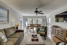 The living area offers plush furniture, a Smart TV and a dining area beyond. The dining table seats 6 with additional seating at the kitchen bar. Guests have access to two balconies from the living area, as well as both bedrooms.