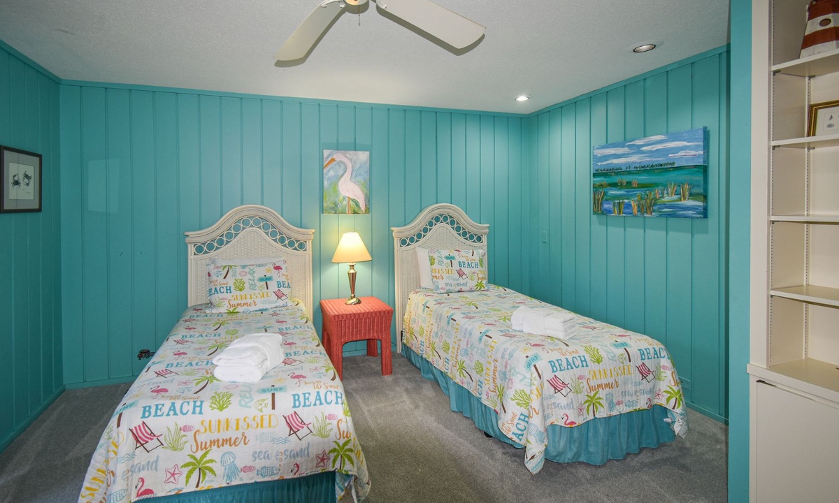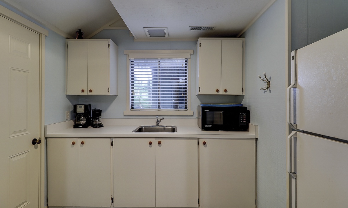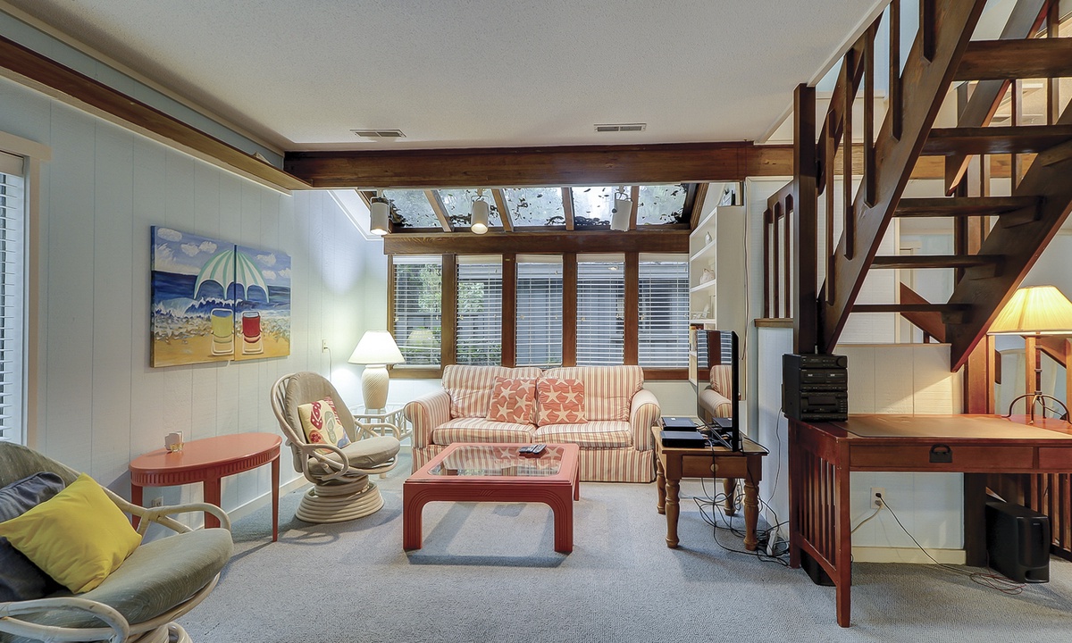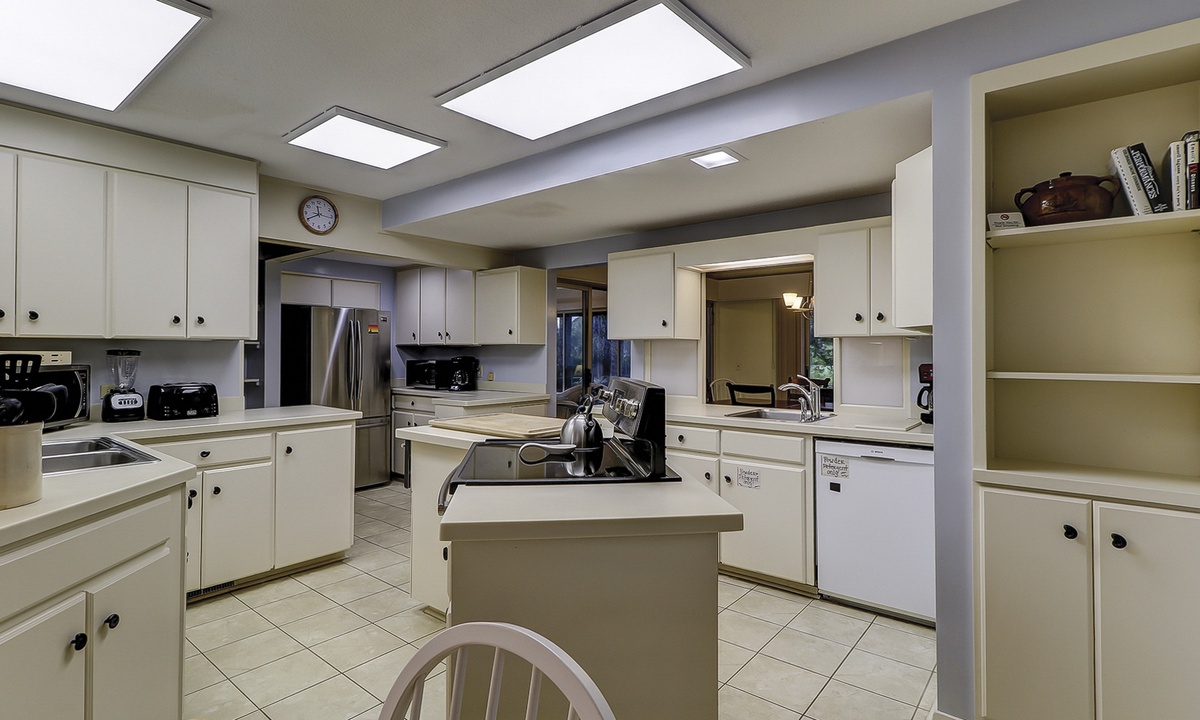 No step entry from the driveway into the first floor, where the living area, dining area, kitchen and sunroom are located. The living area features a flat-screen TV, seating, and a multitude of books for you to choose from, perfect for your beach read. The kitchen is spacious with plenty of counter space for preparing meals or snacks for the beach. The Carolina room is a great space for reading, playing games, or enjoying a quiet space. There is a separate kitchenette with 2nd refrigerator, and den area behind the main kitchen. The den has a TV and sofas, a great space for kids to hideaway.