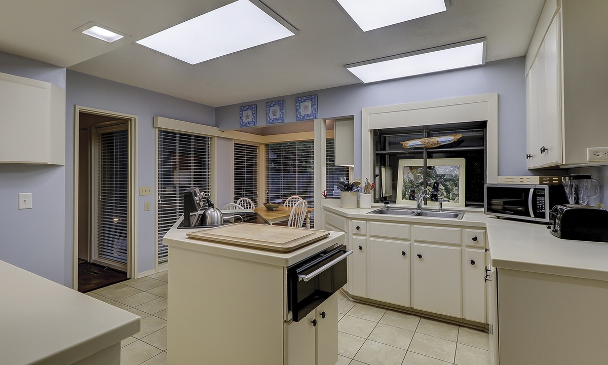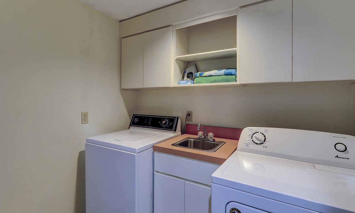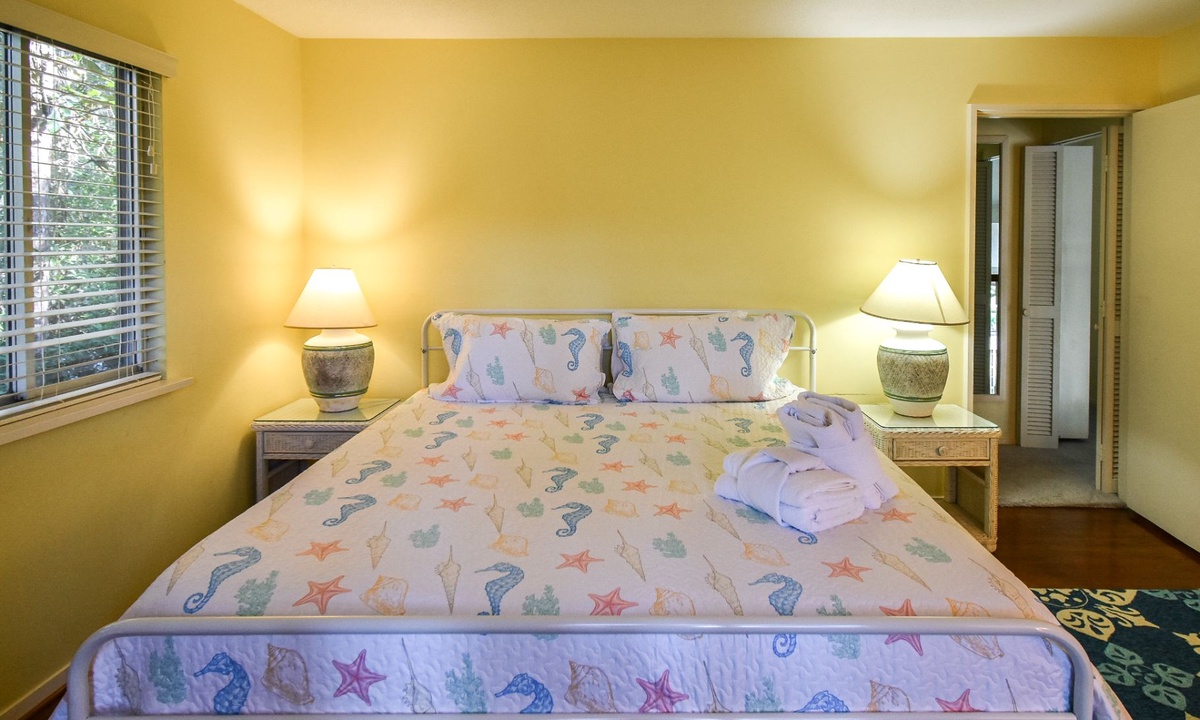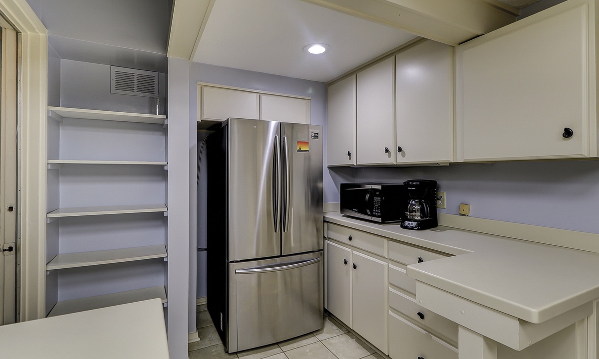 No step entry from the driveway into the first floor, where the living area, dining area, kitchen and sunroom are located. The living area features a flat-screen TV, seating, and a multitude of books for you to choose from, perfect for your beach read. The kitchen is spacious with plenty of counter space for preparing meals or snacks for the beach. The Carolina room is a great space for reading, playing games, or enjoying a quiet space. There is a separate kitchenette with 2nd refrigerator, and den area behind the main kitchen. The den has a TV and sofas, a great space for kids to hideaway.