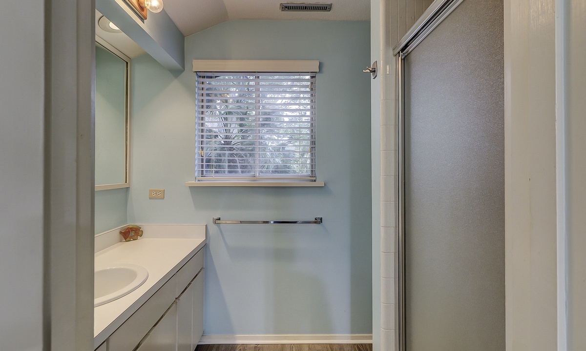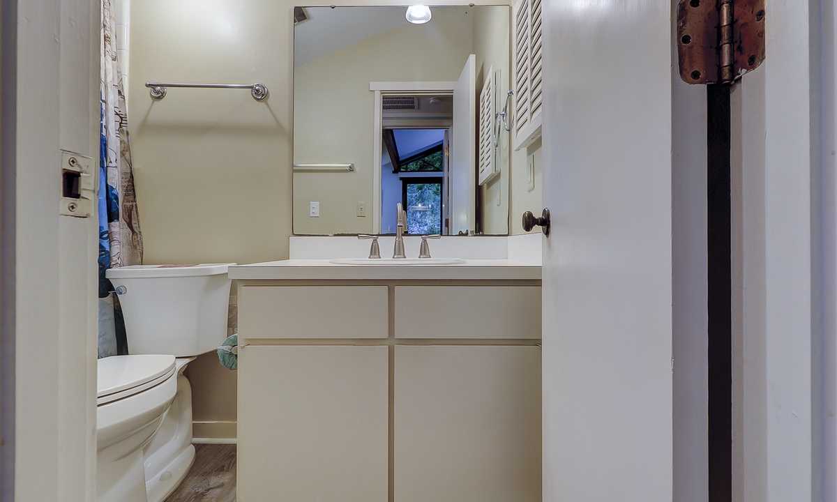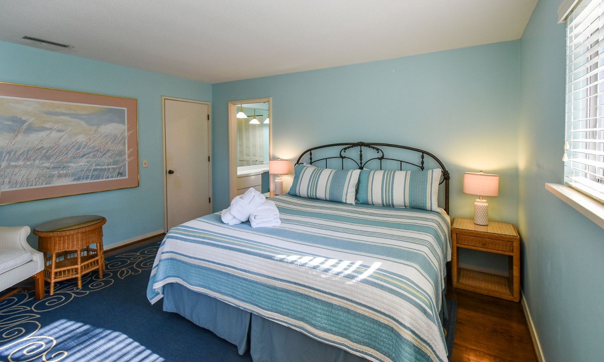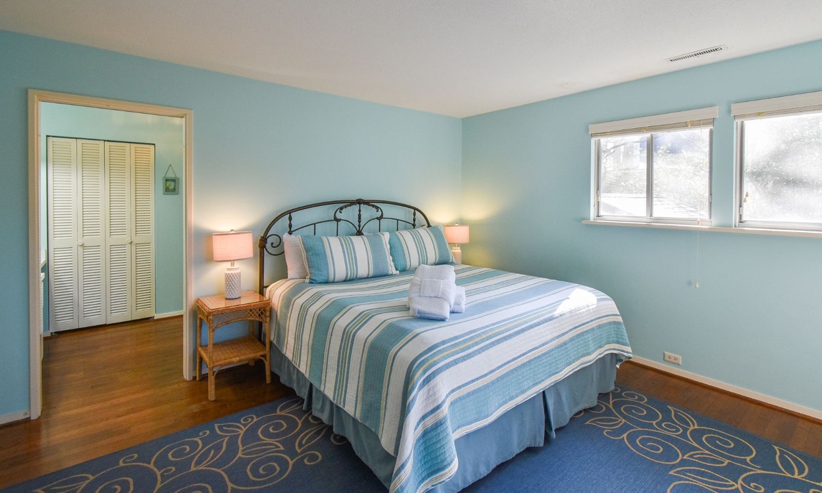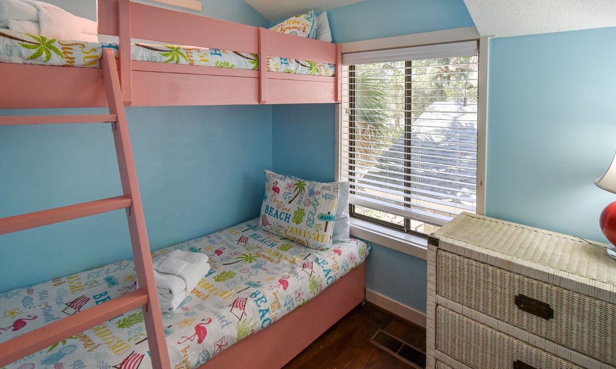 Upstairs from the den area is a bedroom, a bunk room and shared bathroom. The main bedroom has a queen bed, the other has a set of built-in bunks. These rooms share a hallbathroom with a tub/shower combination.