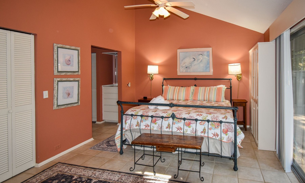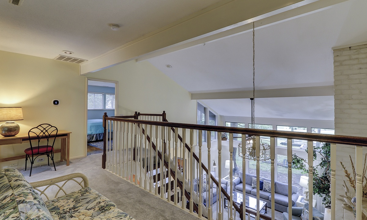 There are two separate upstairs areas with additional bedrooms. Up the stairs from the main living area are three bedrooms and 2 bathrooms. One end of the hallway is a king bedroom with an attached private bathroom and a dressing area. Across the catwalk are the two remaining bedrooms that share a hallway bath with a step-in shower. The first bedroom has a queen-sized bed and the other has two twin beds.