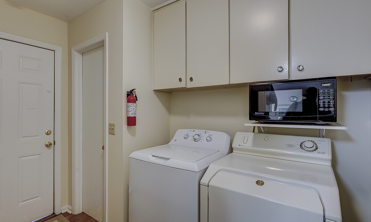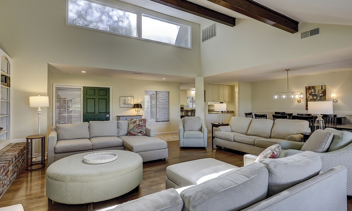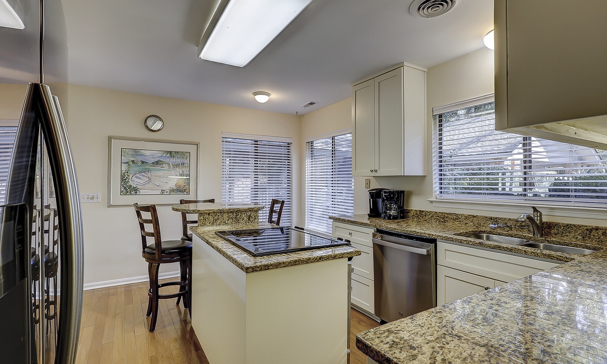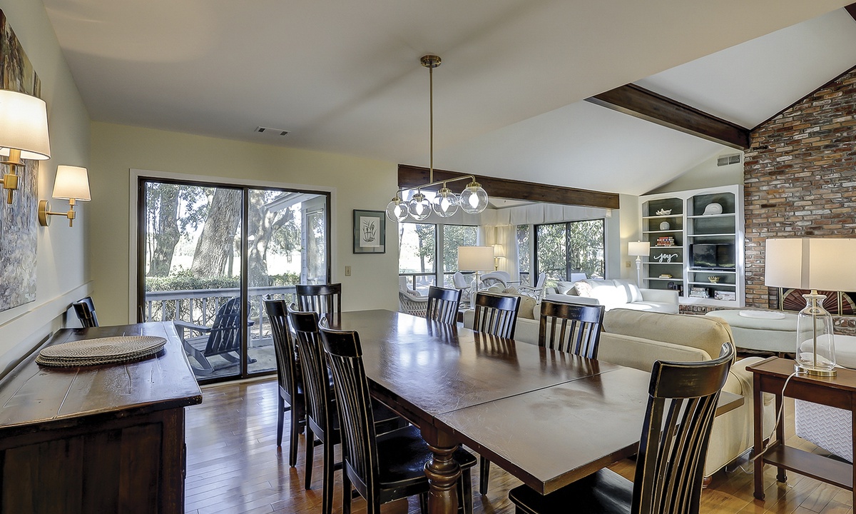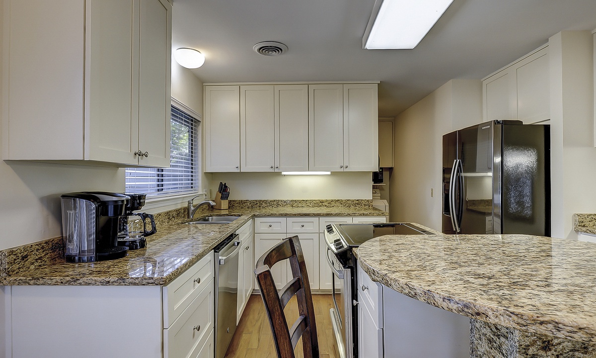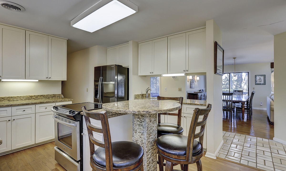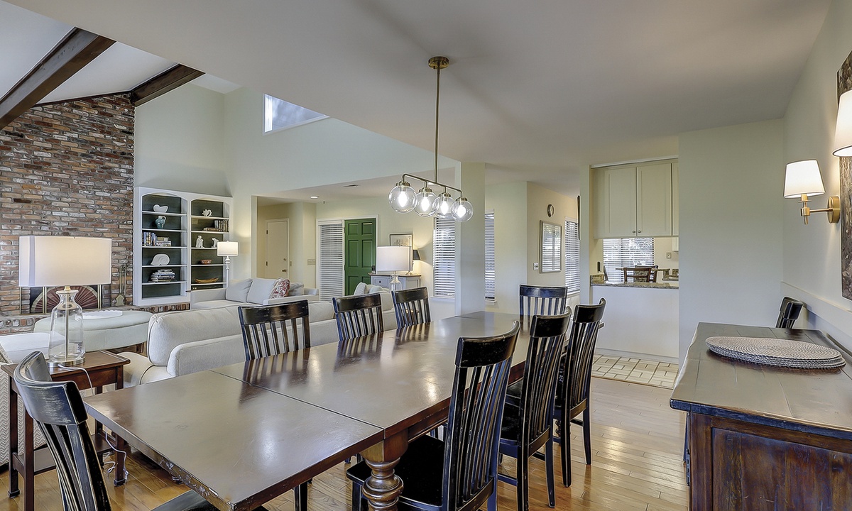 The dining area is just beyond the living area and features seating for 10. The large kitchen offers additional seating for two at the kitchen island and features granite counters, a Keurig coffee maker and plenty of cabinet space.