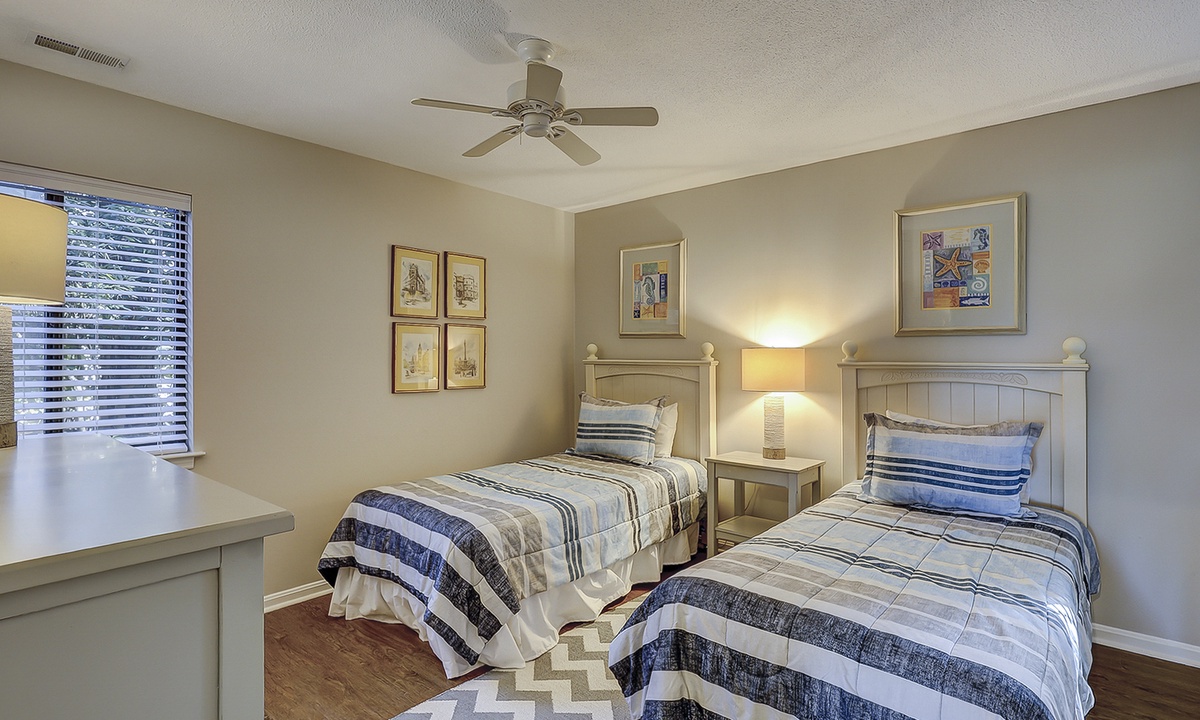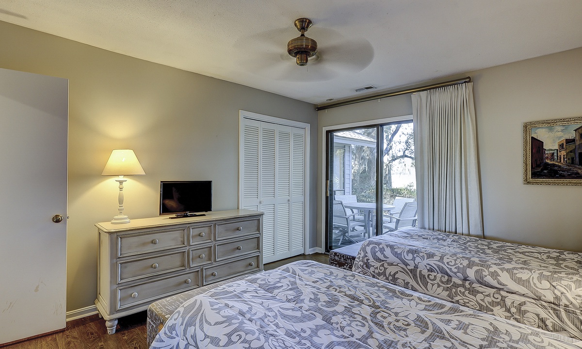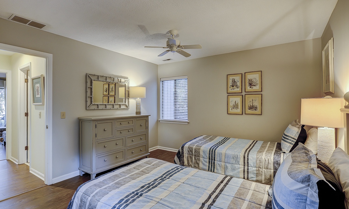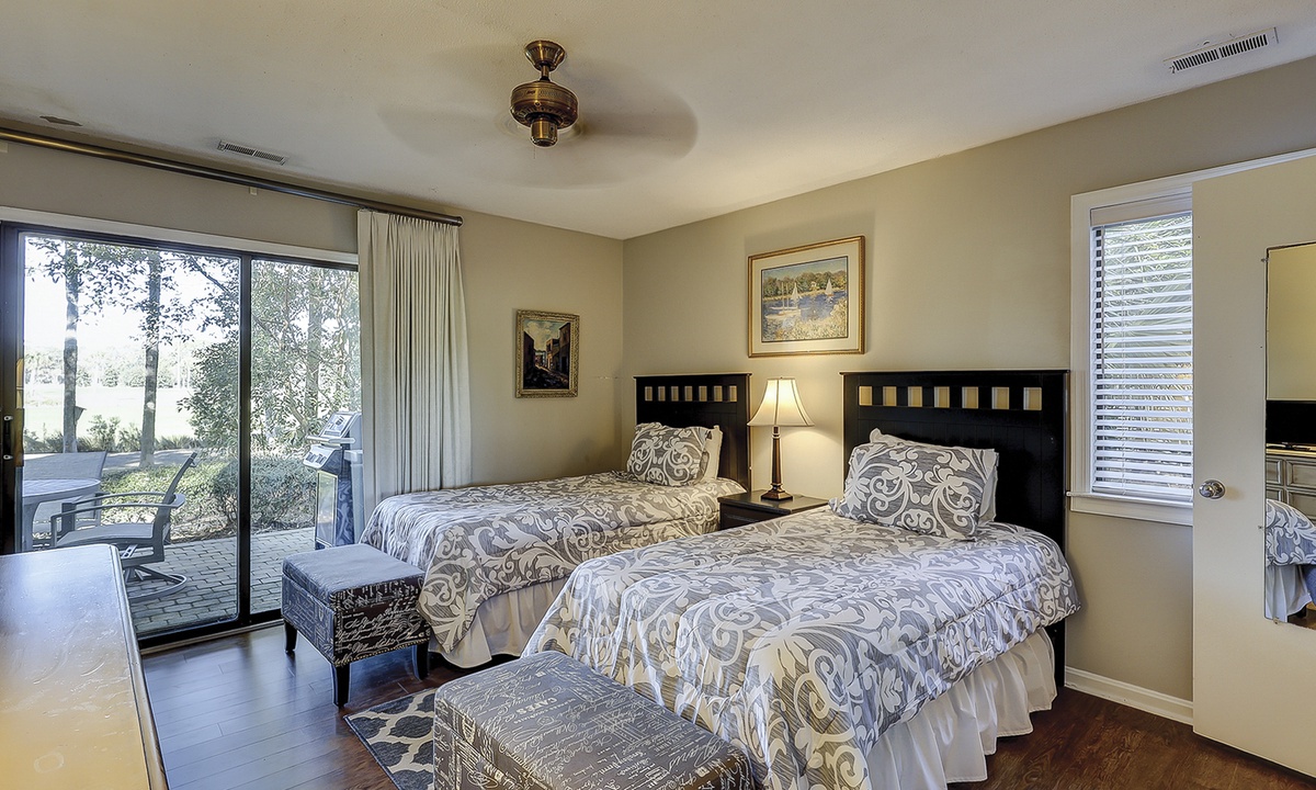 The two guest bedrooms are located to the right of the living area. Both bedrooms have twin beds. The 2nd guest bedroom also has a flat screen TV and access to the porch, shared by the Carolina room. You'll find a gas grill on this porch, as well as seating for 4.