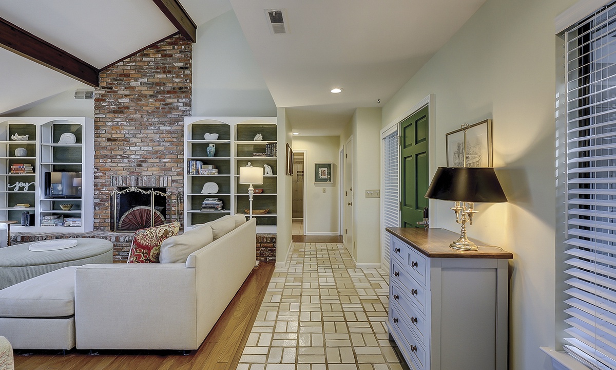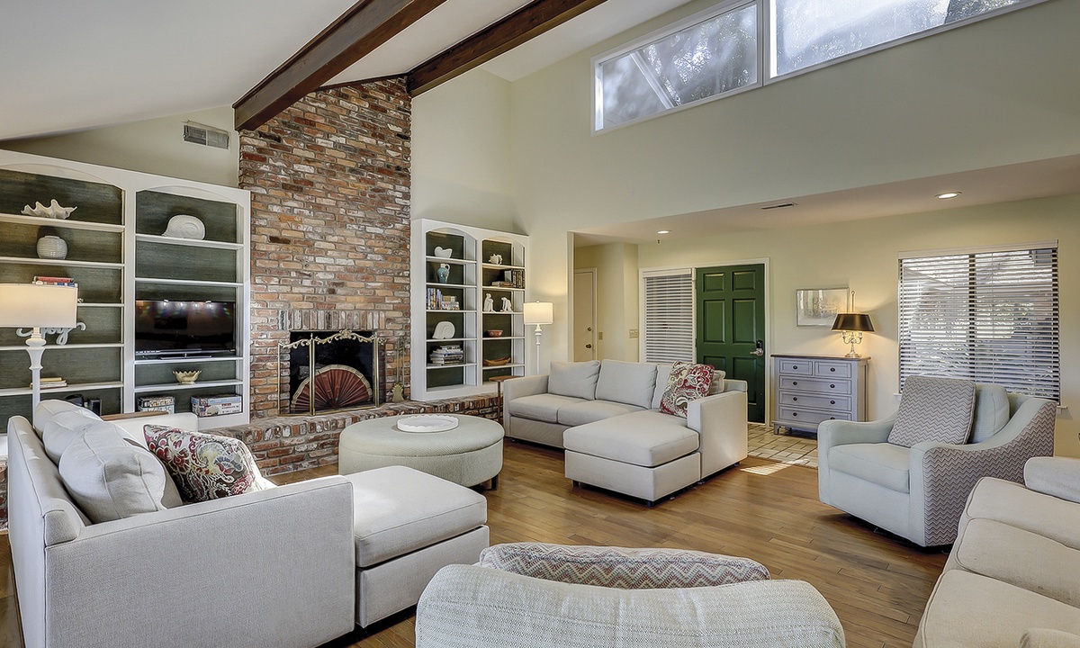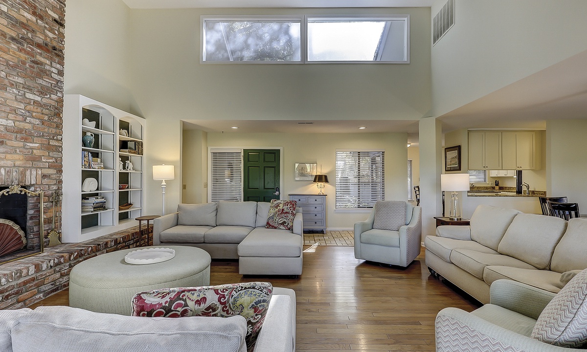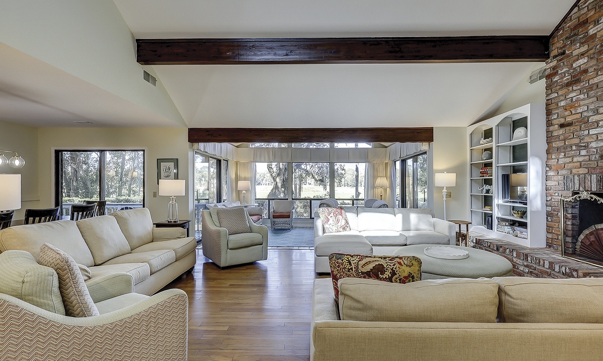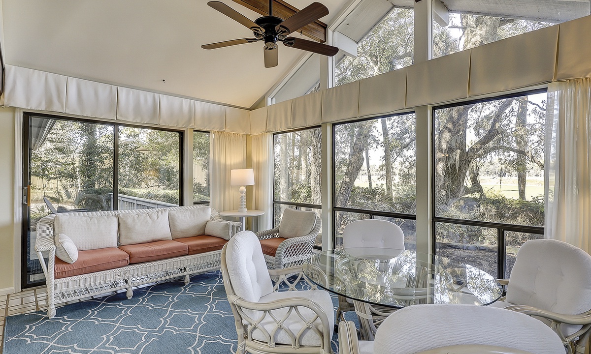 As you walk through the front door, you're greeted with lots of natural light and an open-concept floor plan. The living area offers plenty of seating on plush furniture, as well as a Smart TV and sleeper sofa. The sun-drenched Carolina room is located just beyond the living area, making it the perfect spot for your morning coffee or reading respite.