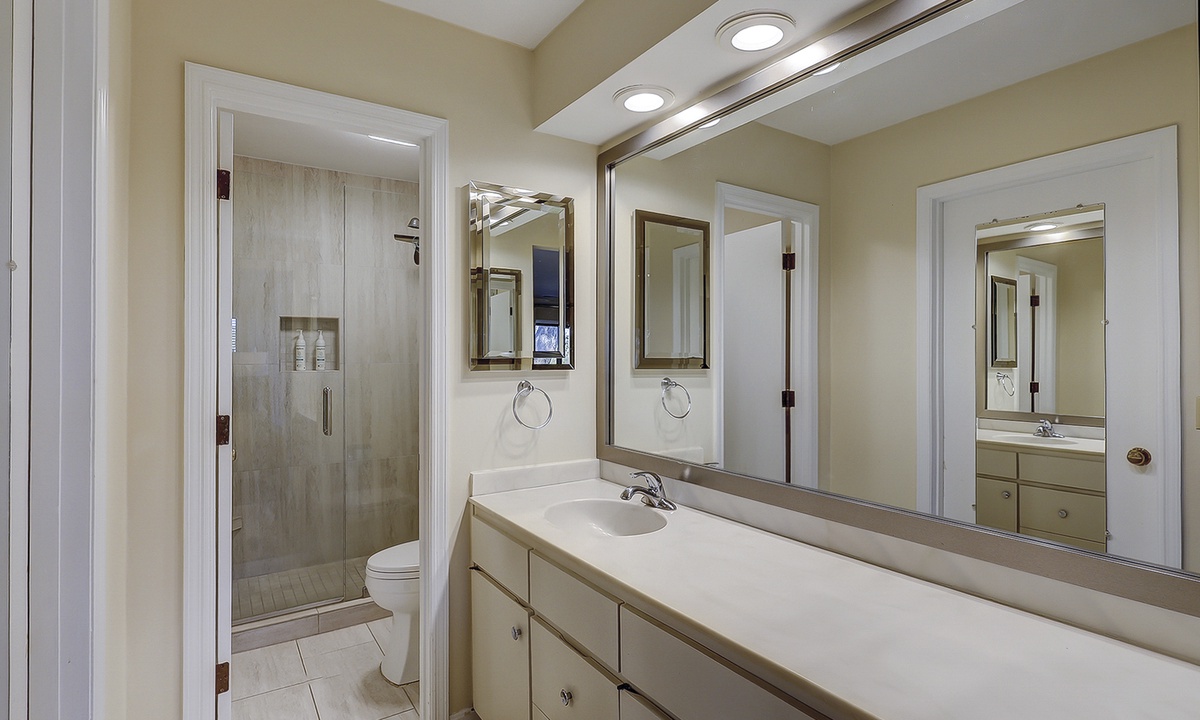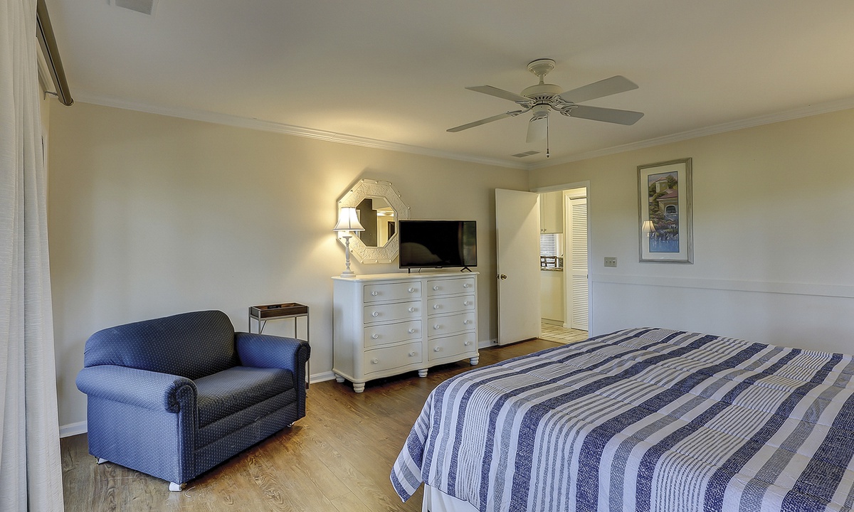 To the left of the living area you'll find the main bedroom. This room has a king bed, flat screen TV and a private porch overlooking the golf course. The private bathroom has a renovated walk-in shower.