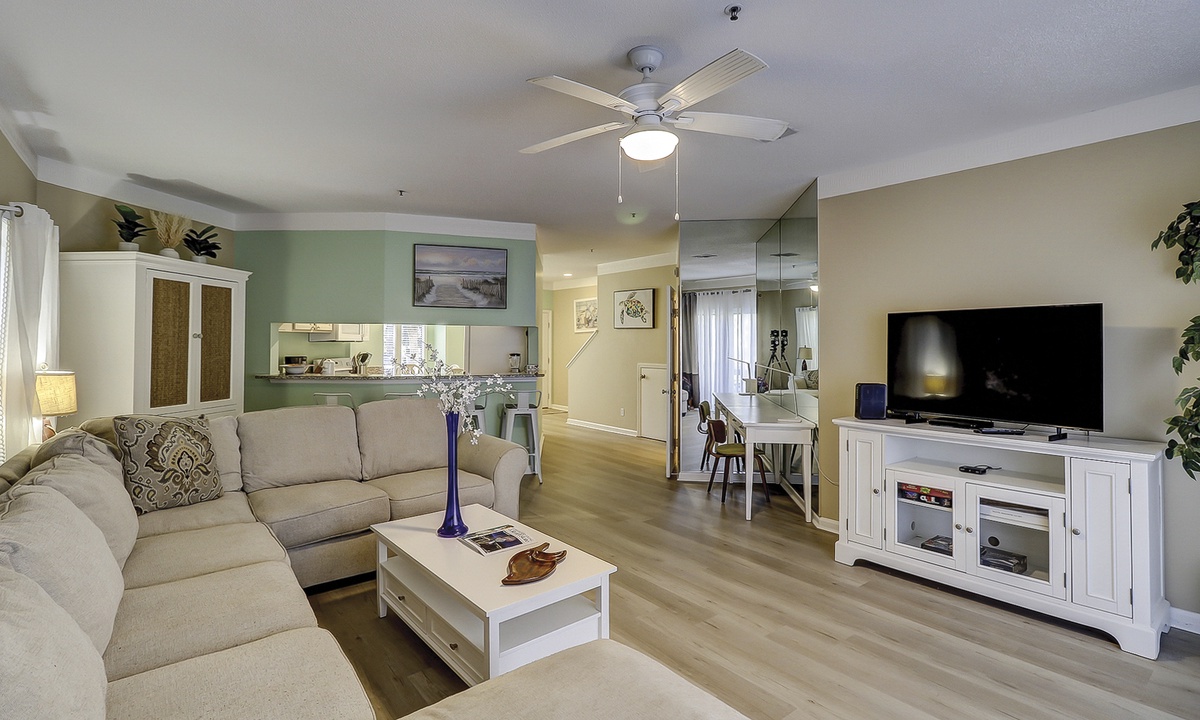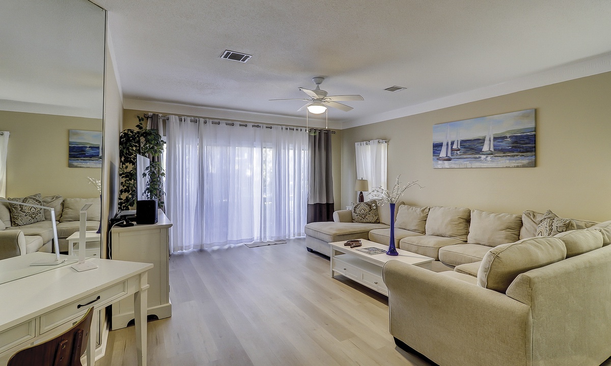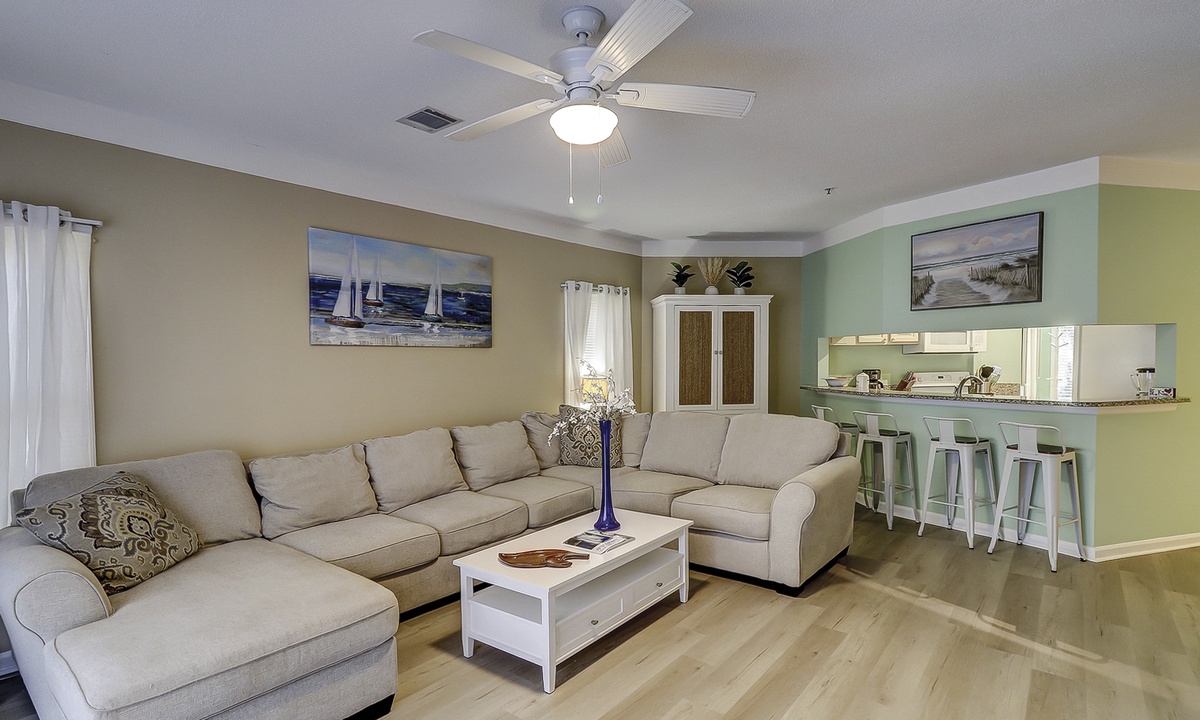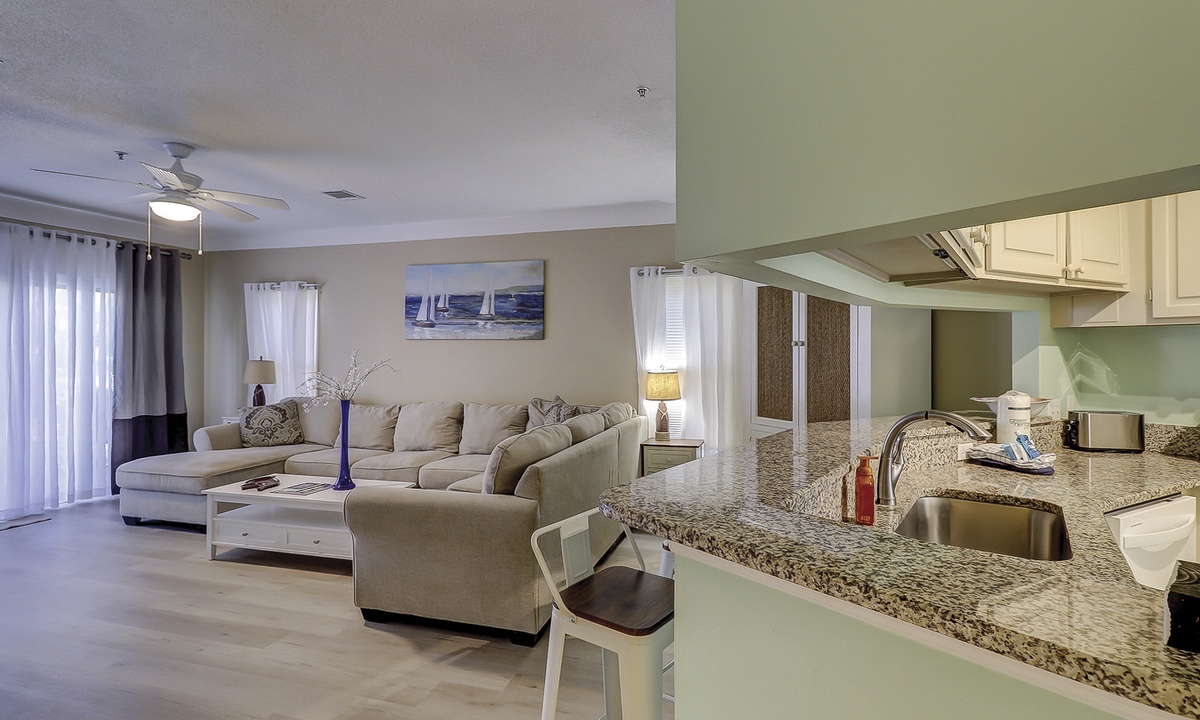 As you walk in the front door, you’ll be greeted with an open floor plan and coastal colors. The living area is outfitted with a comfortable sectional sofa, large wall-mounted flat screen TV and access to the private patio. The patio has seating for 4 guests with views of the complex pool.