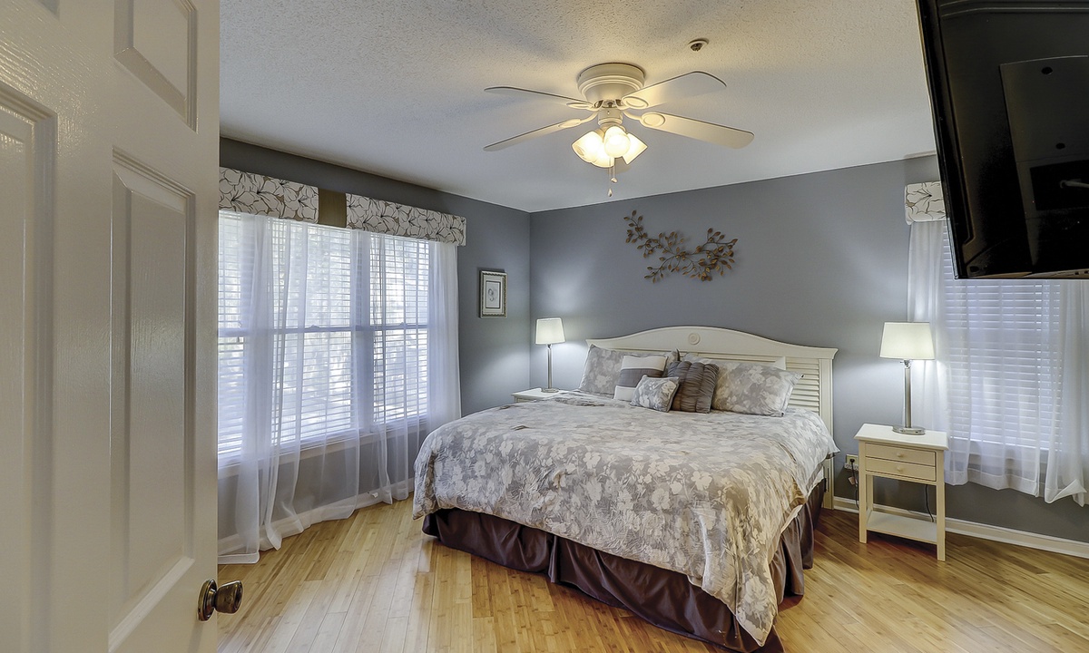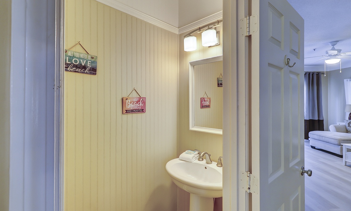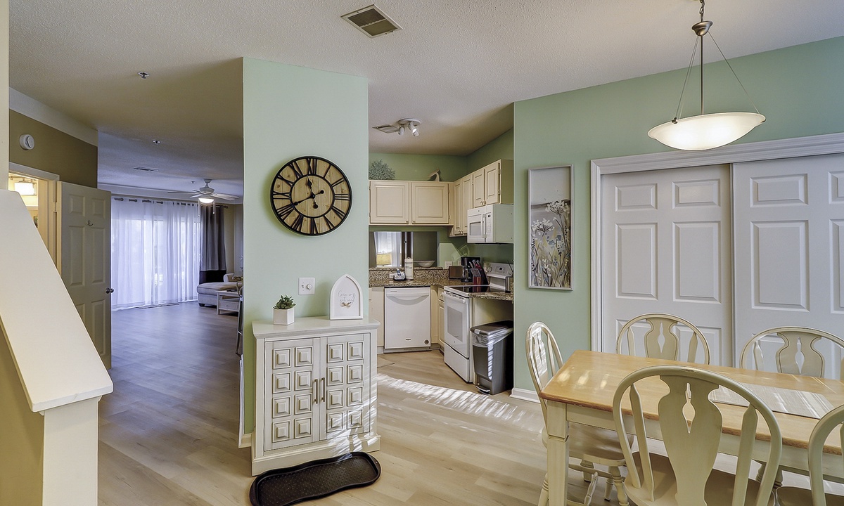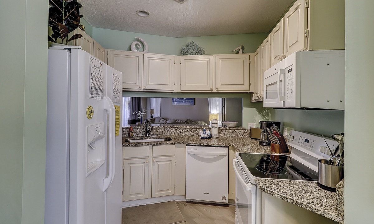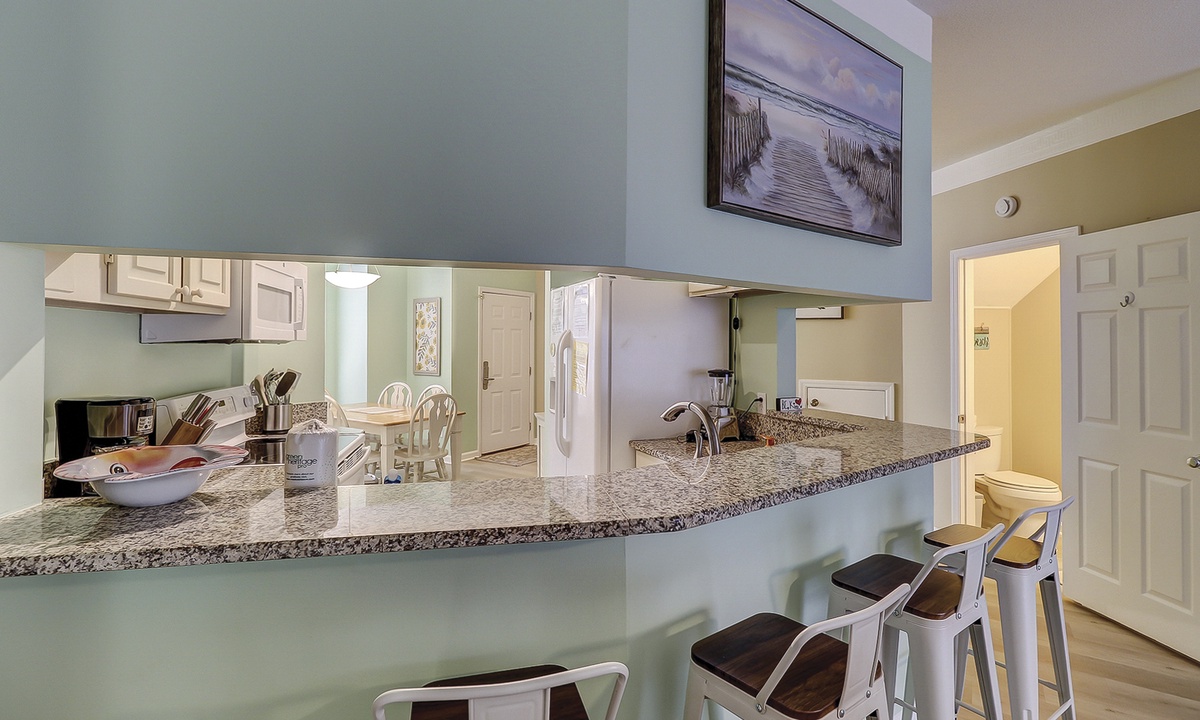 As you walk in the front door, you’ll be greeted with an open floor plan and coastal colors. The living area is outfitted with a comfortable sectional sofa, large wall-mounted flat screen TV and access to the private patio. The patio has seating for 4 guests with views of the complex pool.