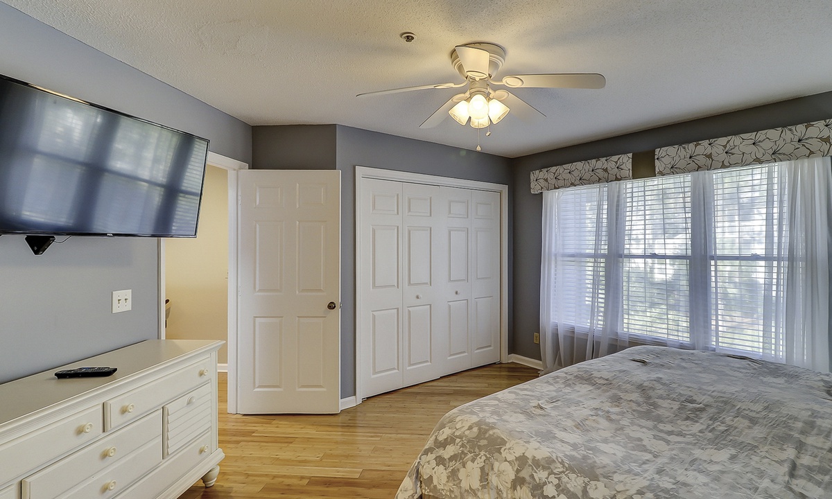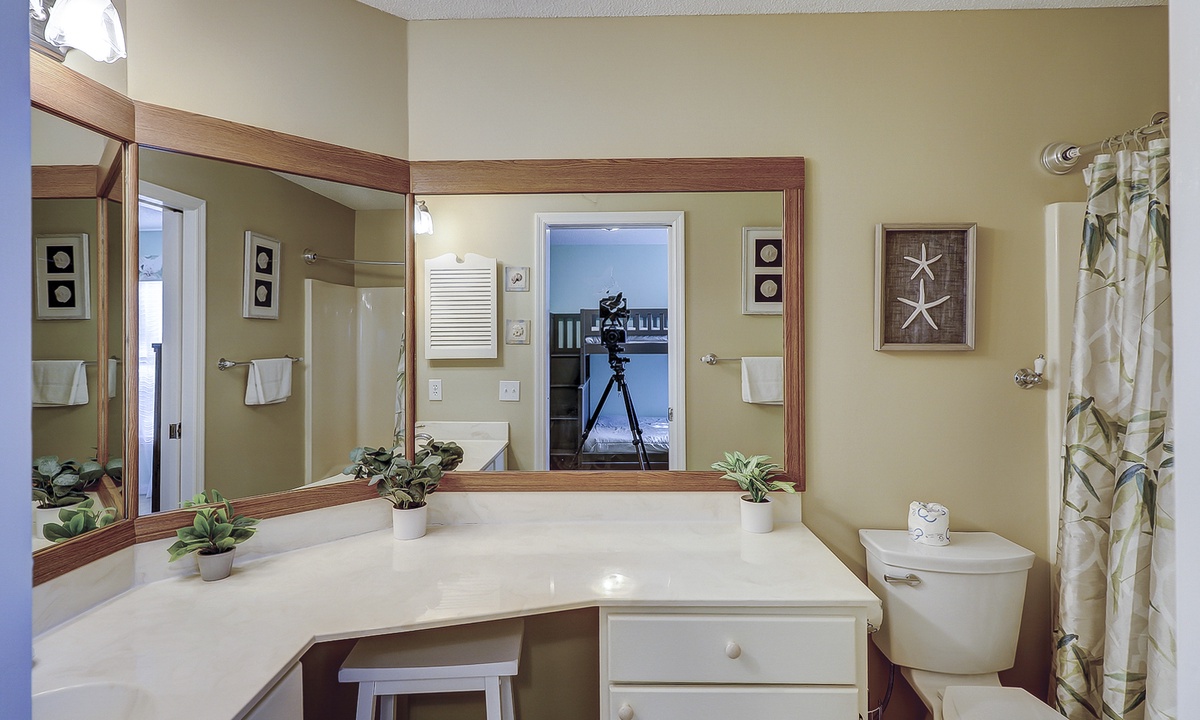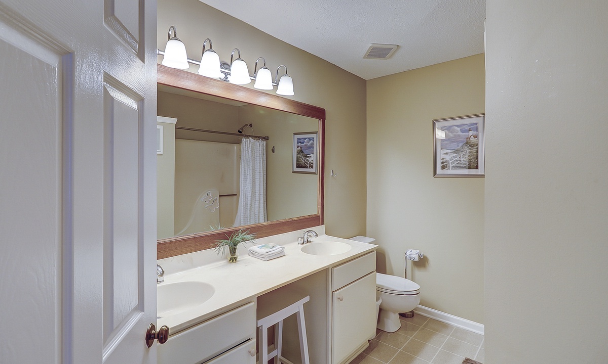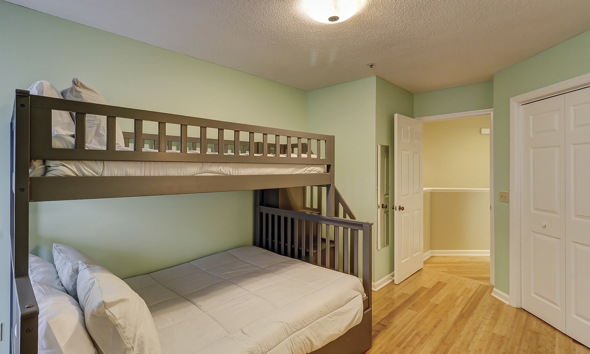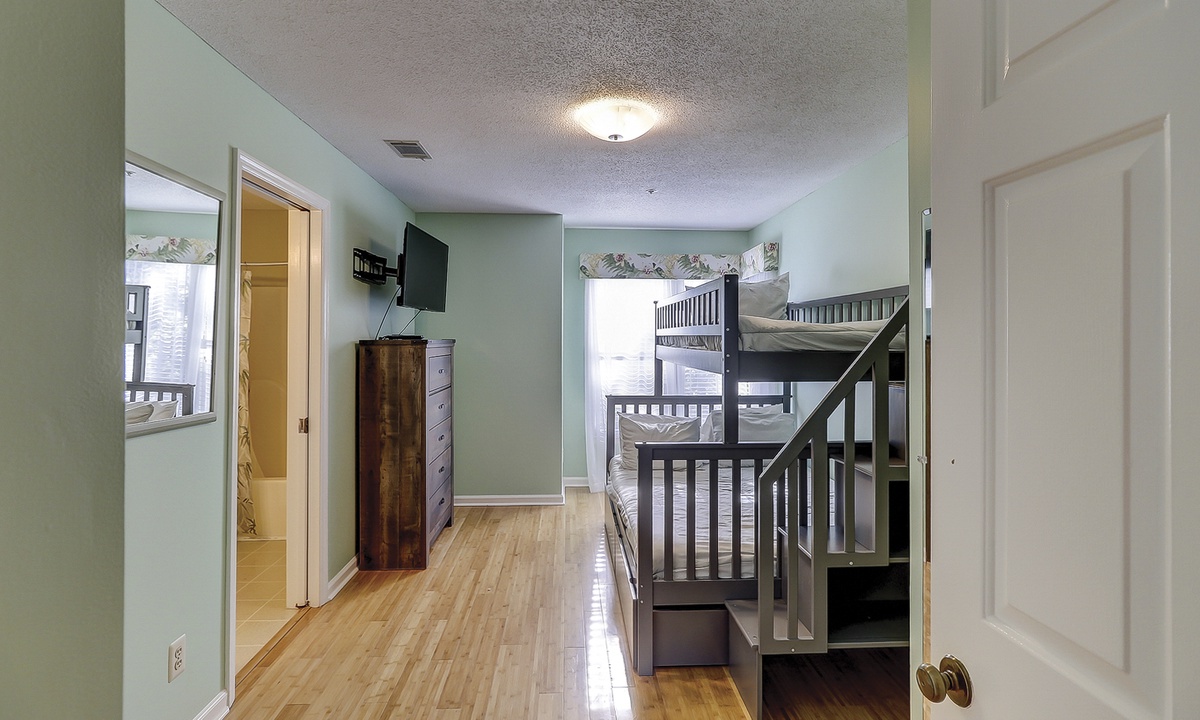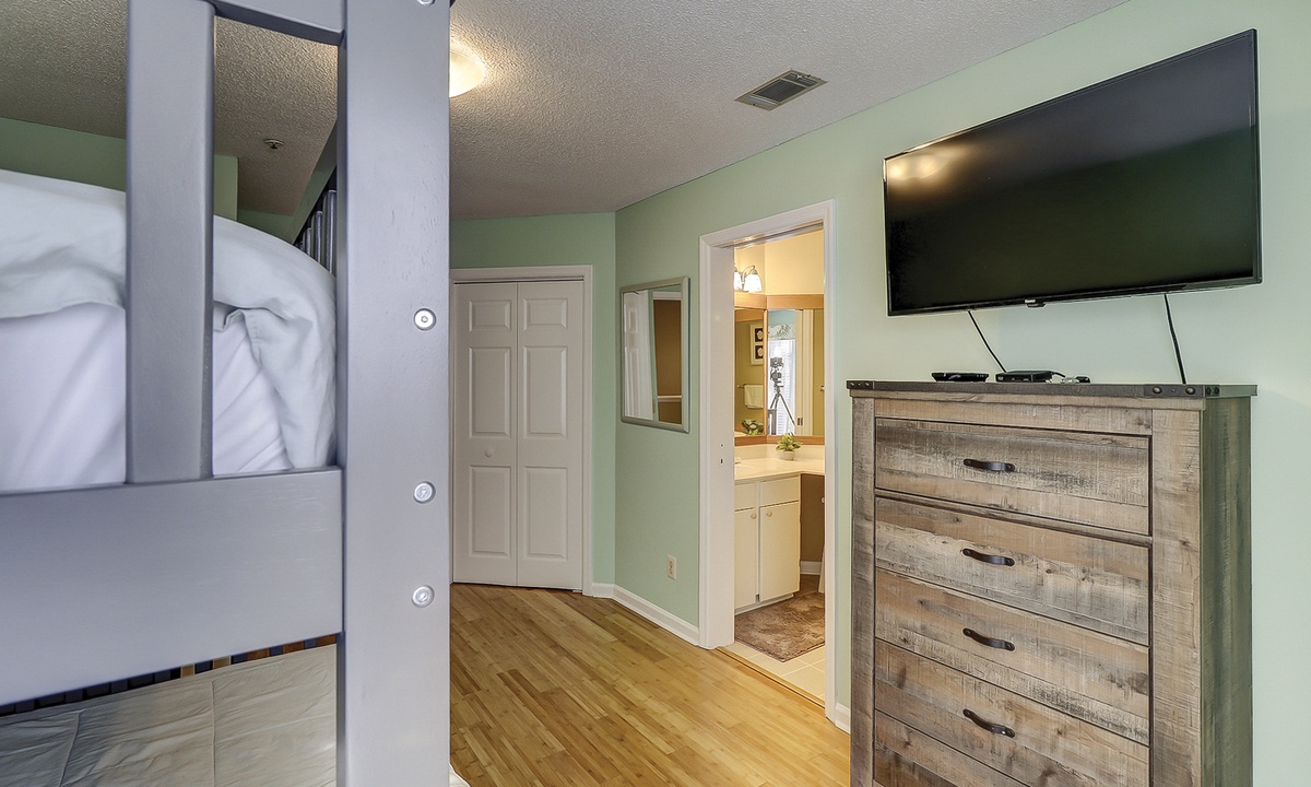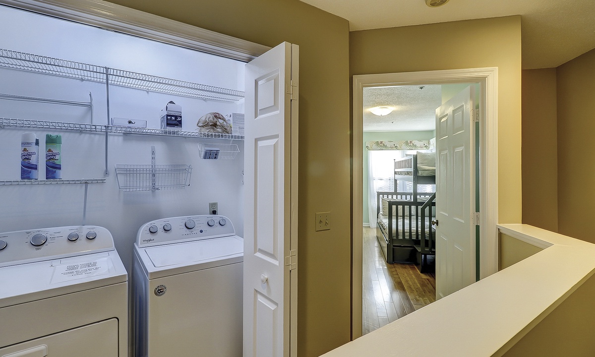 Both bedrooms and the laundry area are located on the 2nd floor. The primary bedroom has a king bed with a new mattress, a wall-mounted flat screen TV and access to a private bathroom with a tub/shower combination. The guest bedroom features a brand-new bunk bed with a full size bunk on the bottom and a twin bunk on the top. This room has a TV as well and a private bathroom with a large vanity area and a tub/shower combination.