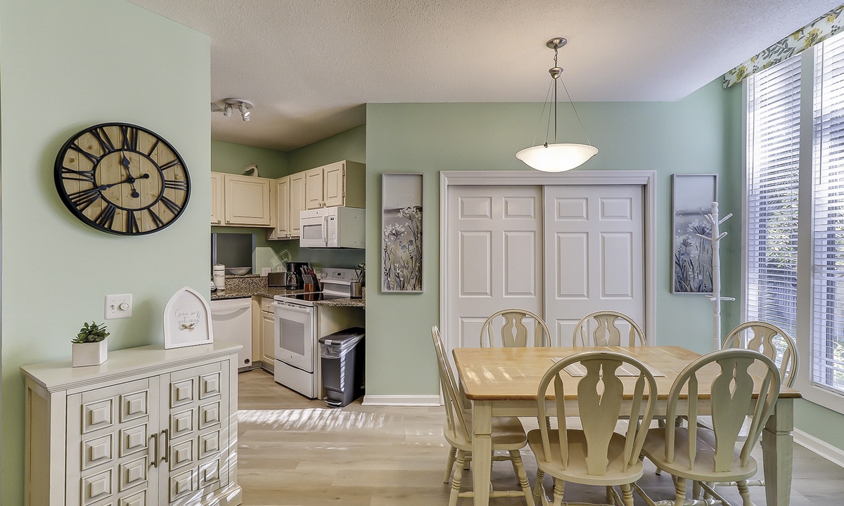 The kitchen area features granite counters, plenty of cabinet space, a pantry area and all you’ll need to cook a meal for your guests. The dining table seats 6 comfortably with large bay windows showcasing the front of the property.