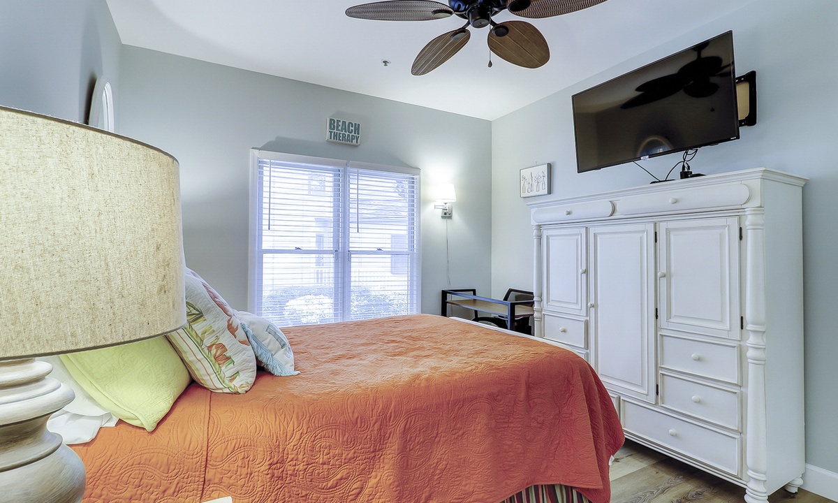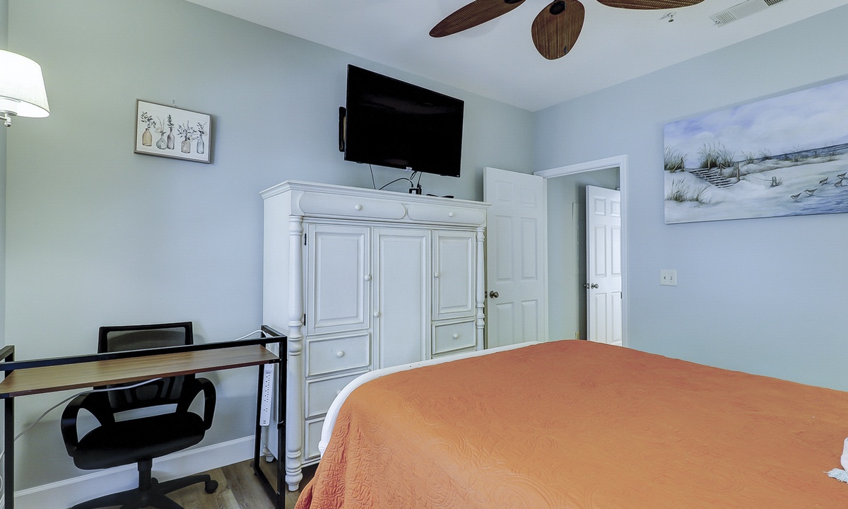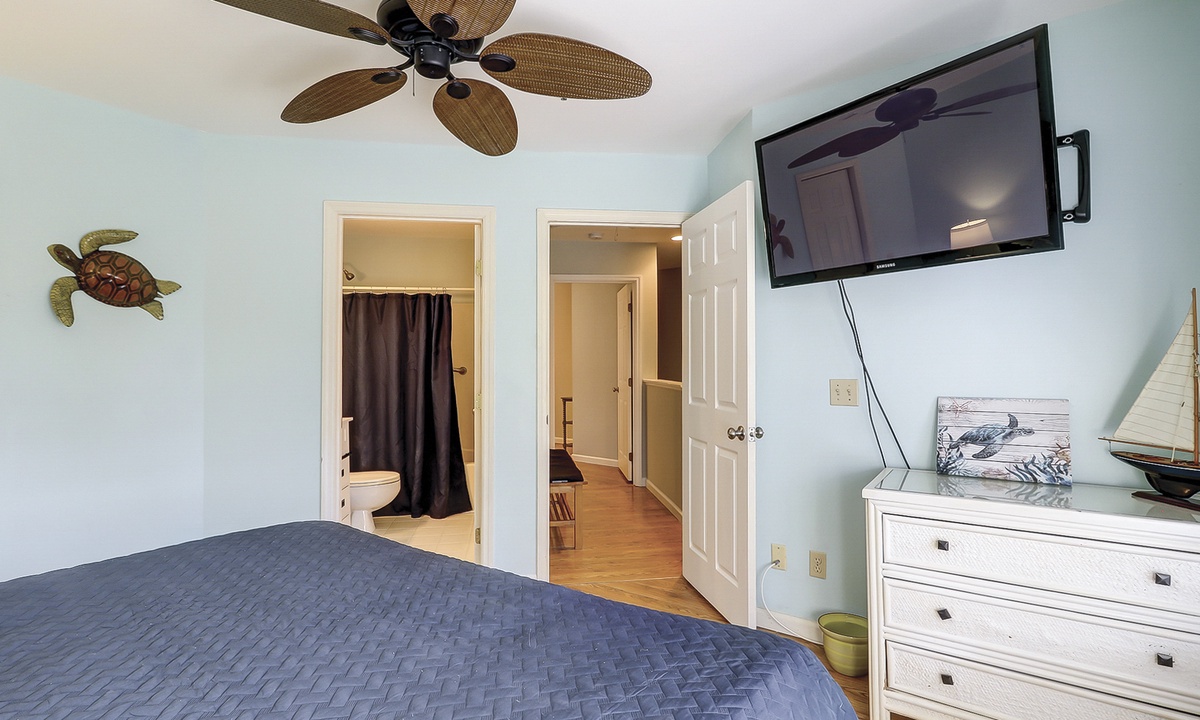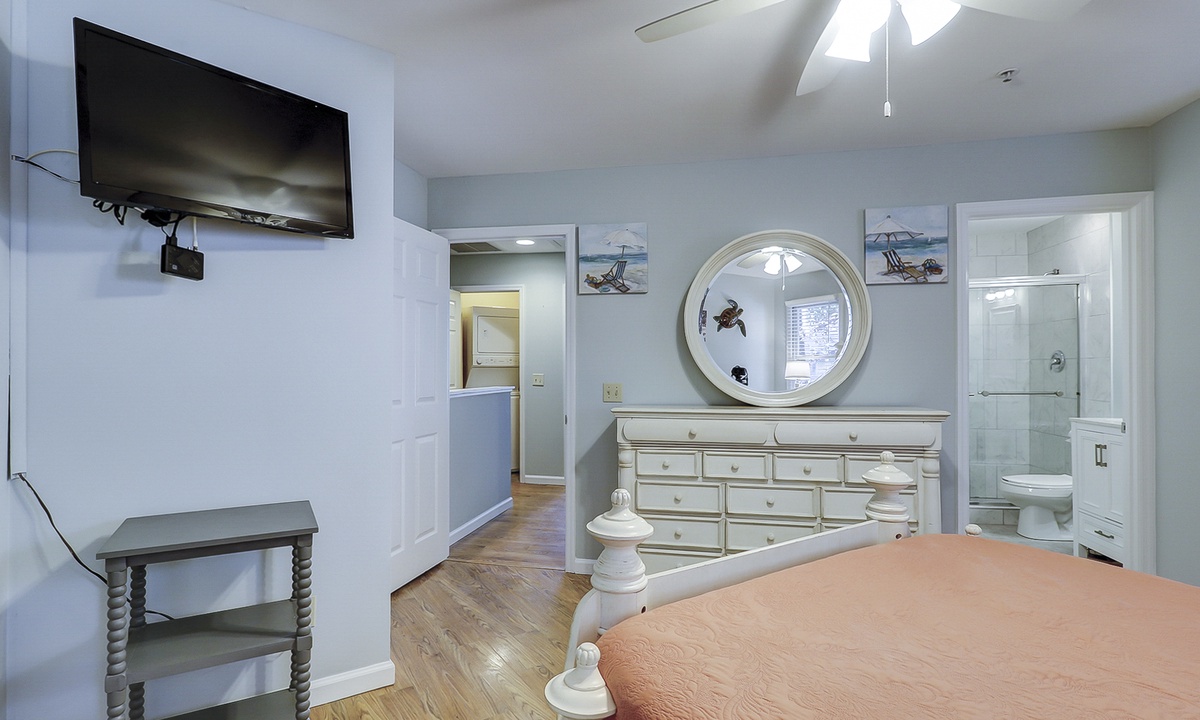 The first of 3 bedrooms is located on the main level. This room features a queen bed, flat screen TV, work station and access to a hall bath with a ornately tiled walk-in shower. The remaining 2 bedrooms are located on the 2nd level. The first bedroom at the top of the stairs features a king bed, flat screen TV and a private bathroom with a tub/shower combination. The third bedroom features a queen bed, flat screen TV and a private bathroom with a large, tiled walk-in shower.