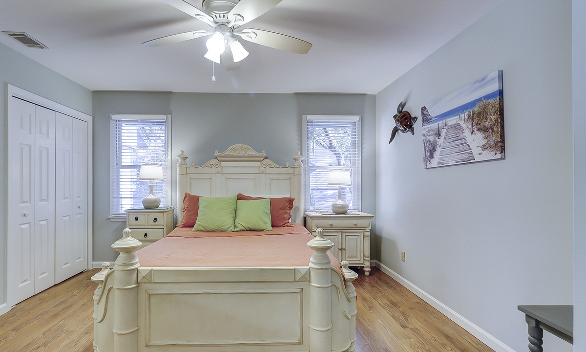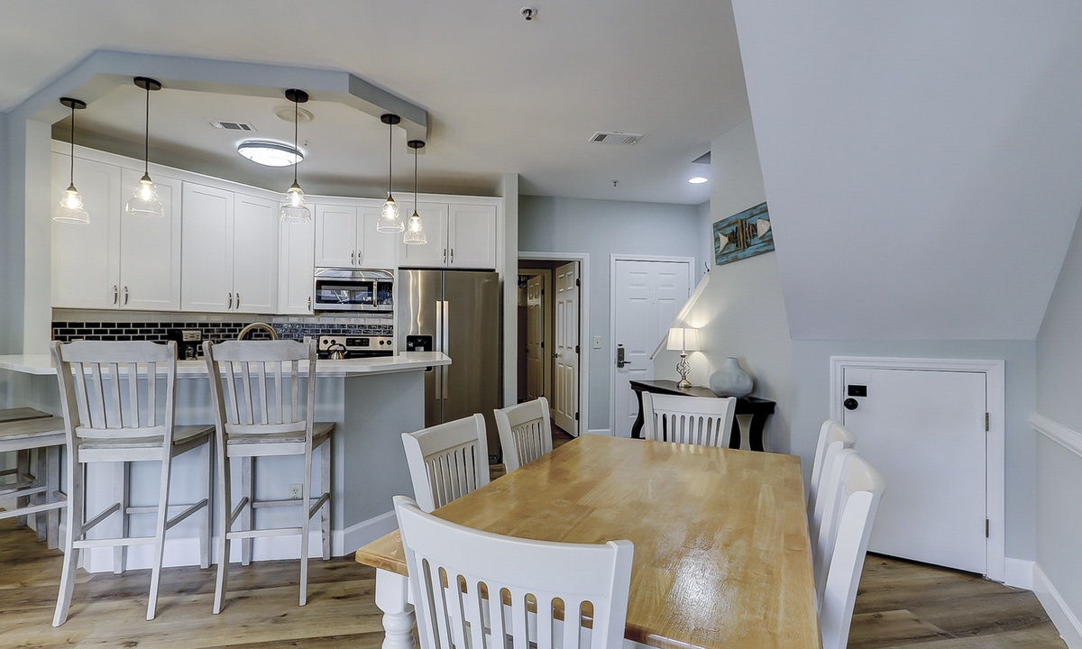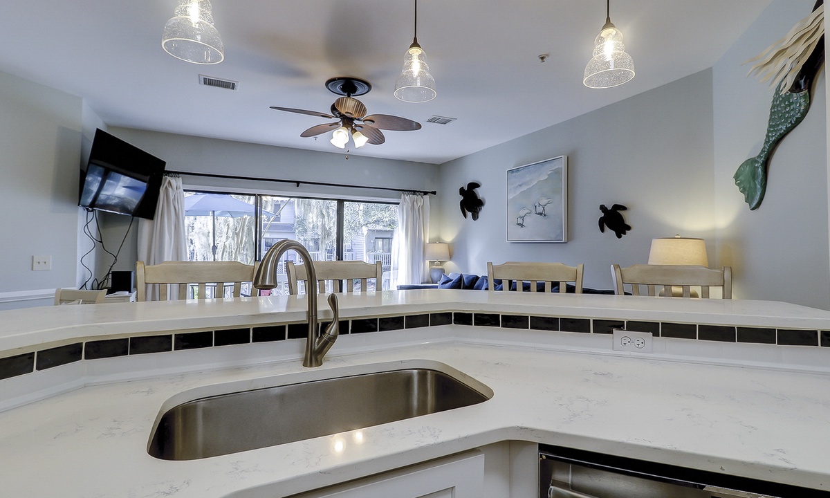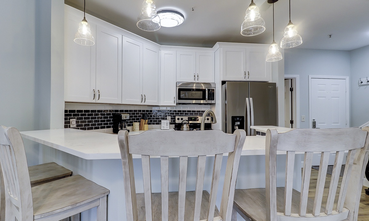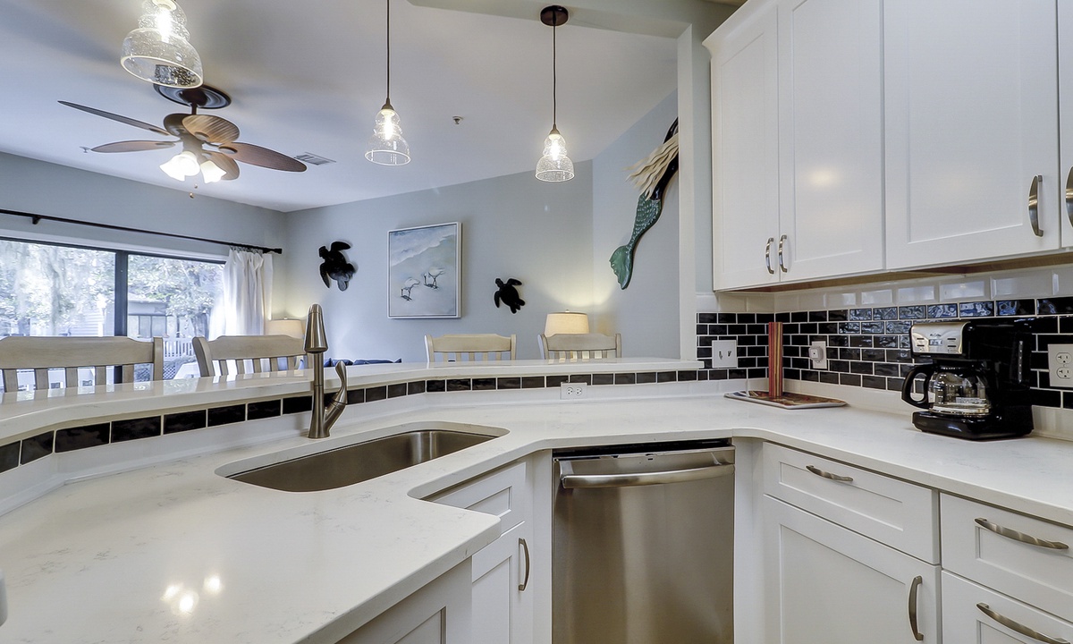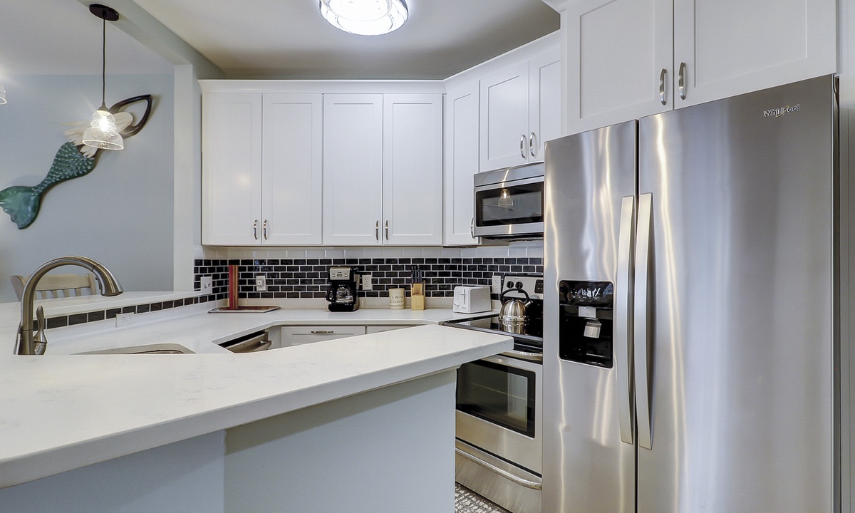 The living area features comfortable furniture, including a sleeper sofa, a Smart TV and access to the private porch overlooking the lagoon. The fully renovated kitchen features stainless appliances and plenty of cabinet and counter space. There is seating for 6 at the dining table with additional seating for 4 at the kitchen bar.