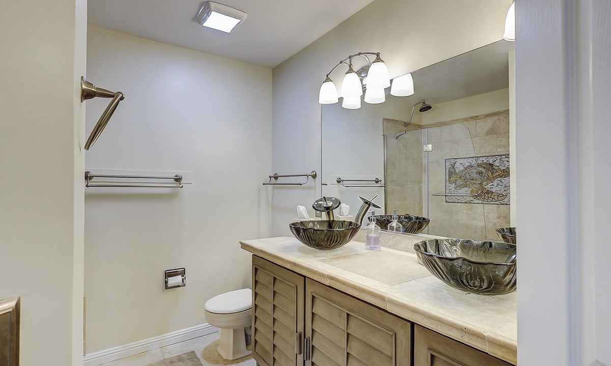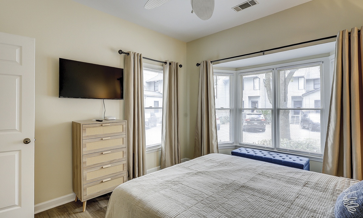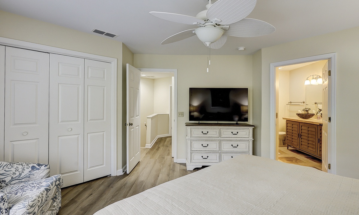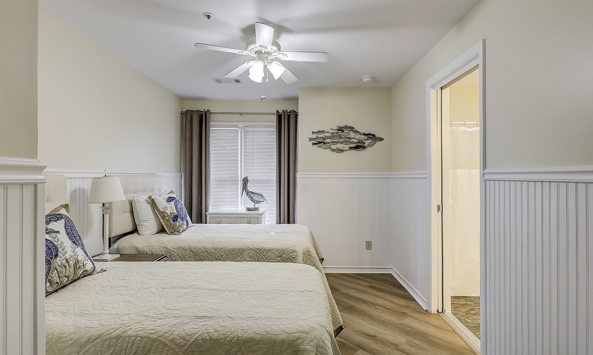 Up the stairs you'll find the remaining bedrooms. The primary bedroom has a king bed, Smart TV and a private bathroom with a tiled walk-in shower. The second bedroom has 2 twin beds, a Smart TV and a private bathroom with a tub/shower.