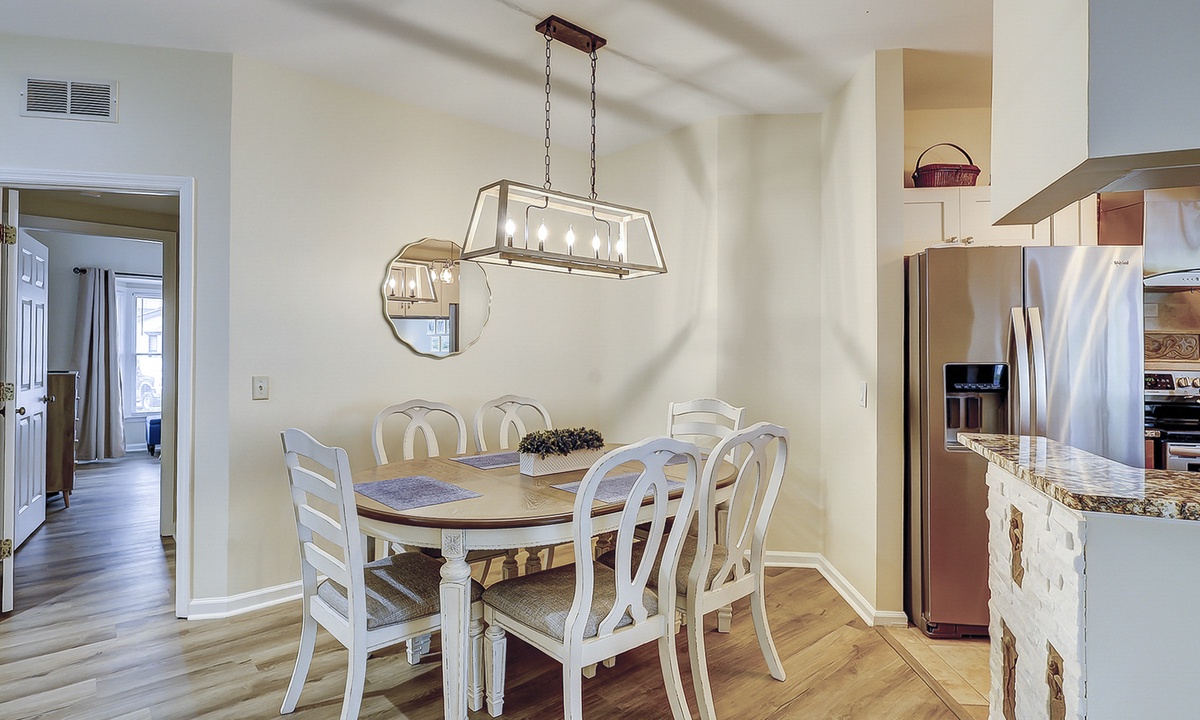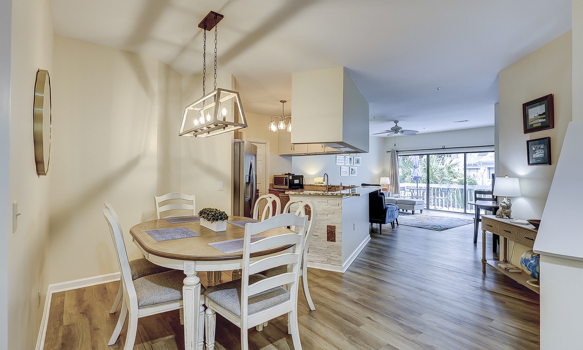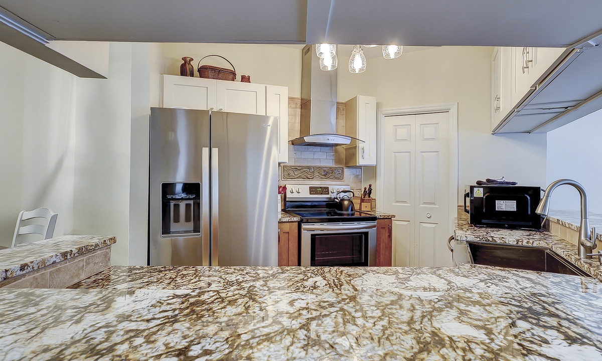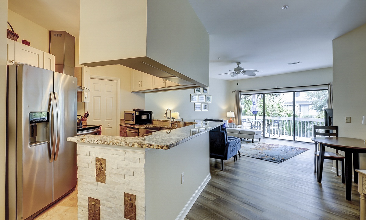 The main level of the property is open-concept. The living area features comfortable furnishings, a Smart TV and access to the private patio through sliding glass doors. Past the living area, you'll find the kitchen with stainless appliances and granite counters. The dining table seats 6 comfortably with additional seating for 2 at a hightop table off the living area.