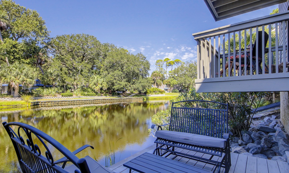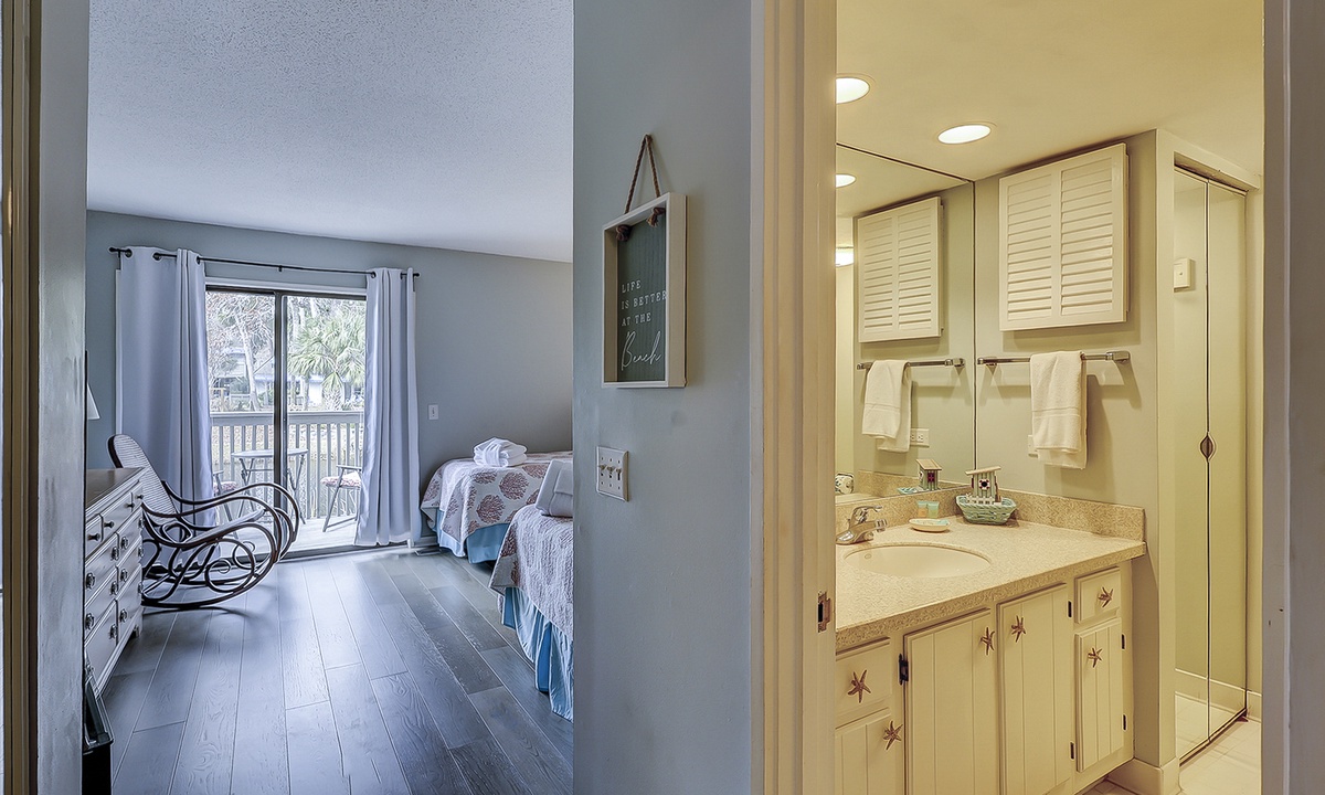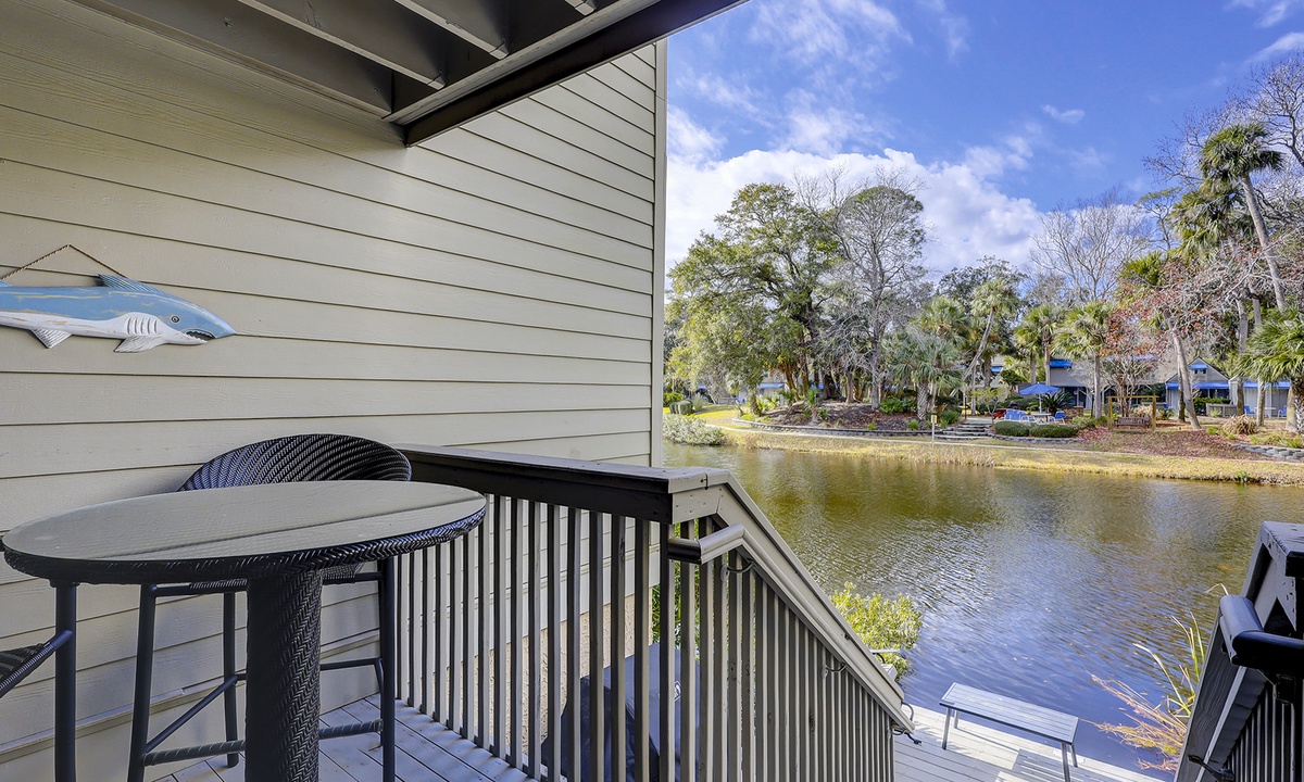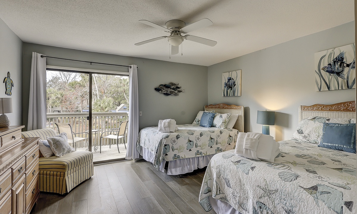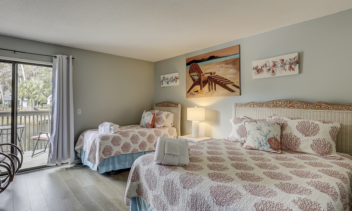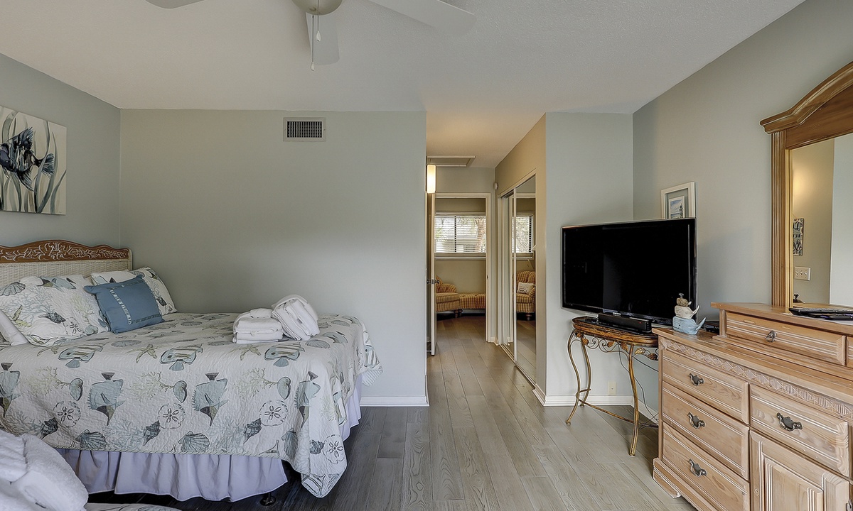 The guest bedroom on this level features a queen bed and a twin bed, as well as a flat screen TV, private bathroom and a patio with bistro set overlooking the lagoon.
