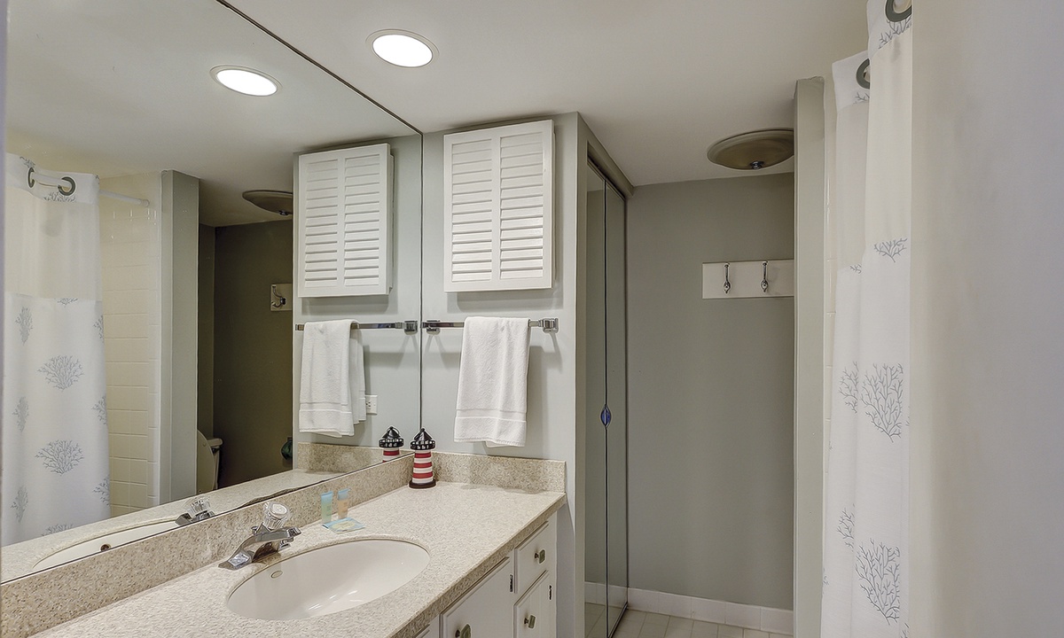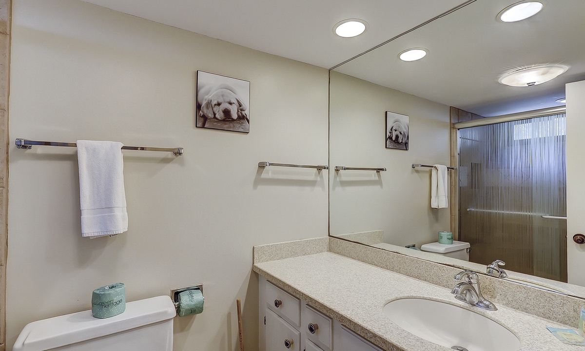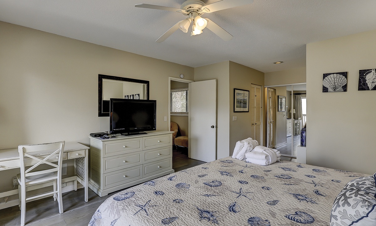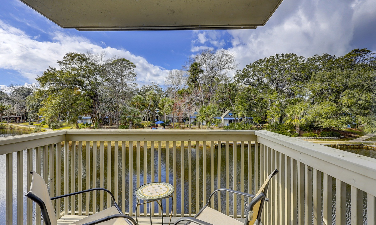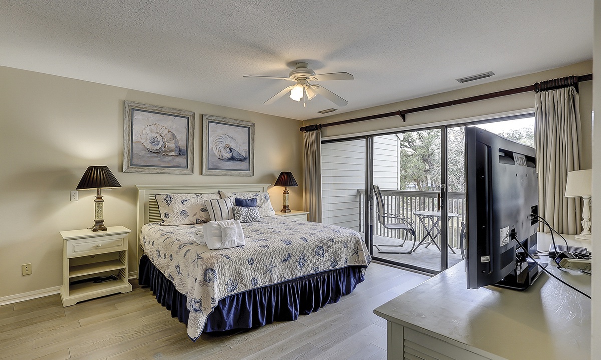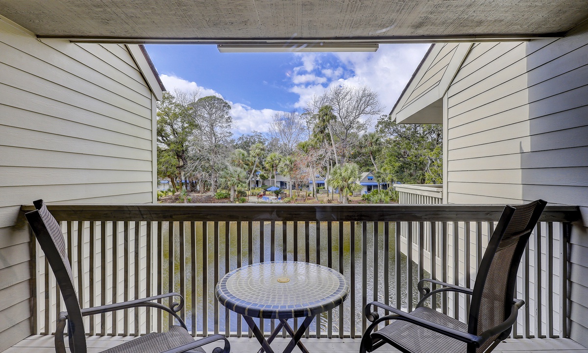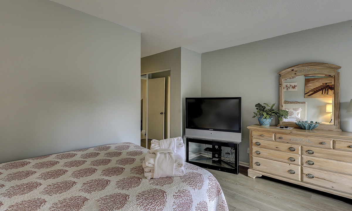 The guest bedroom on this level features a queen bed and a twin bed, as well as a flat screen TV, private bathroom and a patio with bistro set overlooking the lagoon.