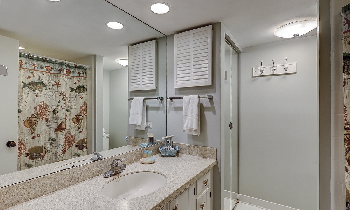 The remaining two bedrooms, as well as a reading nook, are located on the 2nd level. The 2nd guest room features two full size beds, a flat screen TV, private bathroom and balcony. The spacious main bedroom features a king bed, flat screen TV, private bathroom and balcony.