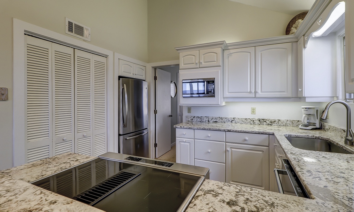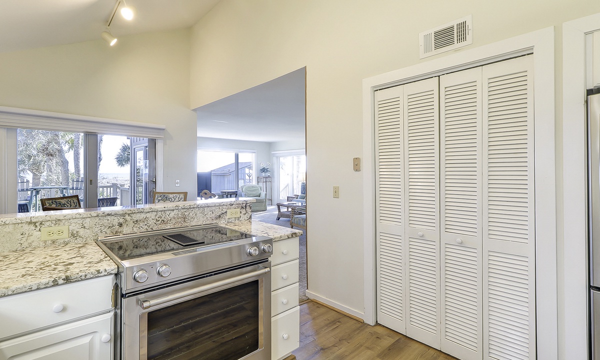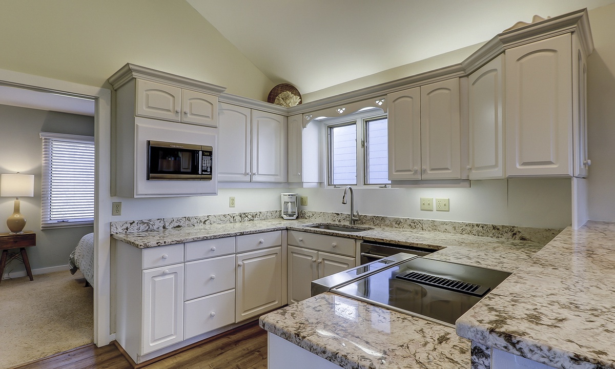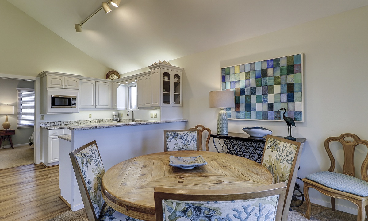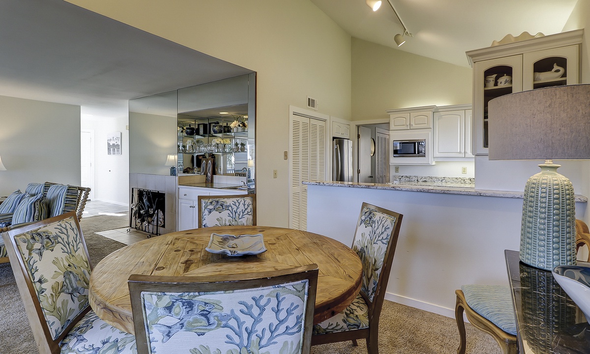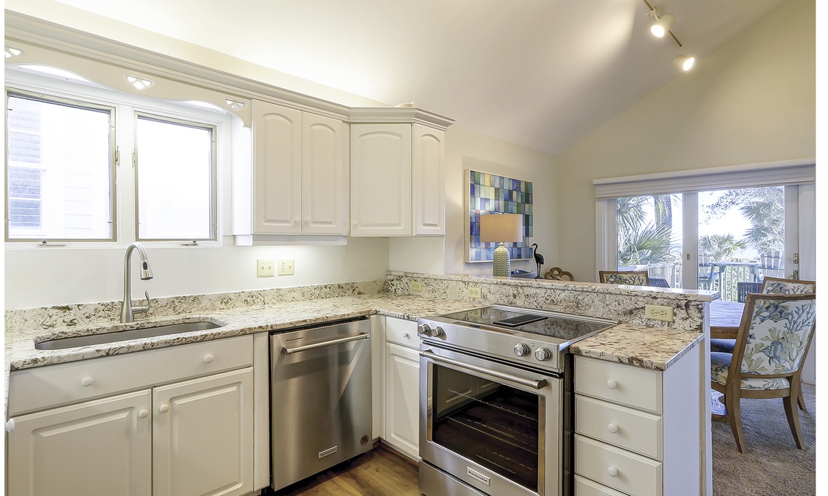 The kitchen is outfitted with granite counters and stainless appliances, and there is seating for 6 at the dining table.