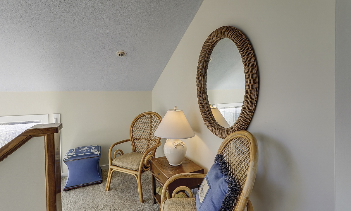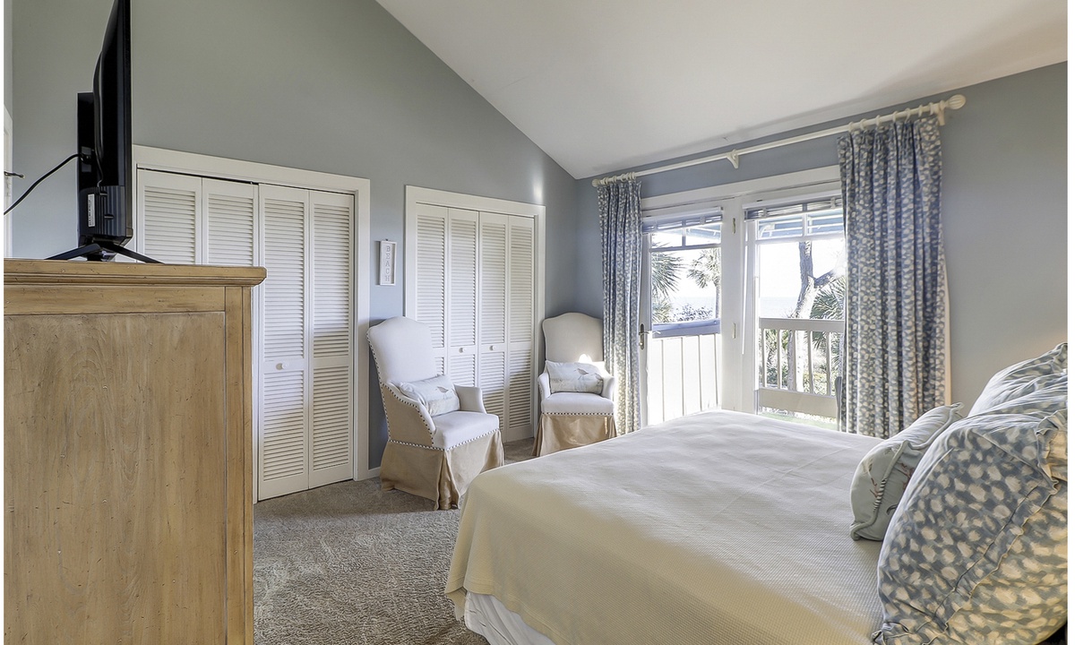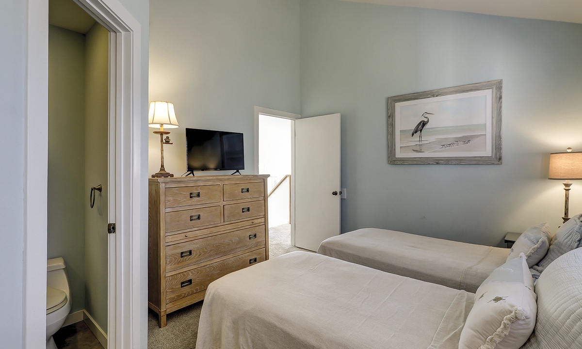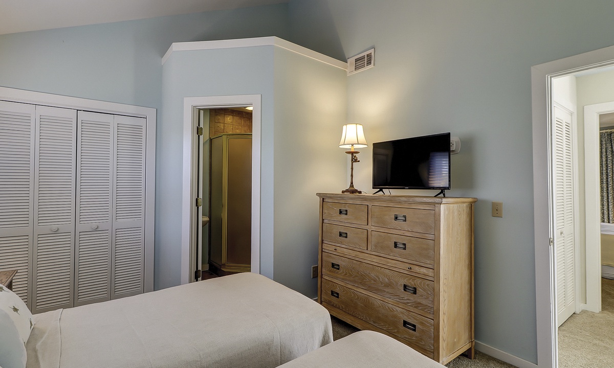 Up the stairs you'll find the main bedroom with a king bed, Smart TV, private balcony overlooking the ocean and a private bathroom with a walk-in shower. There is also a room with two twin beds on this level. This guest room has a TV and a private bathroom with a walk-in shower.