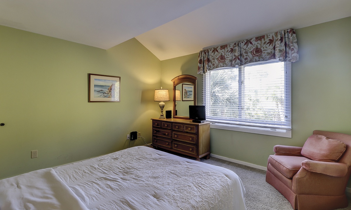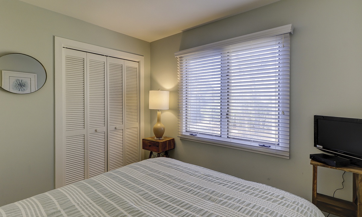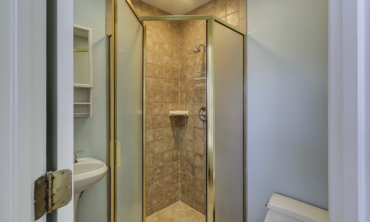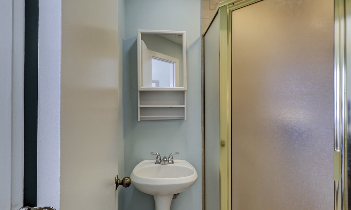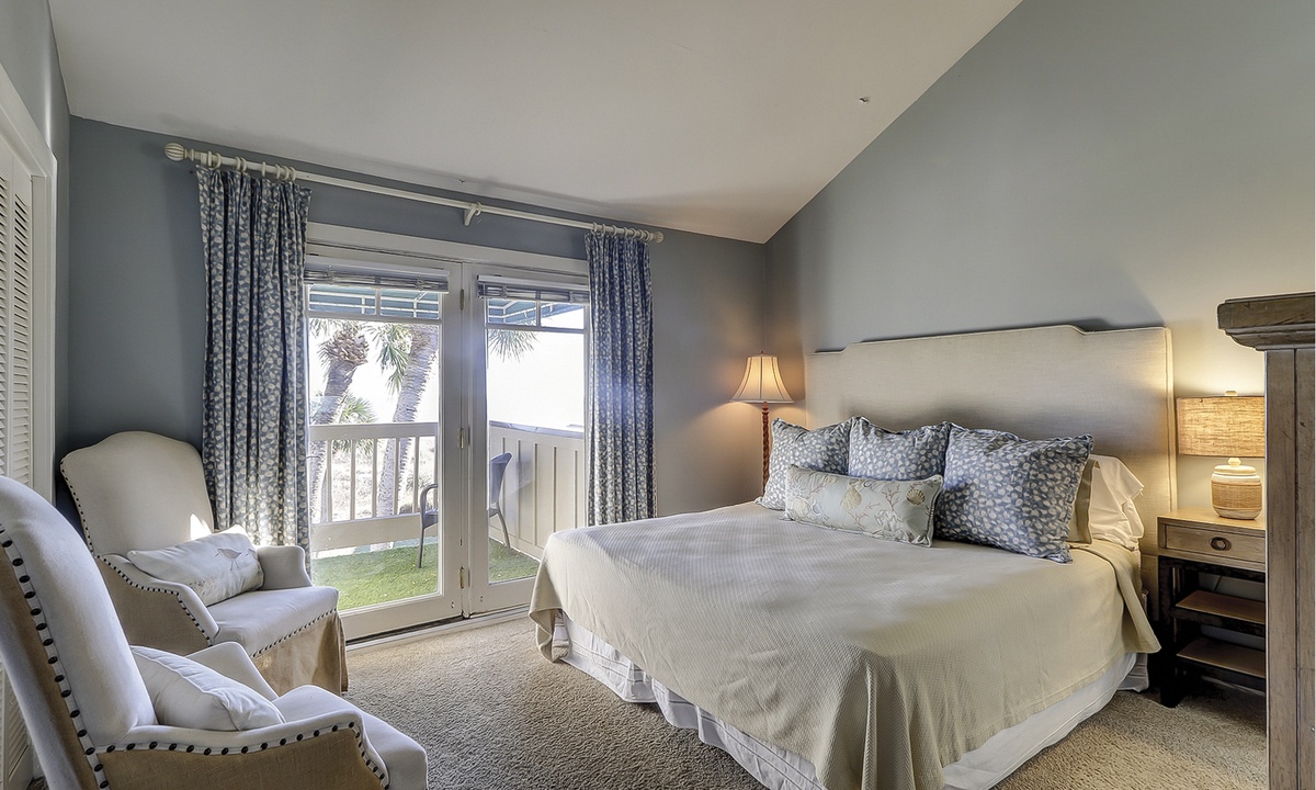 Up the stairs you'll find the main bedroom with a king bed, Smart TV, private balcony overlooking the ocean and a private bathroom with a walk-in shower. There is also a room with two twin beds on this level. This guest room has a TV and a private bathroom with a walk-in shower.
