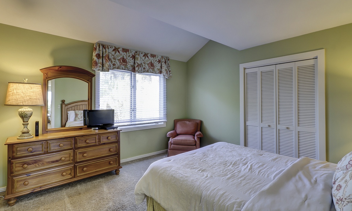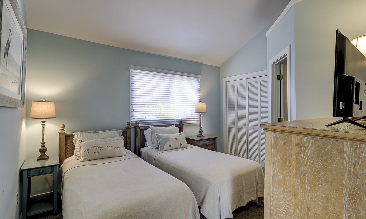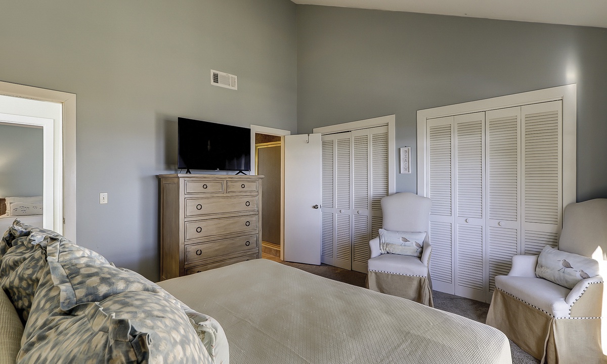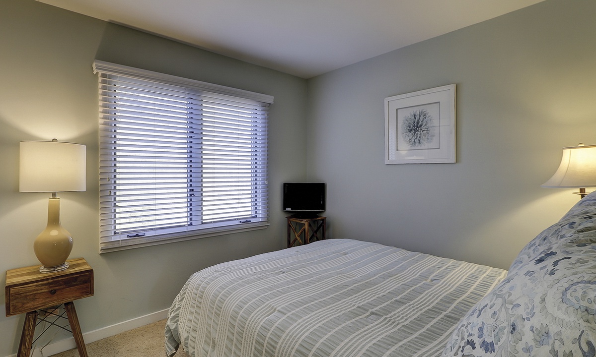 Two of the bedrooms are located on the main level. Both bedrooms have queen beds, flat screen TVs and share access to a hall bathroom.