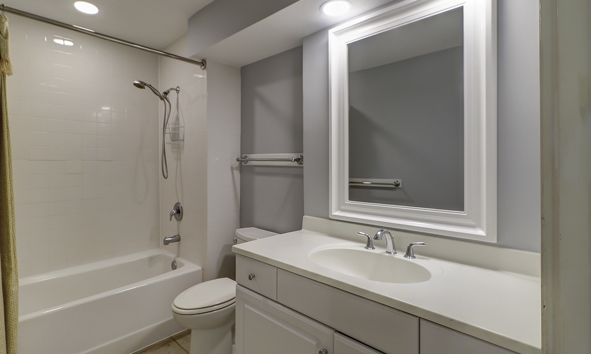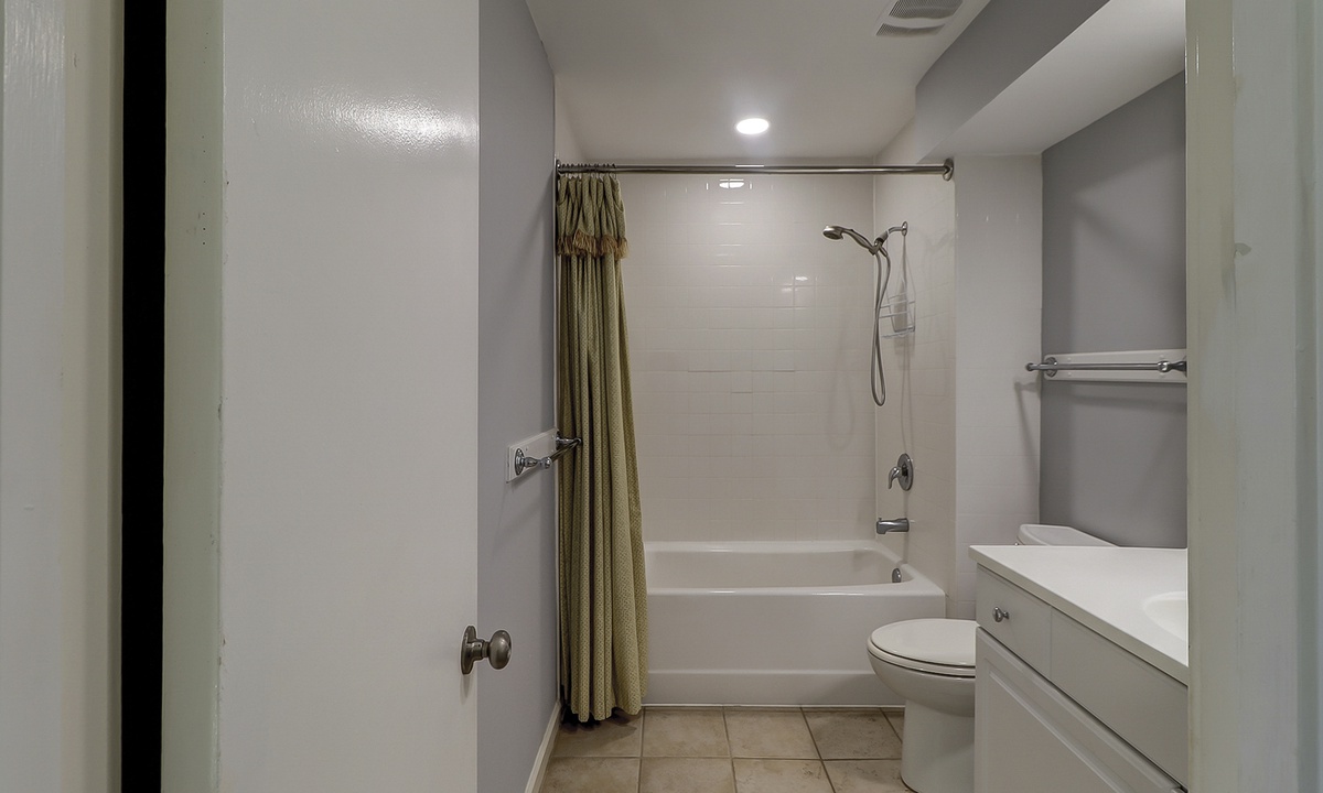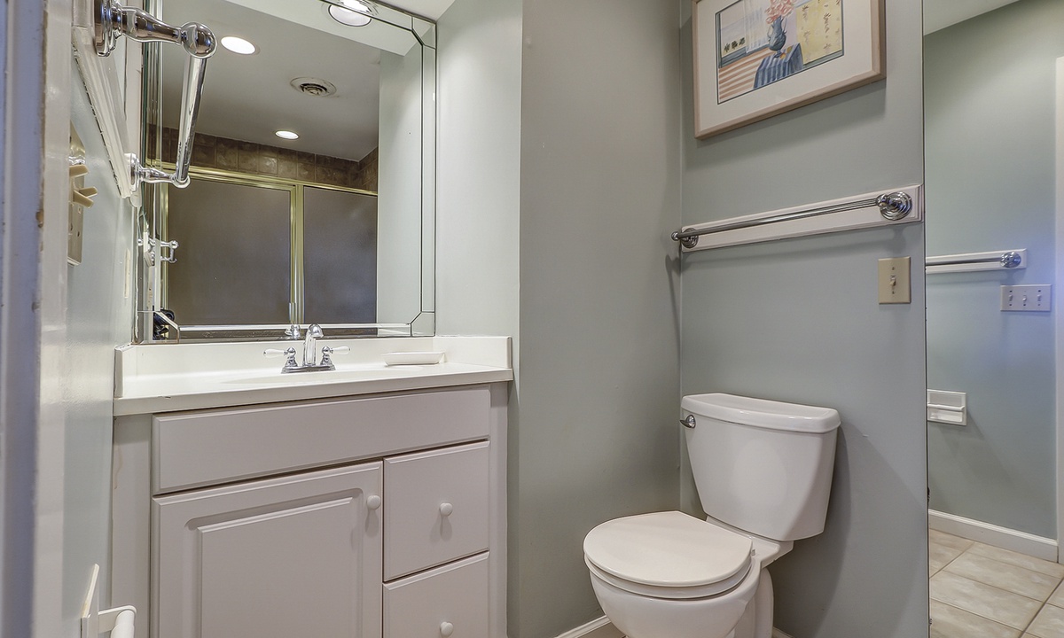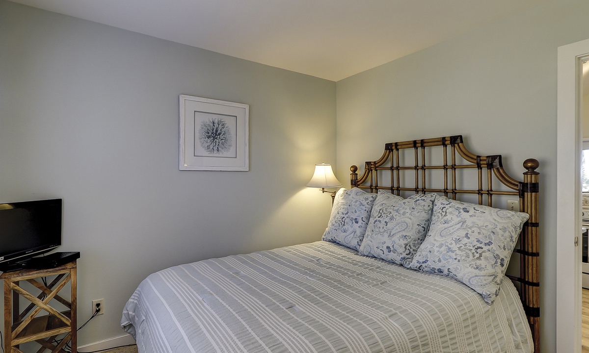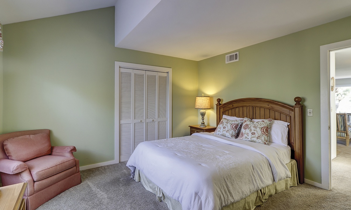 Two of the bedrooms are located on the main level. Both bedrooms have queen beds, flat screen TVs and share access to a hall bathroom.