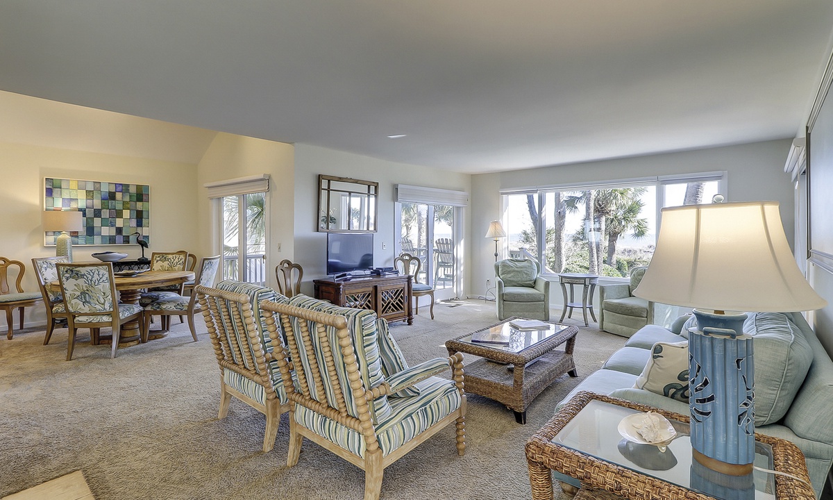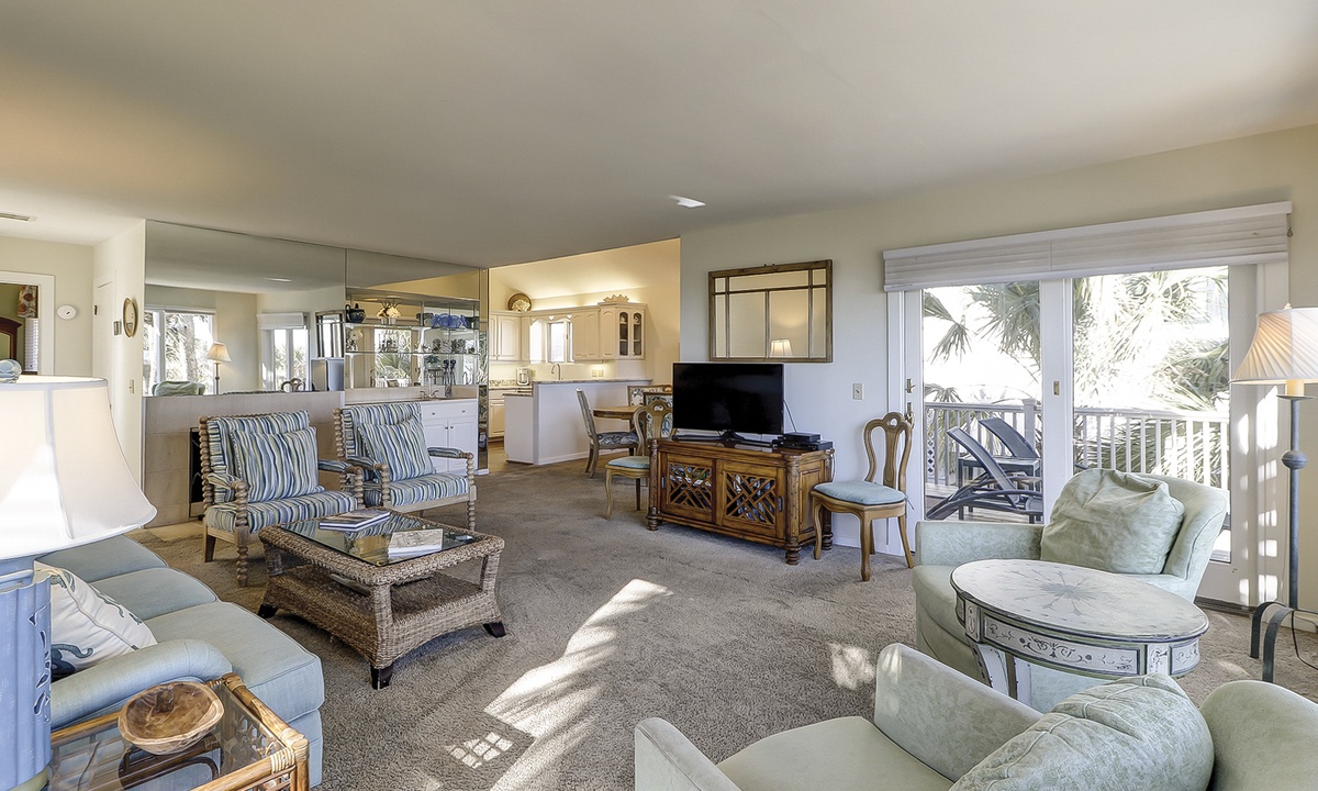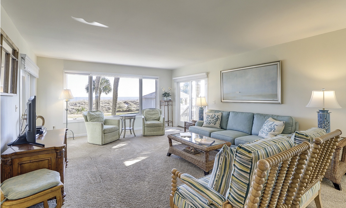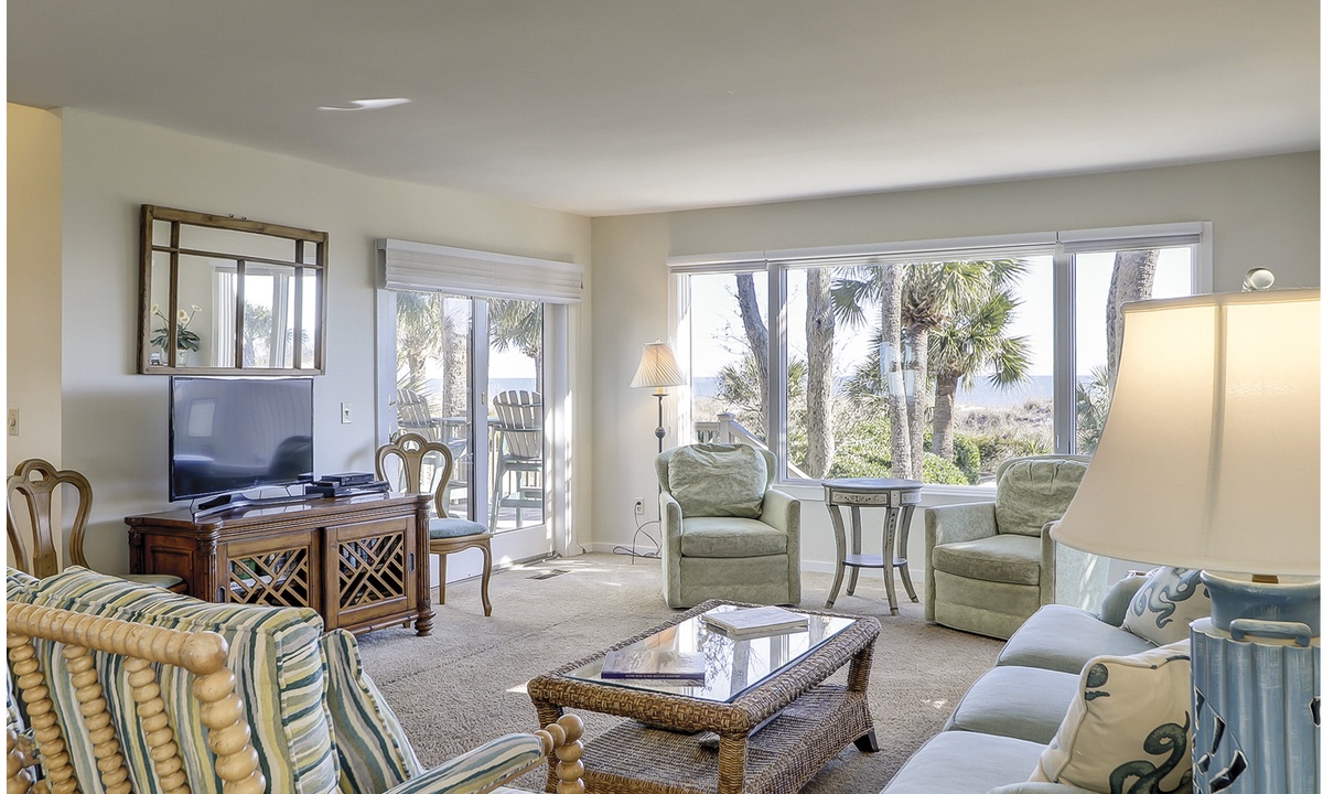 The living area offers comfortable furnishings, a Smart TV and access to the patio with ocean and pool views.