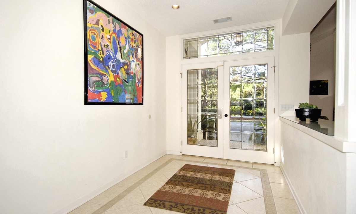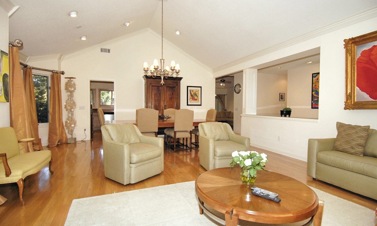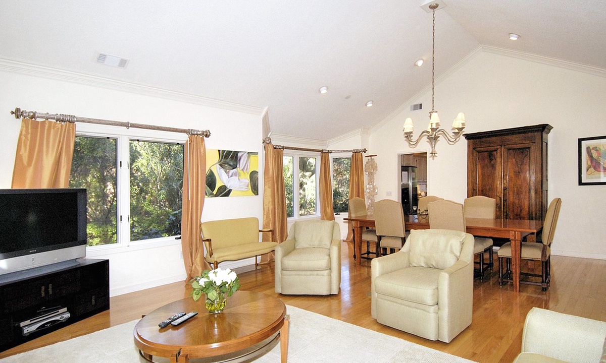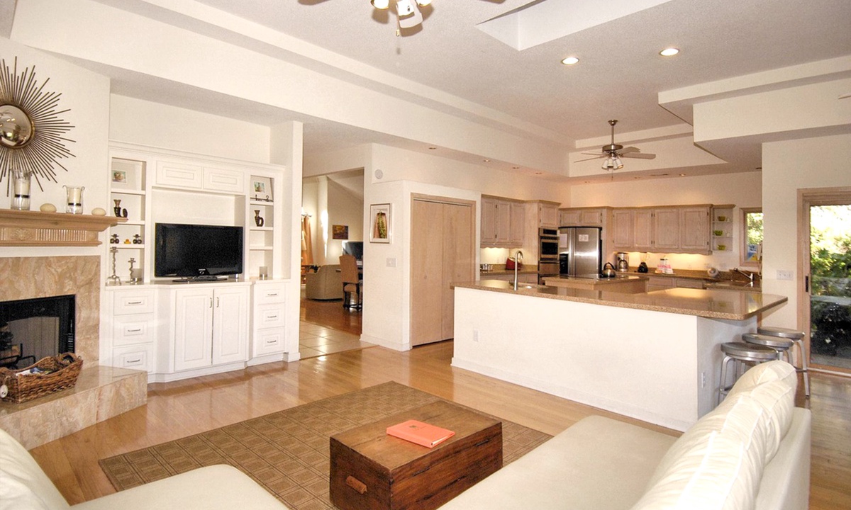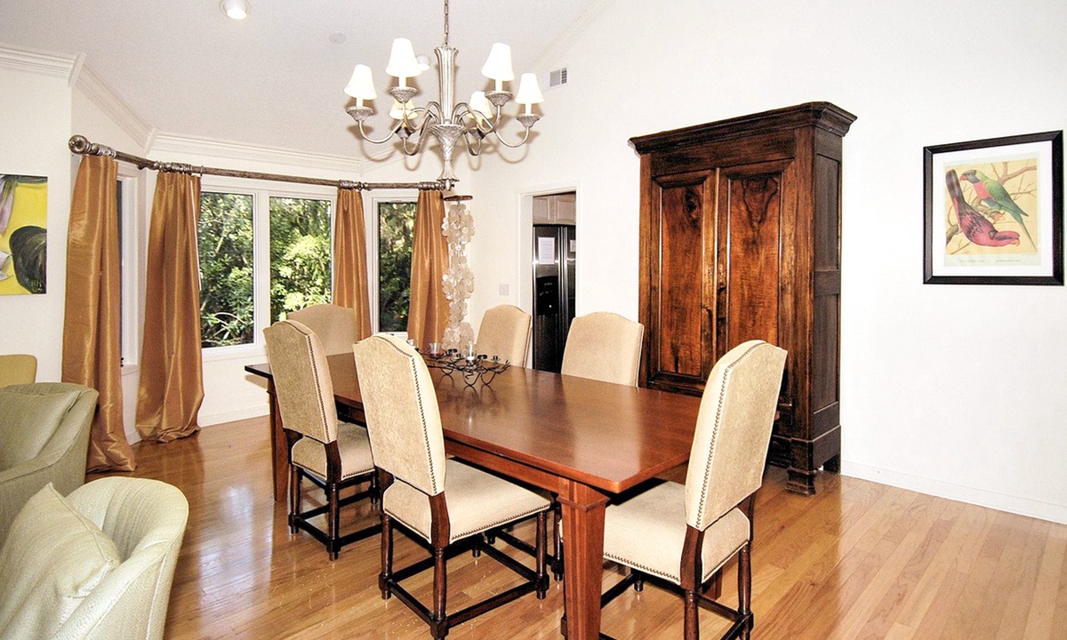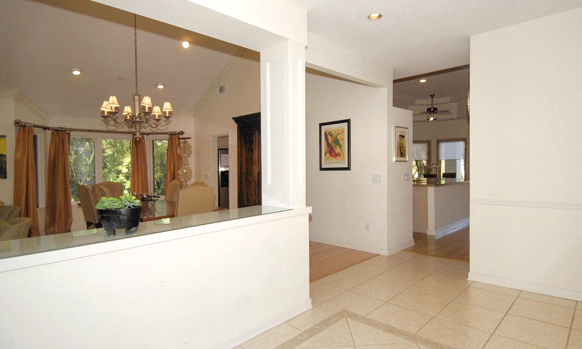 To the left of the beautifully tiled foyer is a very traditional living/dining room with a cathedral ceiling and hardwood flooring. The formal dining area has a large table with seating for 6, an antique armoire, and a bay window with a natural and partial lagoon view. In the adjacent living room is a very tasteful & comfortable seating group, and a large-screen TV. **Fireplace is not for guest use.**