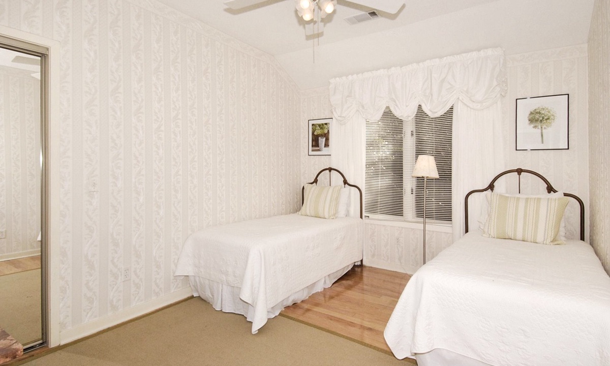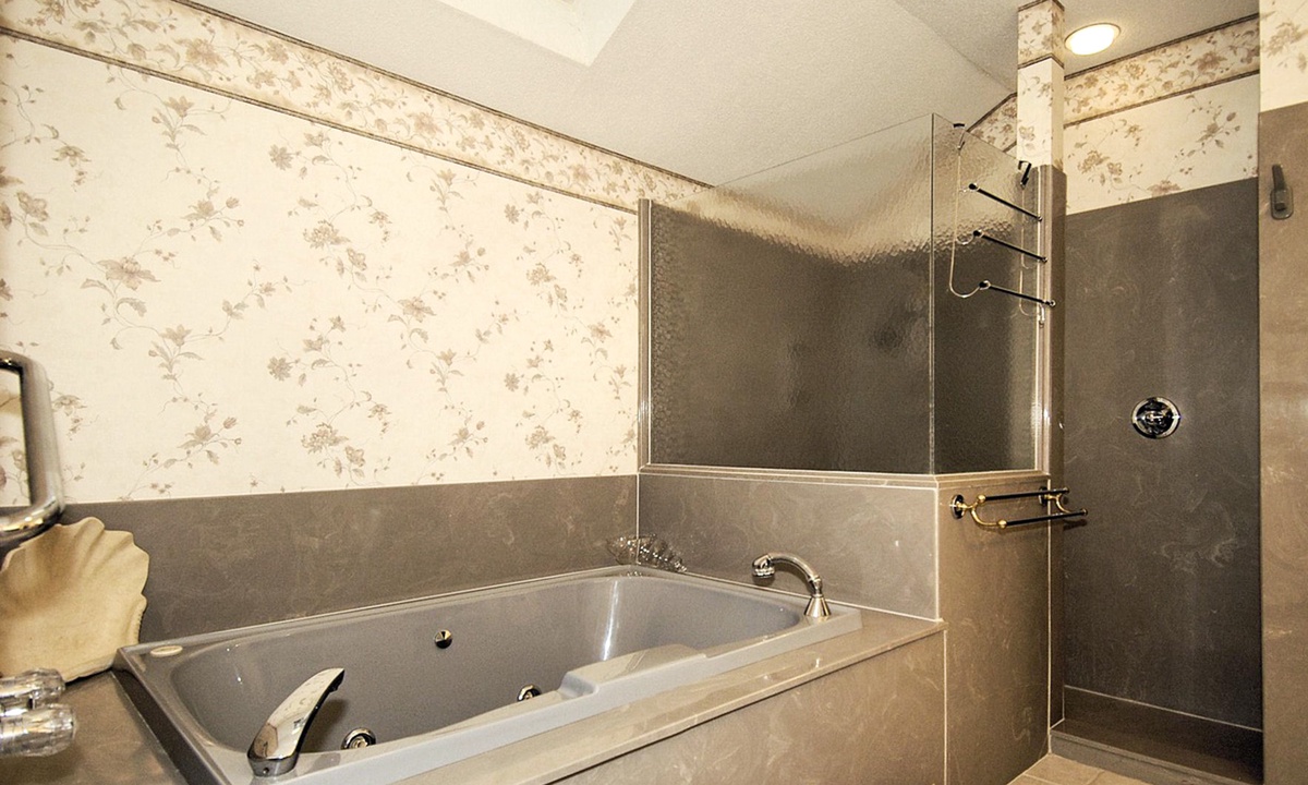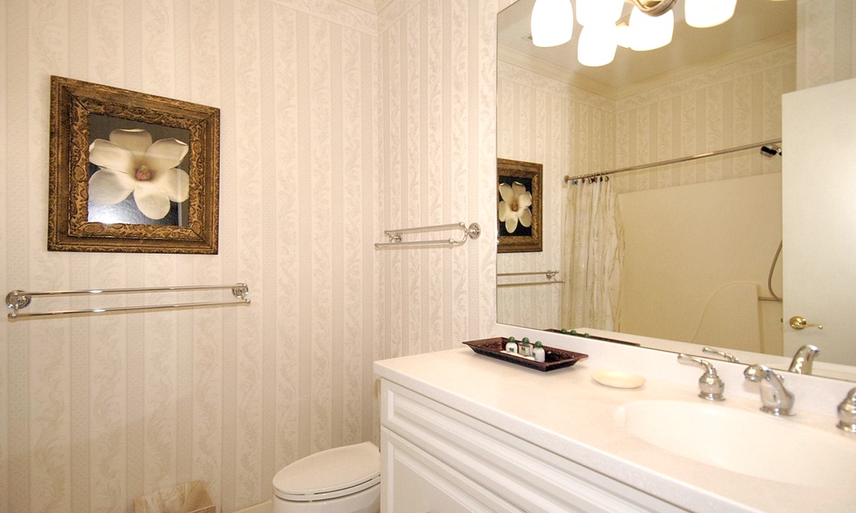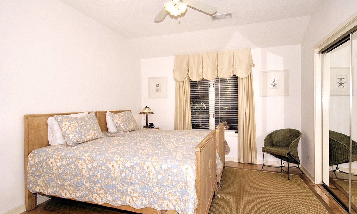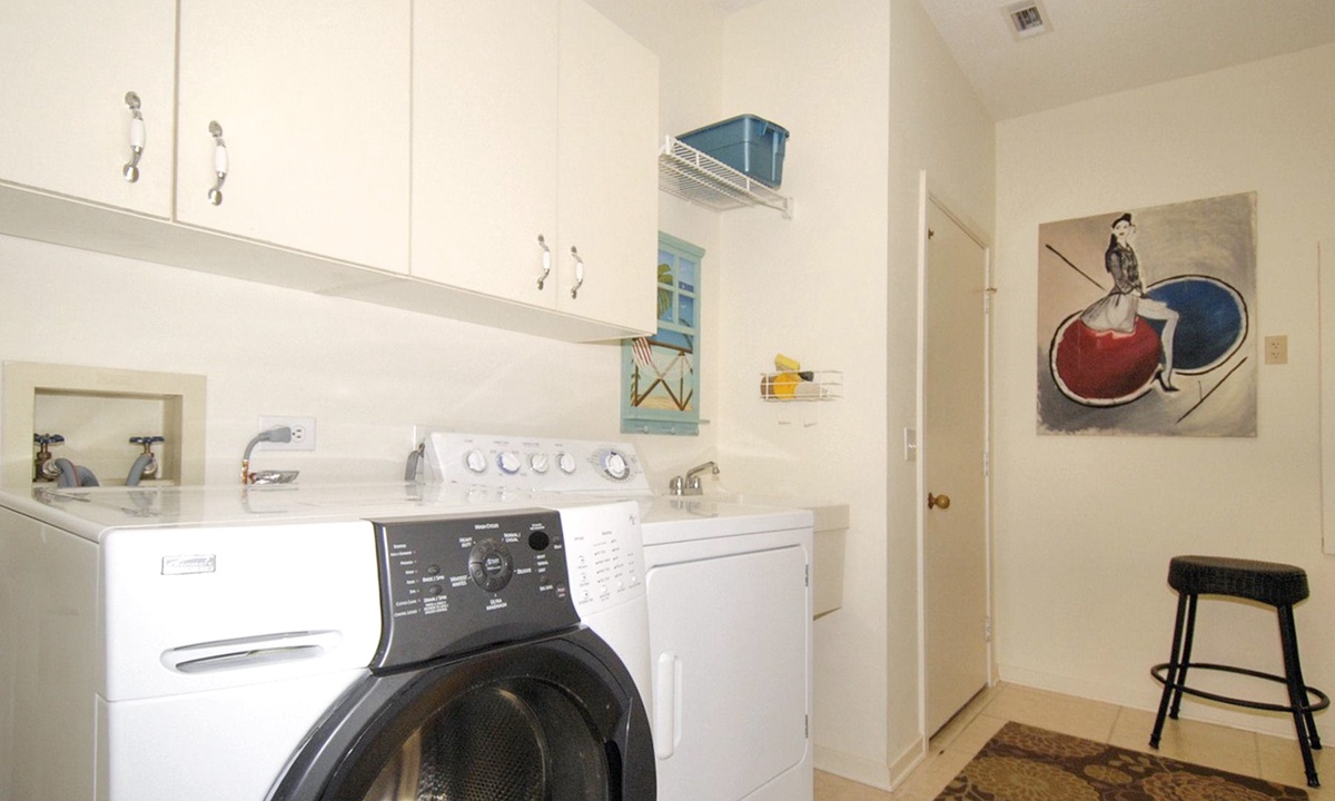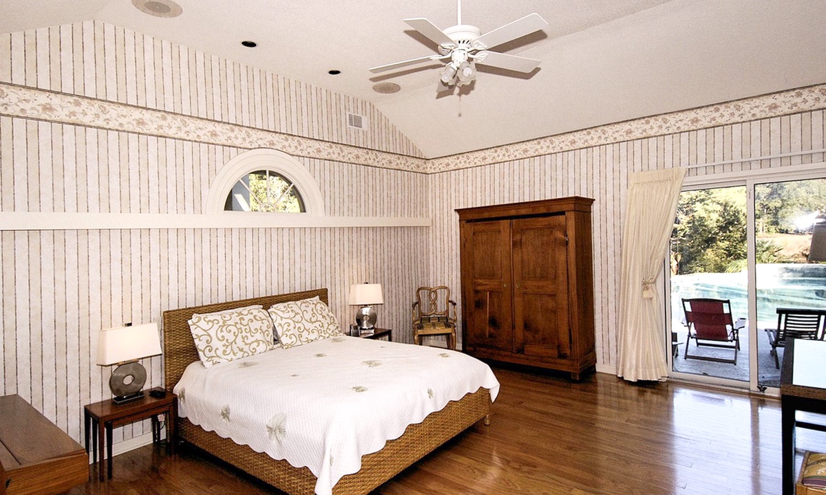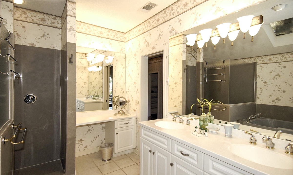 Back to the entry foyer and off to the right, a hallway leads to a full bath, a large laundry room, bedroom #1 with a king bed, a TV, and a private bath, and bedroom #2 also with 2 twin beds, as well as a lovely marble-topped antique dresser. The primary bedroom features a king-size bed, a cathedral ceiling, a large walk-in closet, an antique armoire, a TV, a large slider door opening directly to the pool deck, and a private bath with double vanities, a ladies dressing table, a spacious walk-in shower, and a skylight/moonlit spa tub.