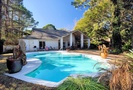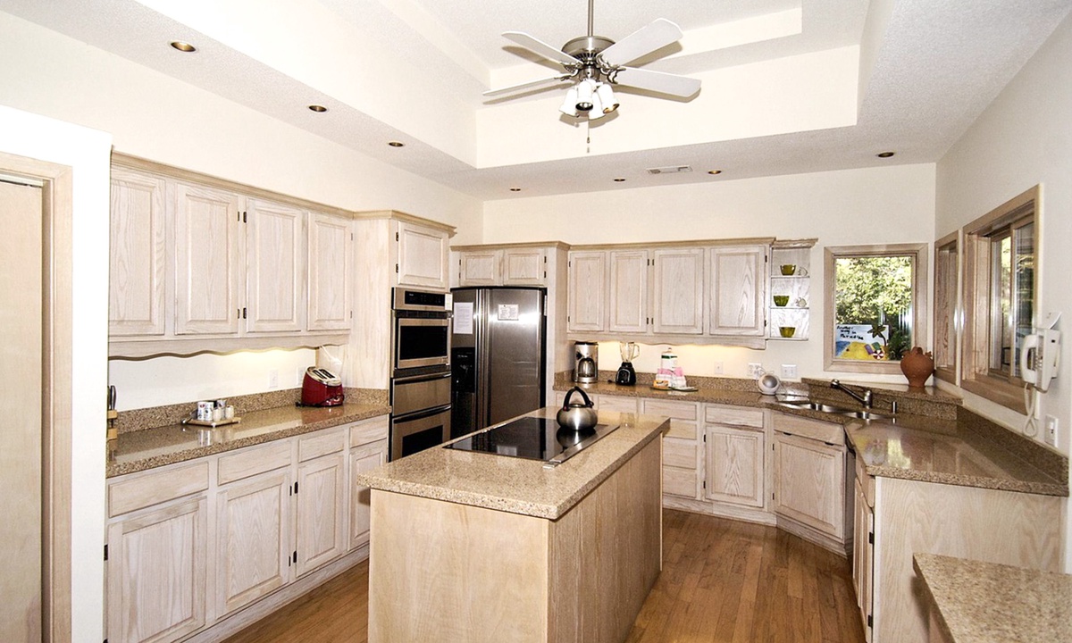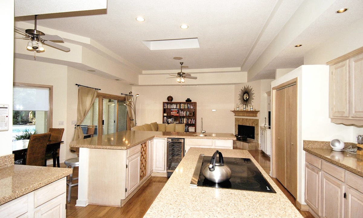 Straight through the foyer is a more contemporary great room that begins with the family room, which features an entertainment center with TV/DVD, a family-size sofa, a well-stocked bookcase, and a large slider door to a covered patio, where there is an outdoor dining table for 6 that overlooks the landscaped grounds, the large pool with a soothing waterfall, and the peaceful lagoon beyond. The breakfast area of this room has a table for 4 set in front of a sunny bay window and a side slider door that opens to the outdoor cooking area of the patio featuring both gas & charcoal grills. Last, but definitely not least, is the dream kitchen, defined by an L-shaped dining/serving/bar counter with 3 barstools, a unique bar sink, an ice maker, and a built-in wine rack. To that add all granite countertops, stainless steel appliances, a pantry closet, generous cabinetry, and direct access to the formal dining room.