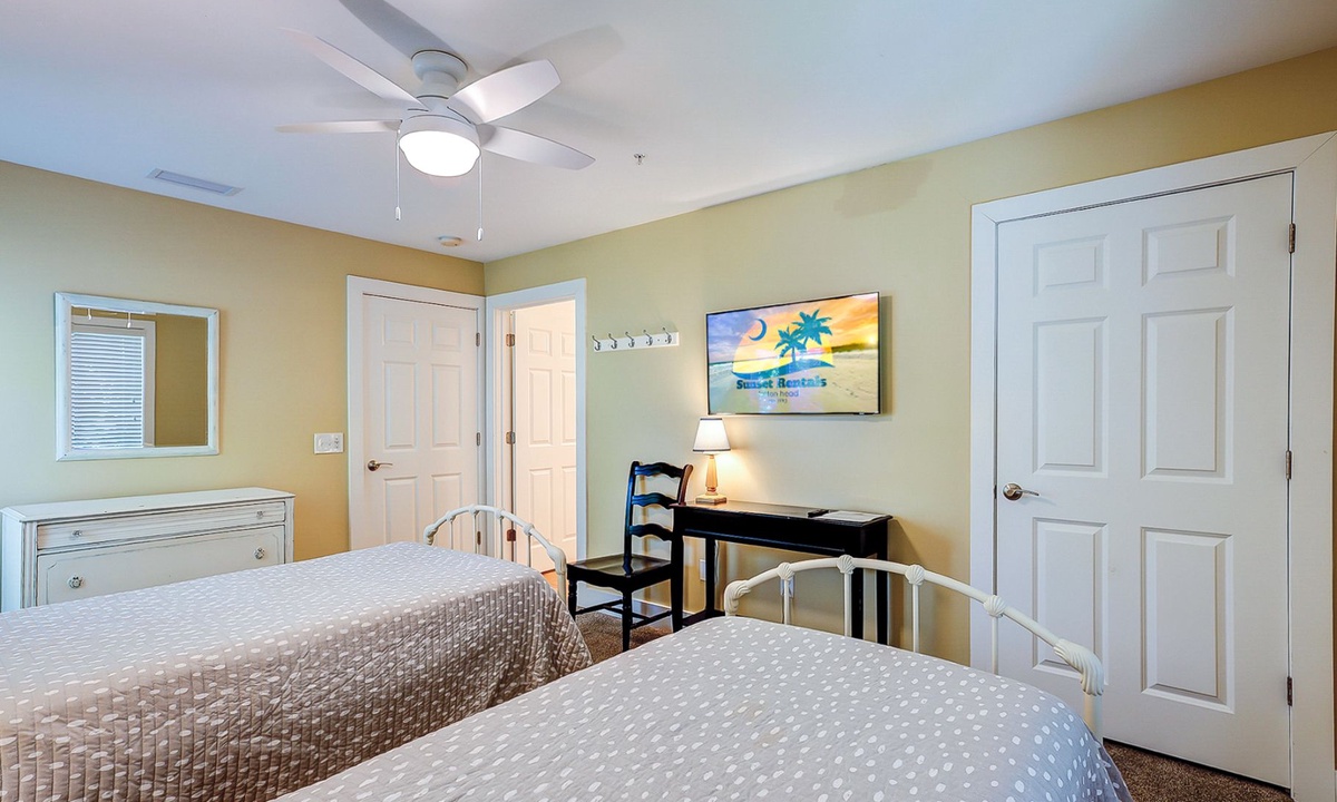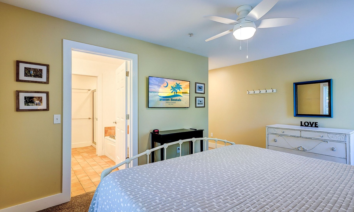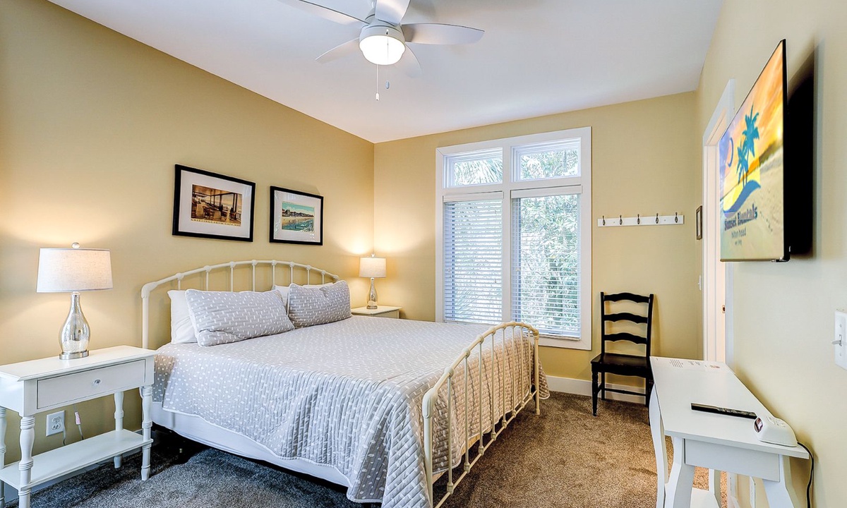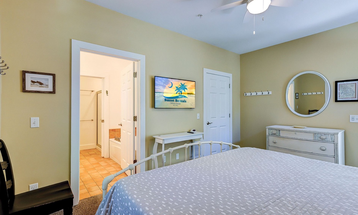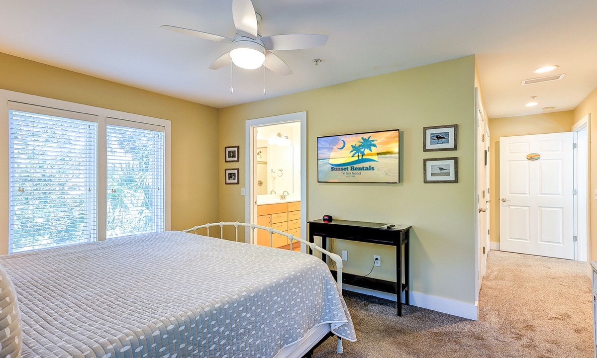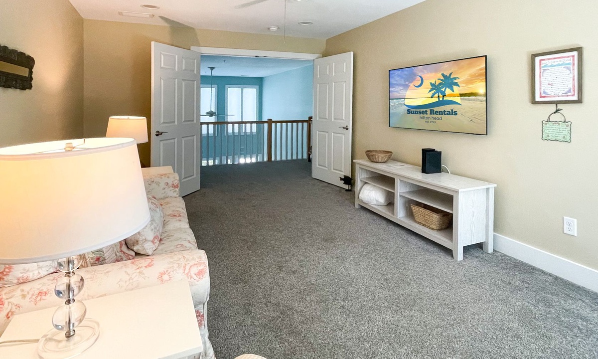 On the second floor are the remaining two bedrooms and the second living space. The first bedroom has two twin beds and shares access to the hall bathroom with a walk-in shower. The fourth bedroom has a king bed, and a private en-suite bathroom with double vanity, garden tub and walk-in shower. The second living area is perfect for gathering for movies or space for the kids! There are two addtional sleep spaces for added convenience- a queen sleeper sofa in the sunroom and a full sleeper sofa in the second floor loft area.