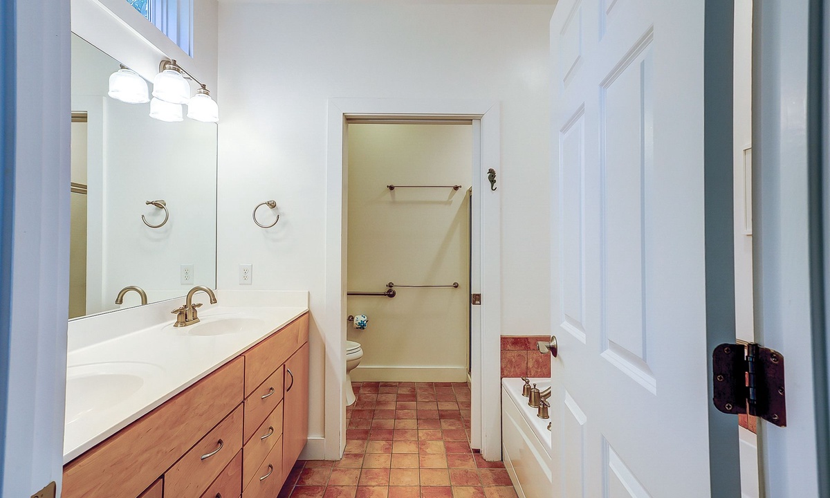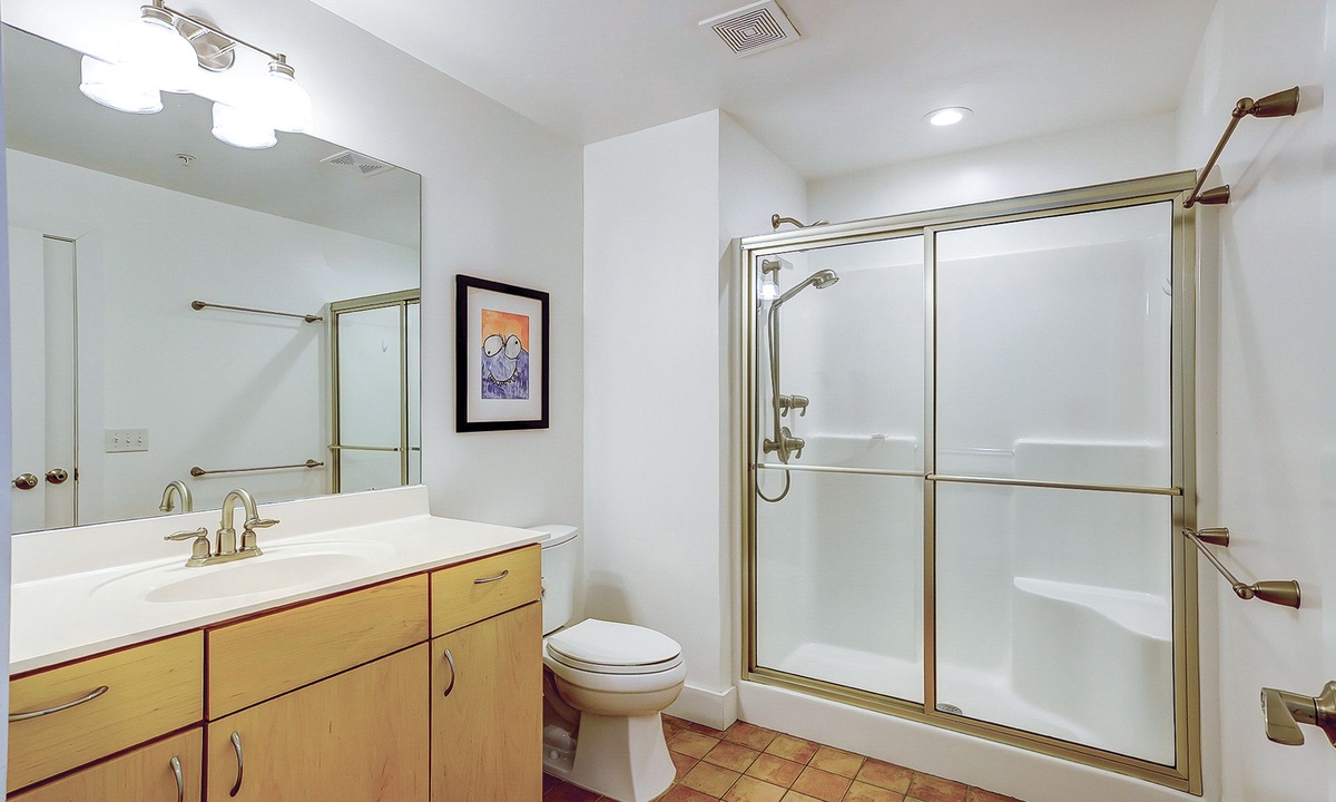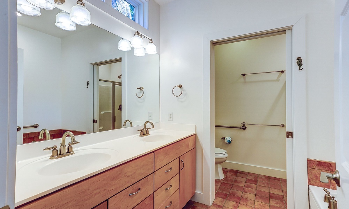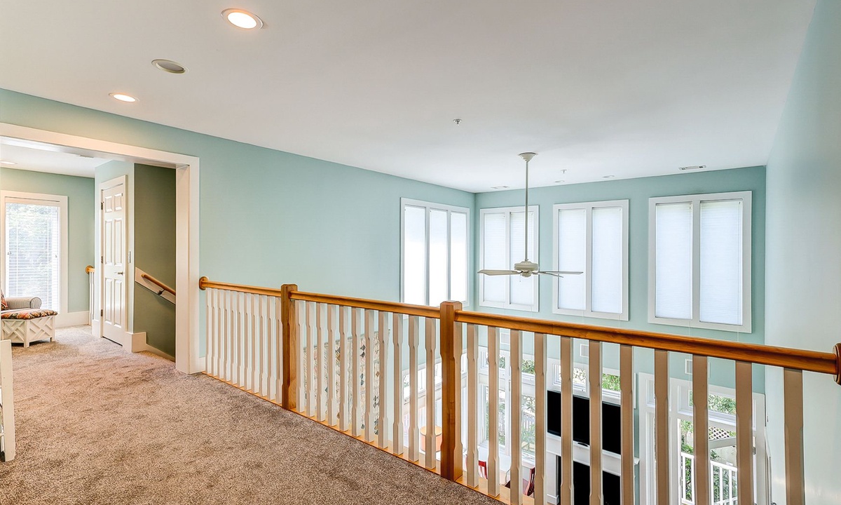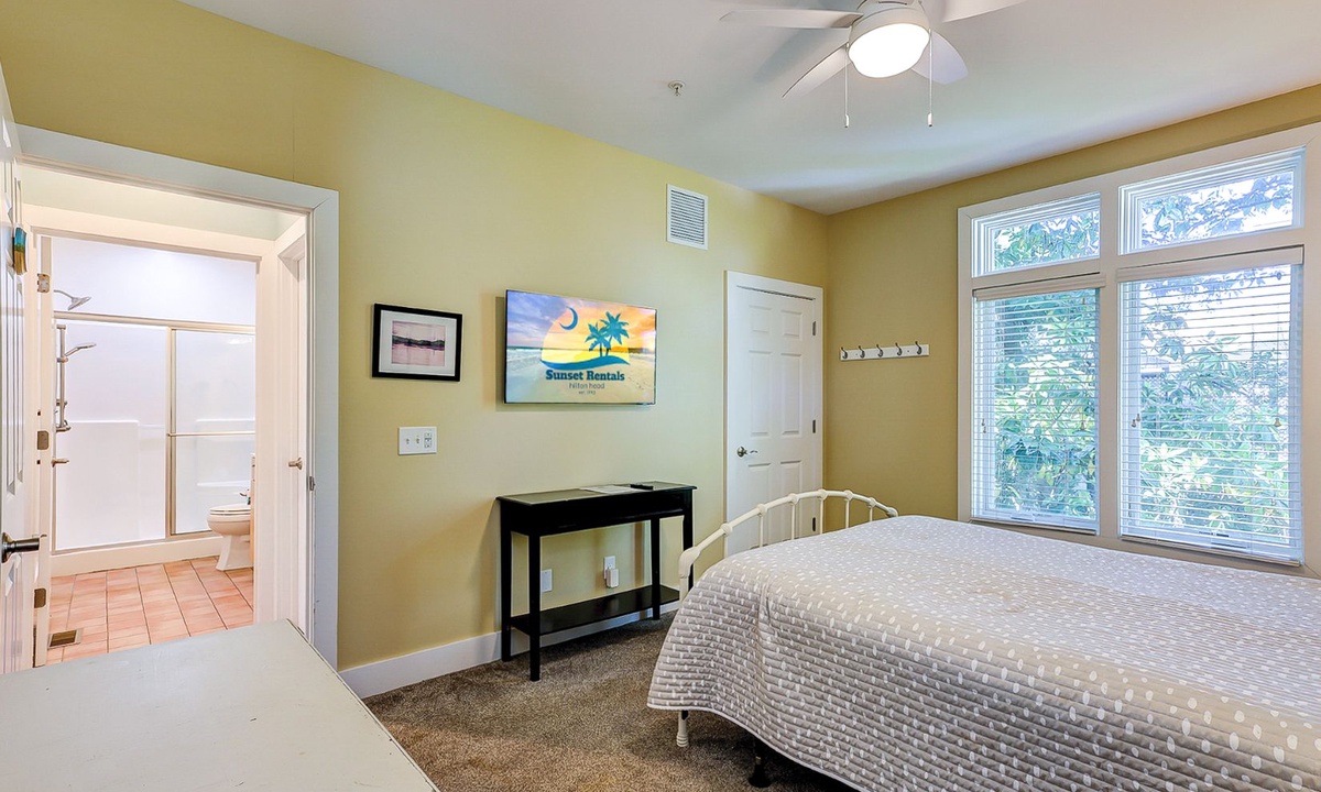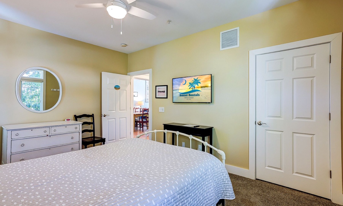 On the second floor are the remaining two bedrooms and the second living space. The first bedroom has two twin beds and shares access to the hall bathroom with a walk-in shower. The fourth bedroom has a king bed, and a private en-suite bathroom with double vanity, garden tub and walk-in shower. The second living area is perfect for gathering for movies or space for the kids! There are two addtional sleep spaces for added convenience- a queen sleeper sofa in the sunroom and a full sleeper sofa in the second floor loft area.