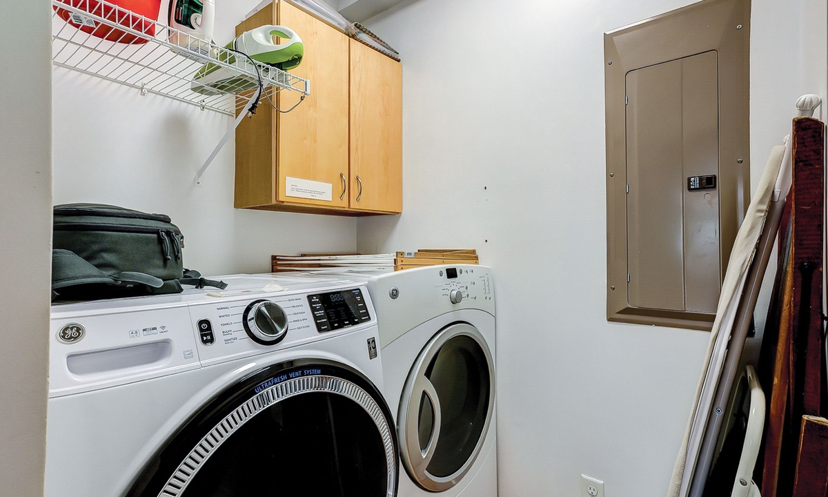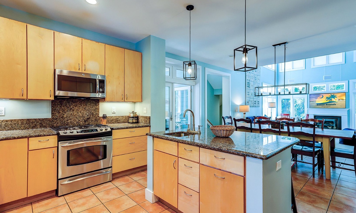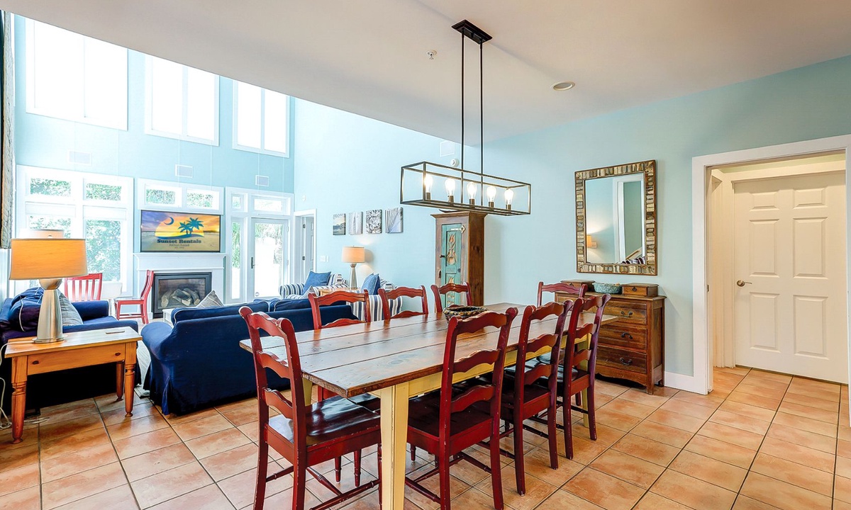 The main level of the home with living and dining areas + kitchen is located on the second floor. The living area has a wall of windows allowing for natural light and an open floor plan so the group can commune over meals and family fun! **Fireplace is not for guest use.** The fully-equipped kitchen is open to the dining and living areas and is well-appointed with cooking utensils and supplies.