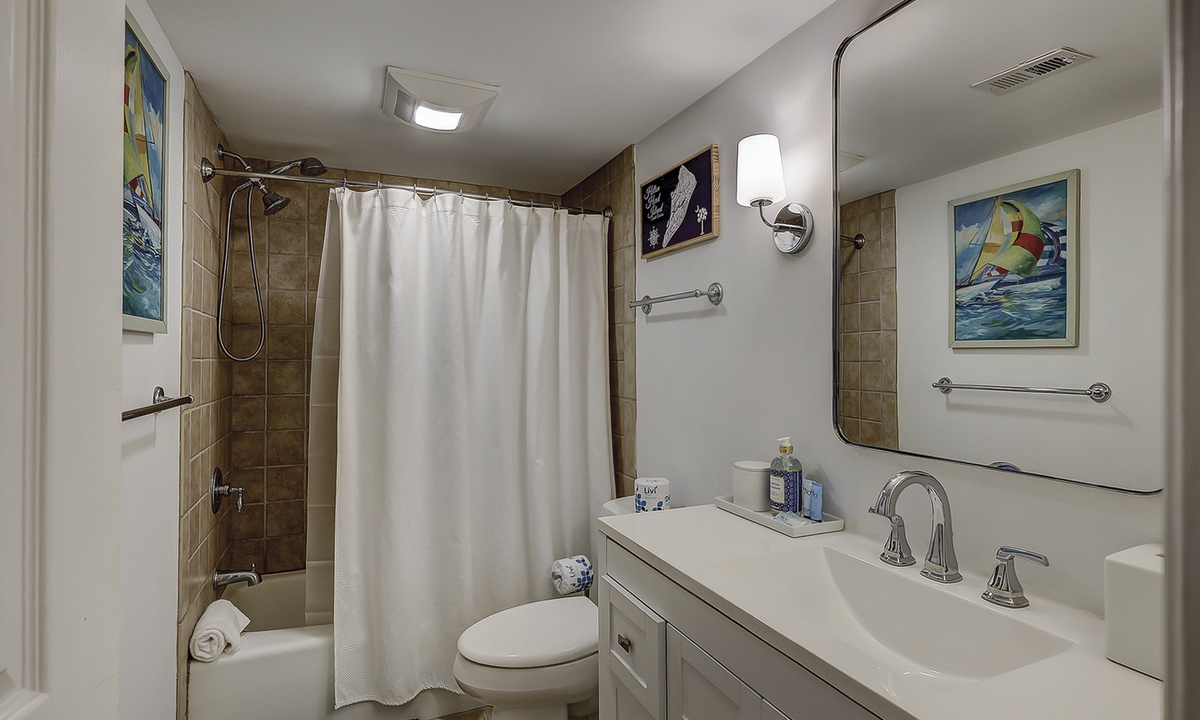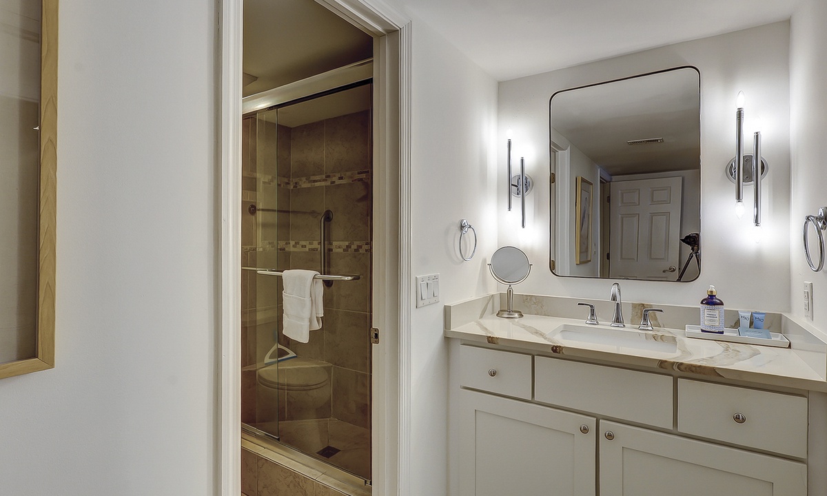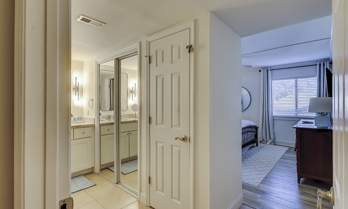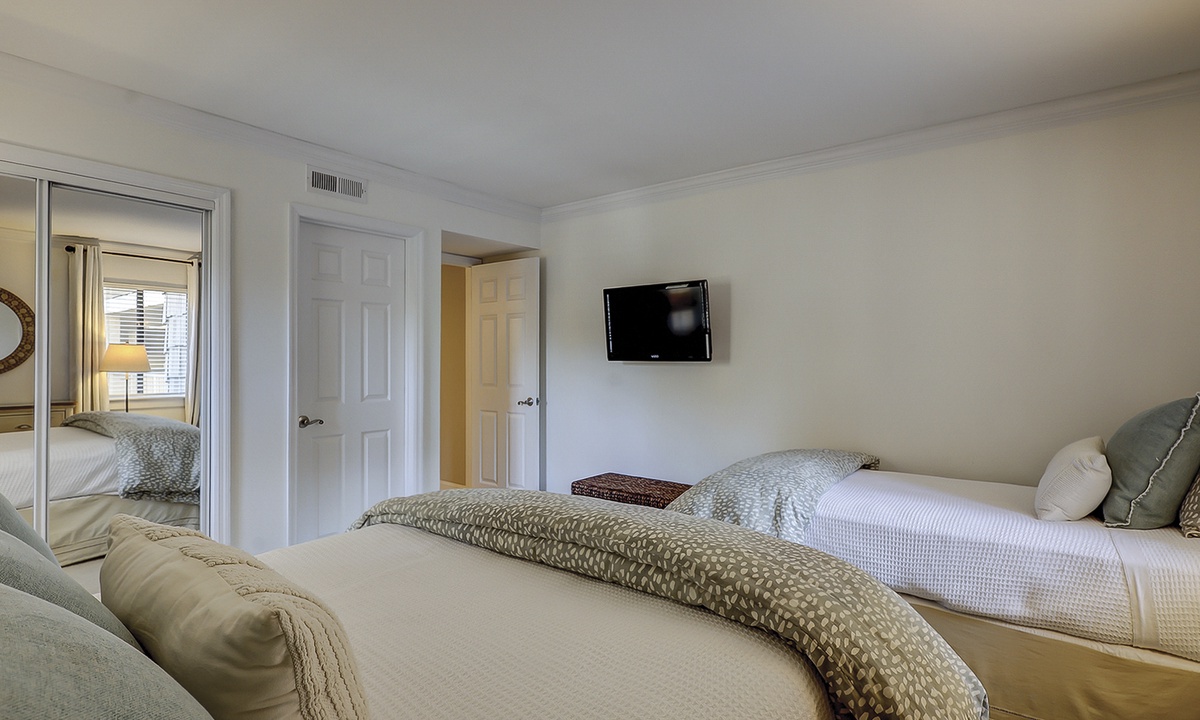 The guest bedroom features a queen bed and a twin bed, a wall-mounted Smart TV and access to a hall bathroom with a tub/shower combination. Both bedrooms have plenty of storage with ample hangers.